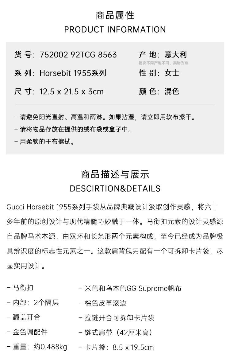 GUCCI 古驰 女士 Horsebit 1955系列 小号单肩背包 混色 752002 92TCG 8563