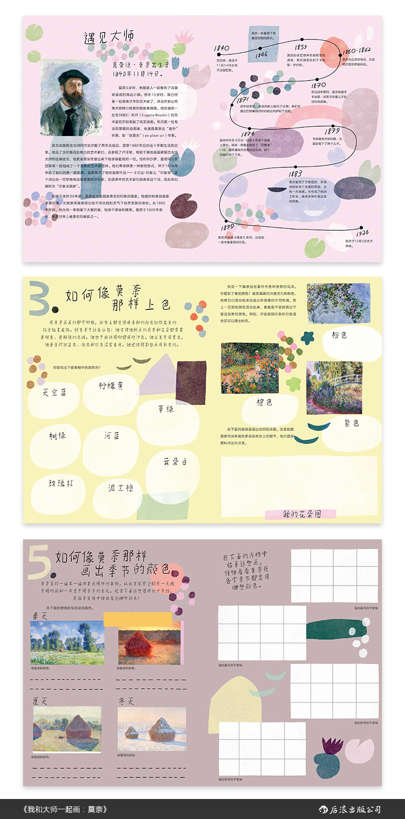 作者会先用一章的内容介绍莫奈的生平,还用时间轴展示了他一生中的大事年表。这会拉近我们和艺术家的距离,帮助我们了解他的创作灵感来源,他的绘画特色和艺术理念。我们也可以像莫奈那样在露天创作。