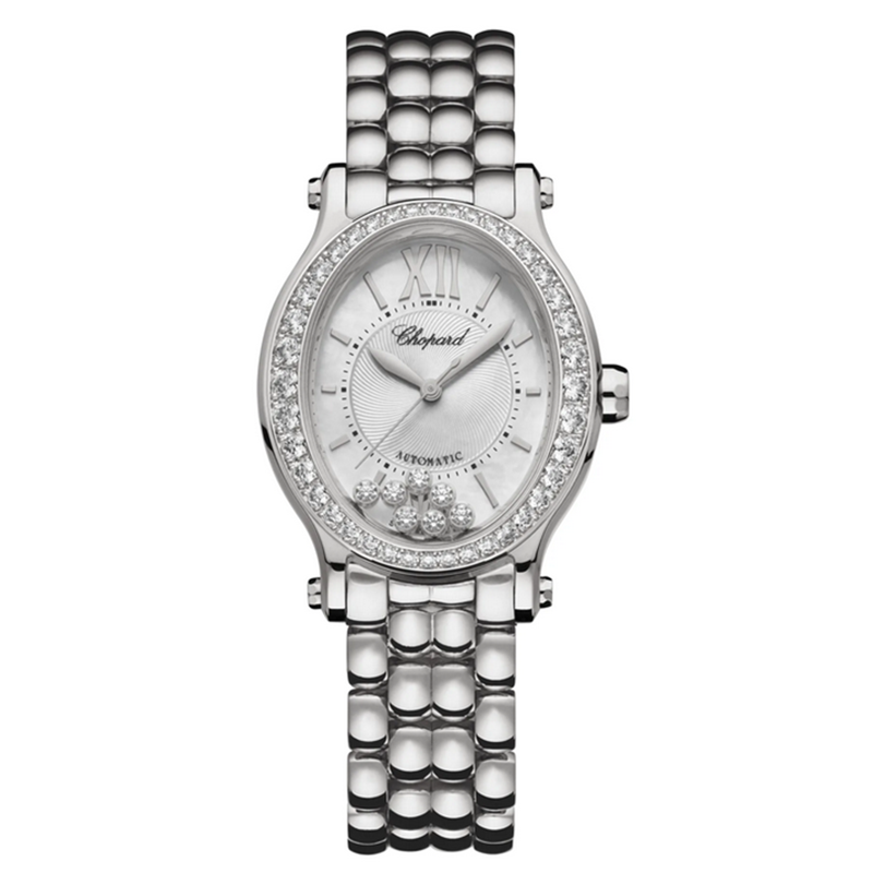 镜面材质 | 蓝宝石水晶玻璃 | 表盘 | 精钢椭圆形表壳 镶钻表圈 银色与玑镂纹饰表盘罗马文及条形时标 7钻-钻石1.42克拉 透底,开放式表底盖通过螺丝固定,带有Happy Sport标志和防眩光蓝宝石水晶镜面 |
