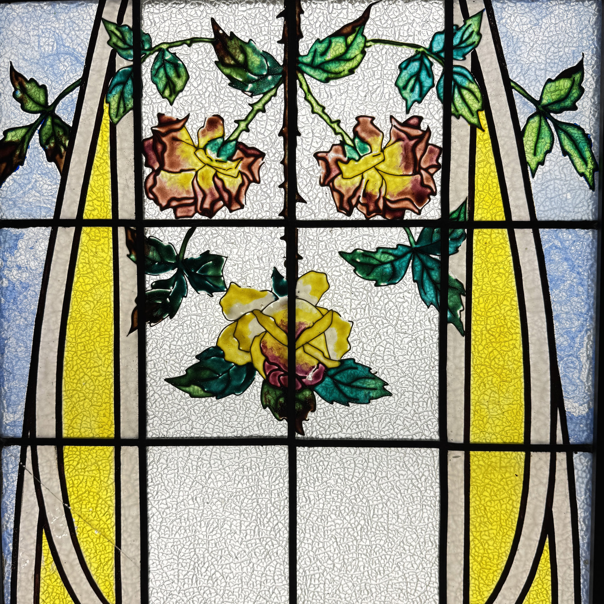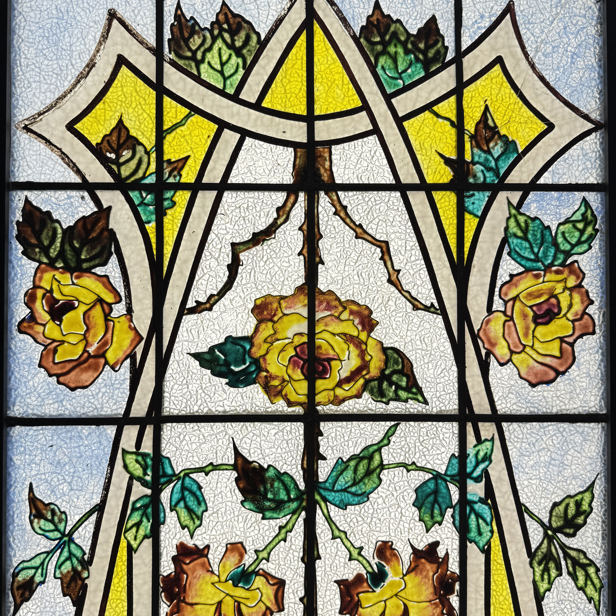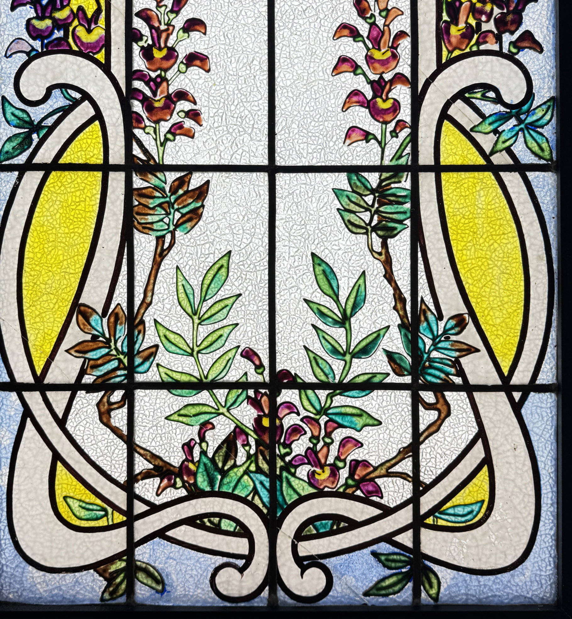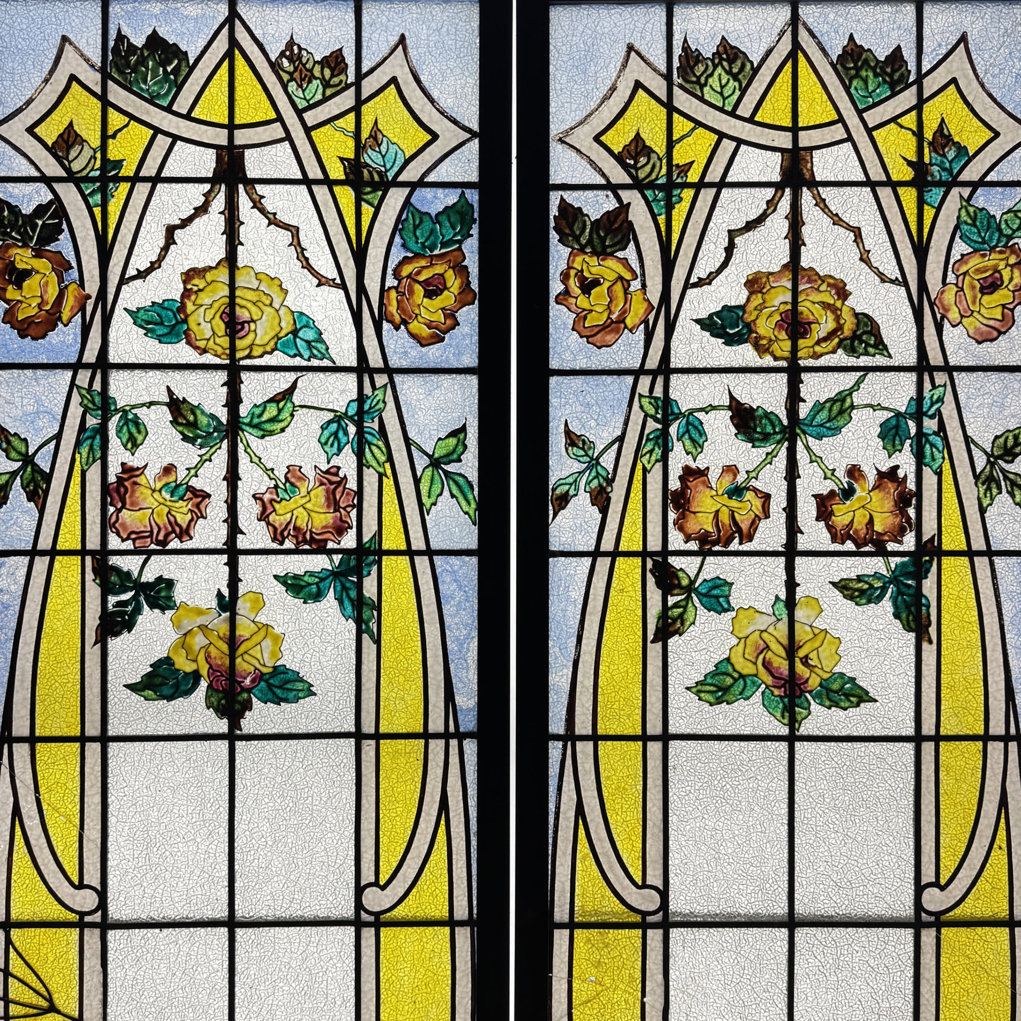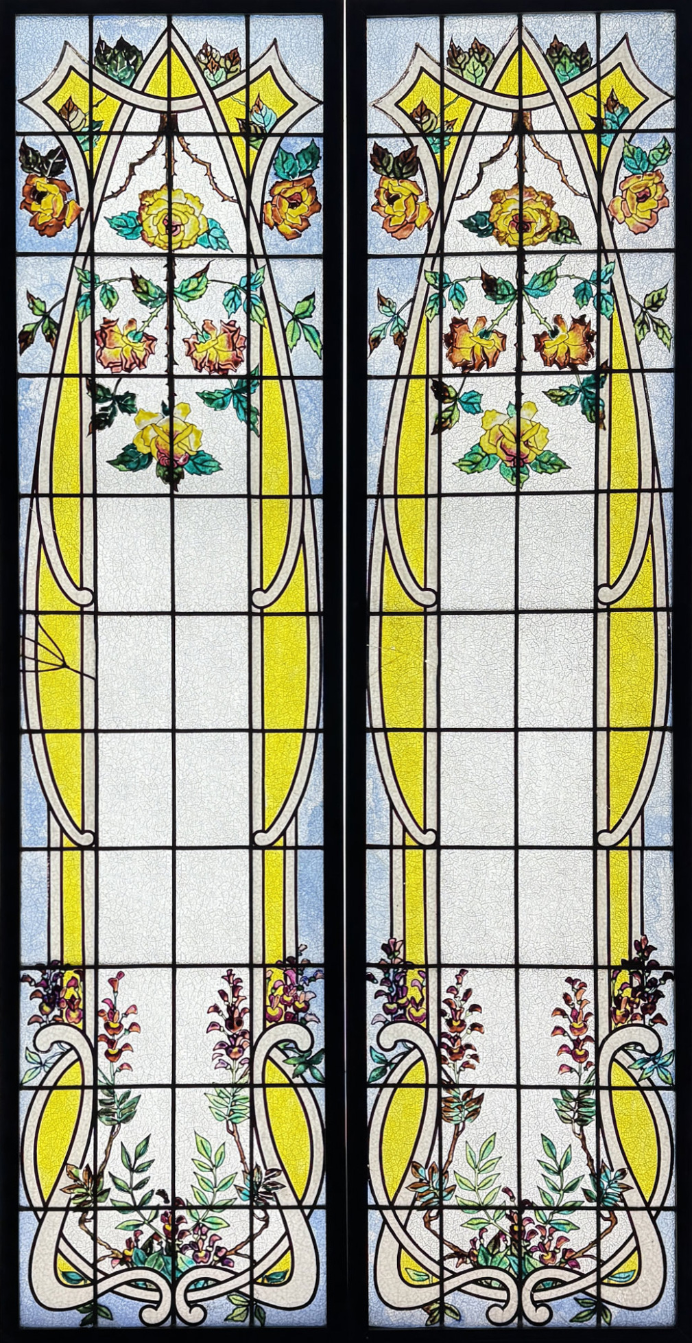 1900年代法国出品新艺术风格叶蔓繁花主题彩绘玻璃花窗一对