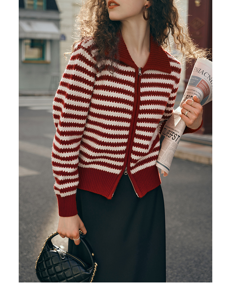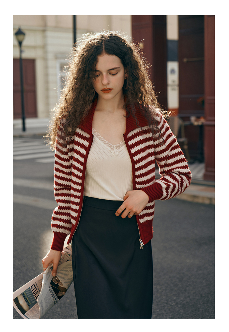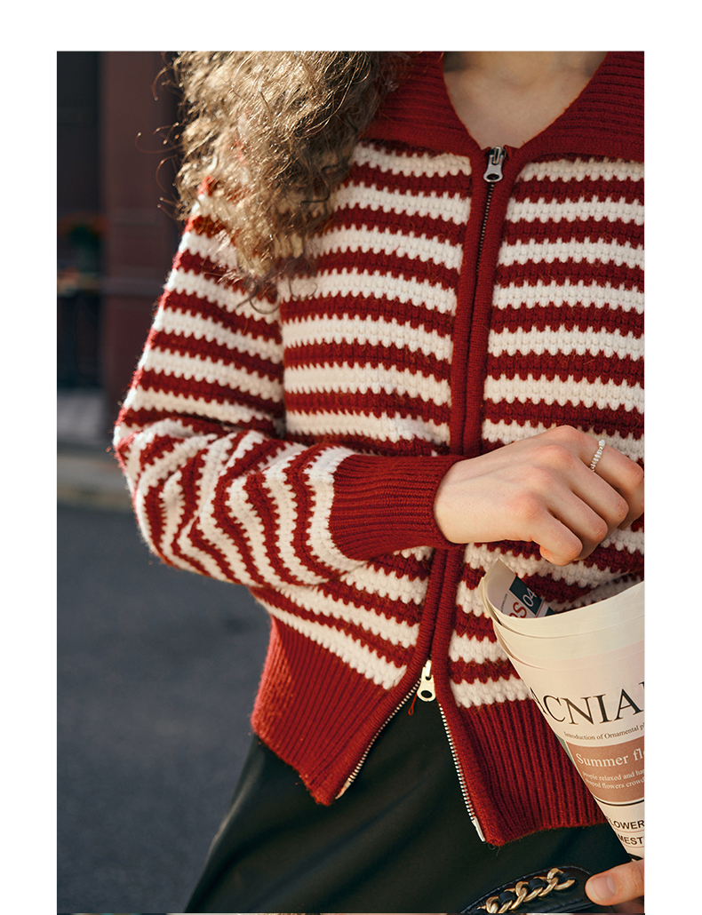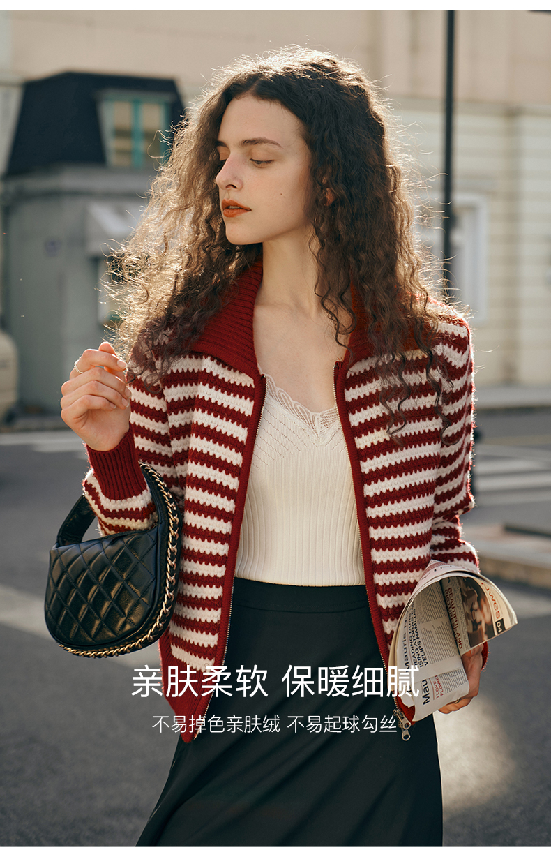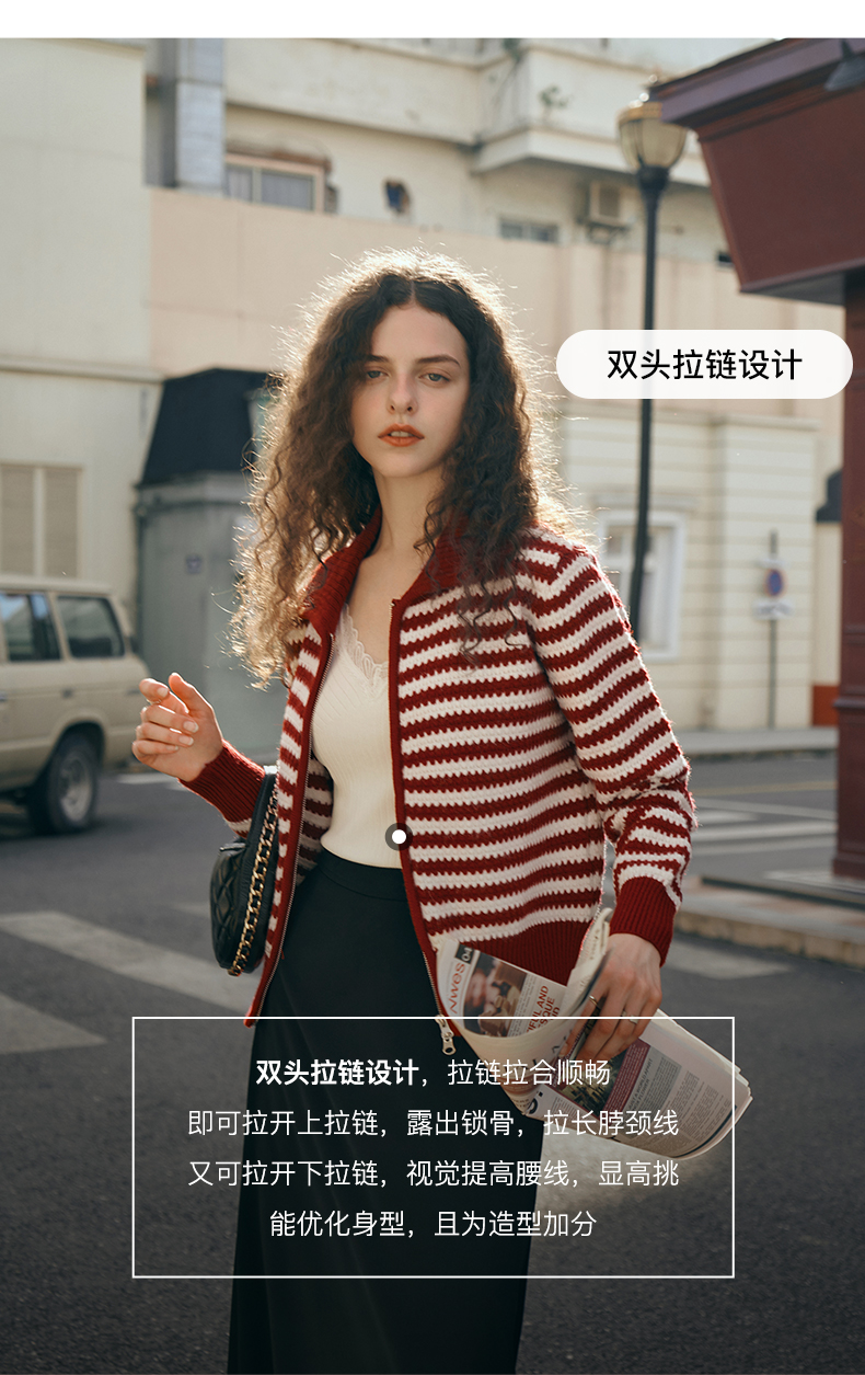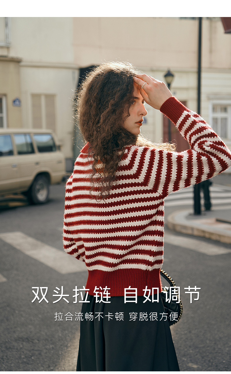 OLrain欧芮儿条纹翻领针织开衫女秋冬2023新款拉链肌理感毛衣外套