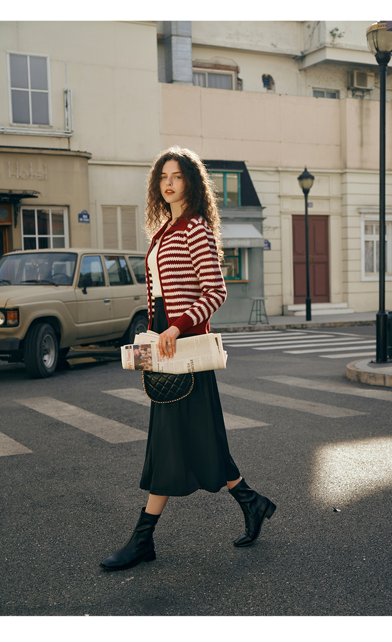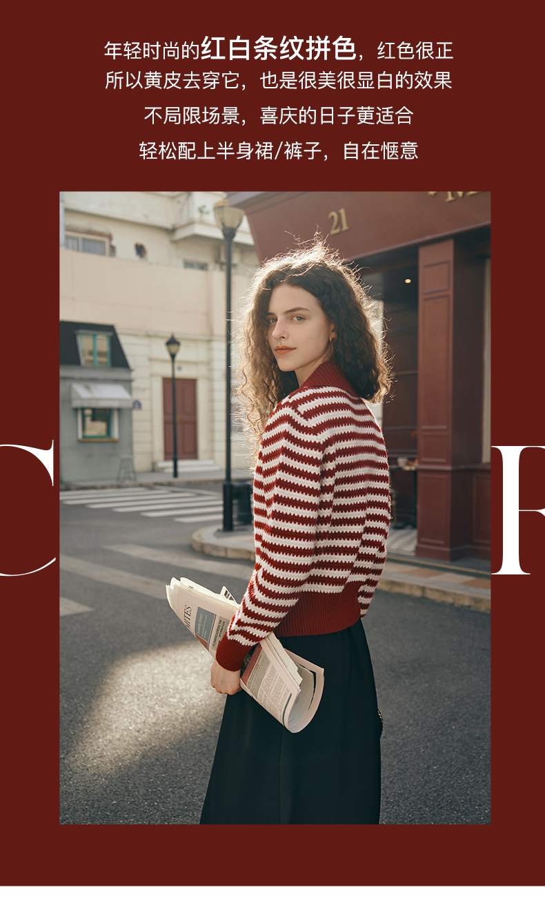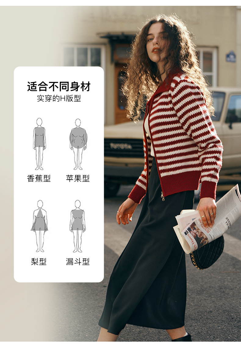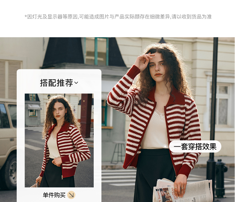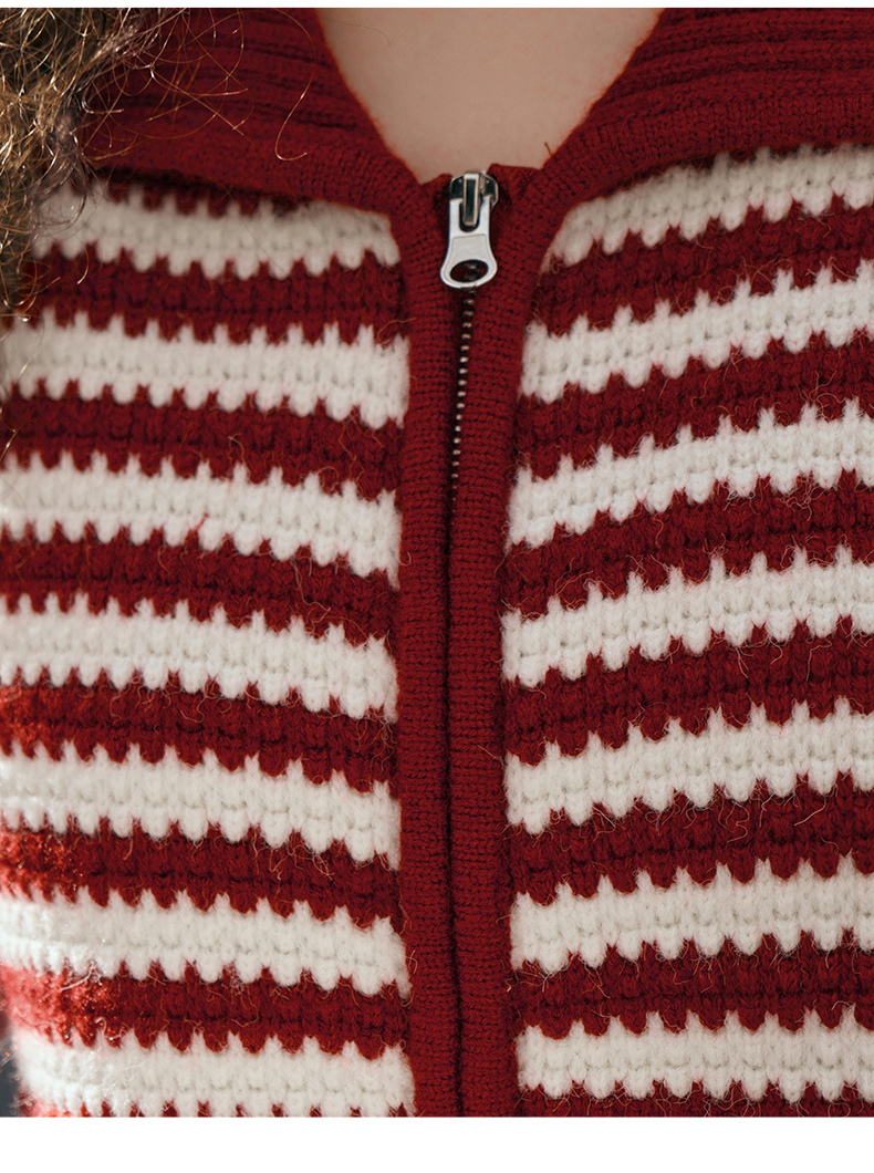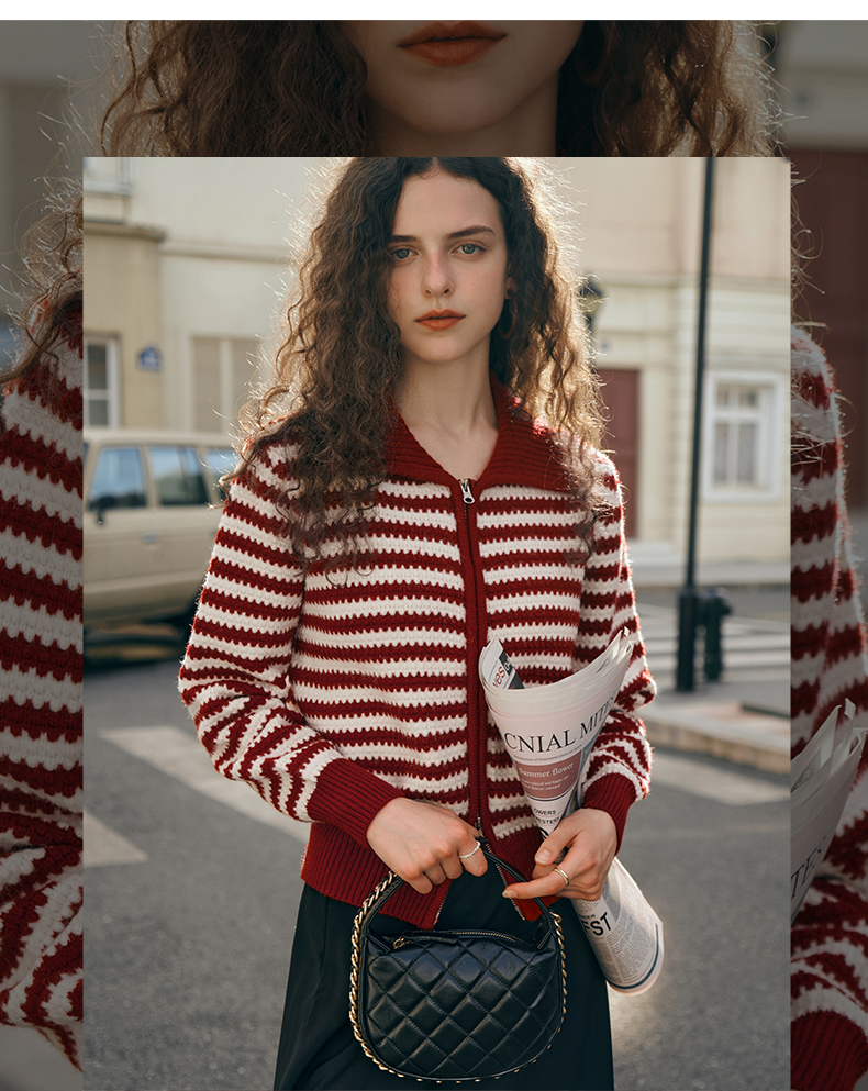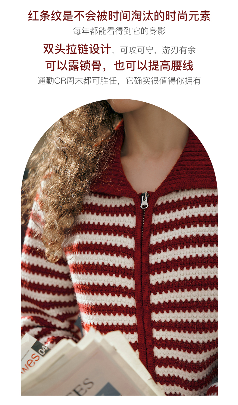 OLrain欧芮儿条纹翻领针织开衫女秋冬2023新款拉链肌理感毛衣外套