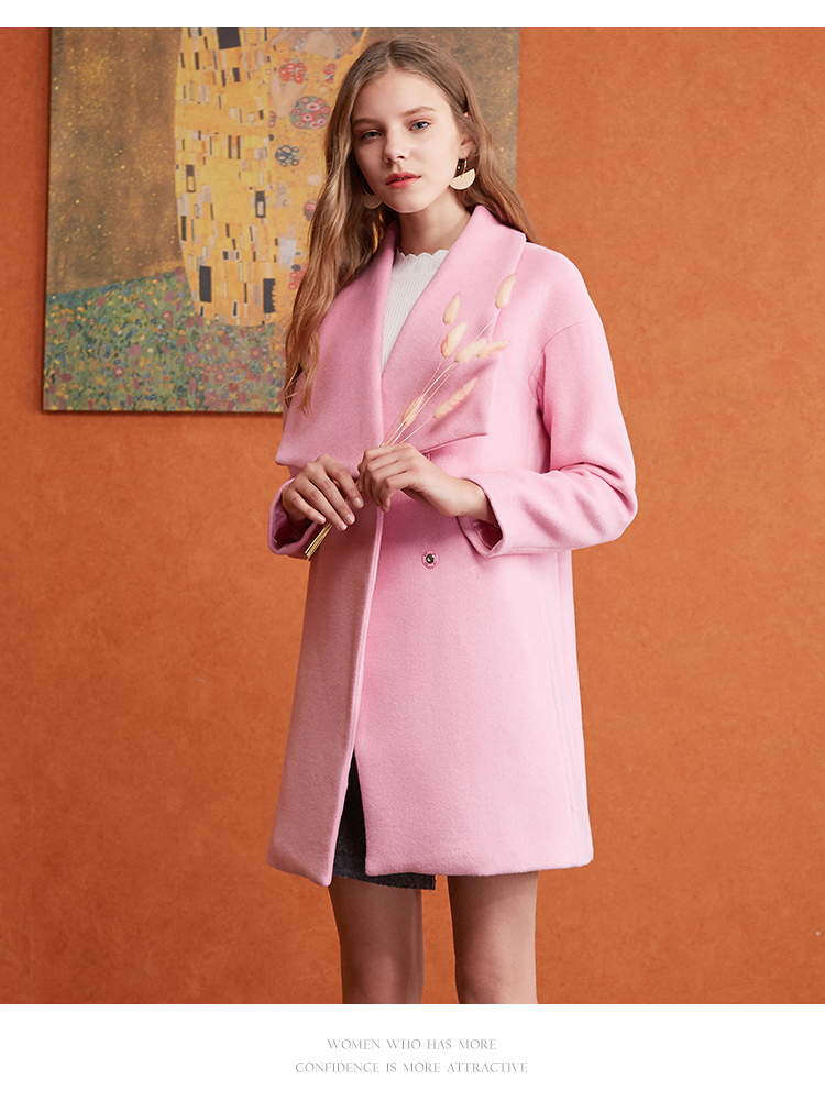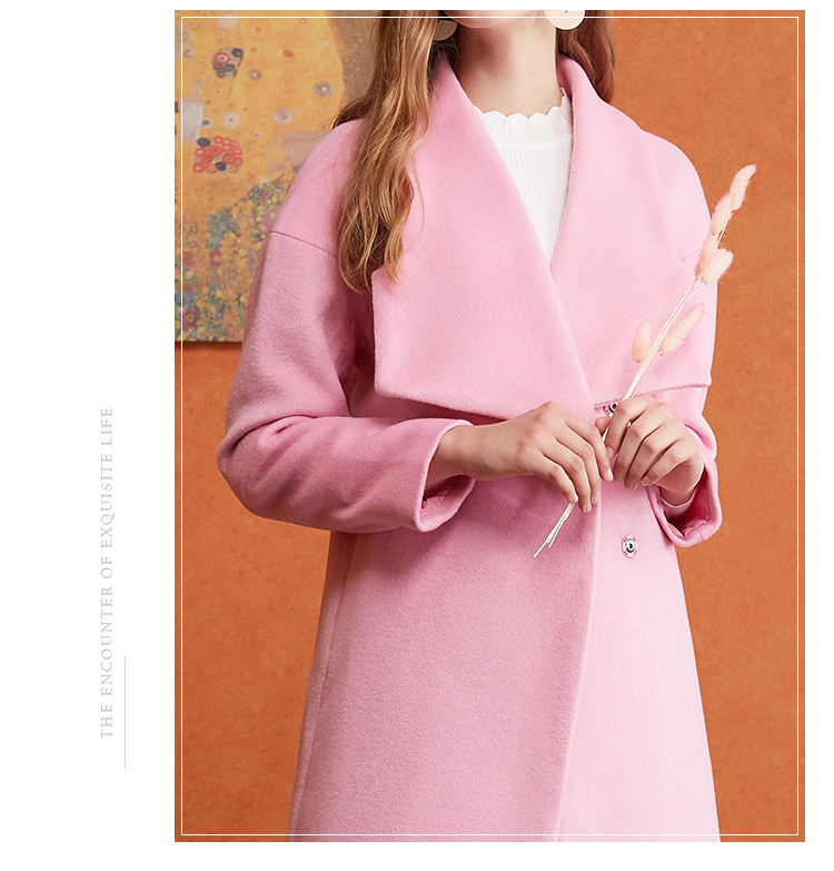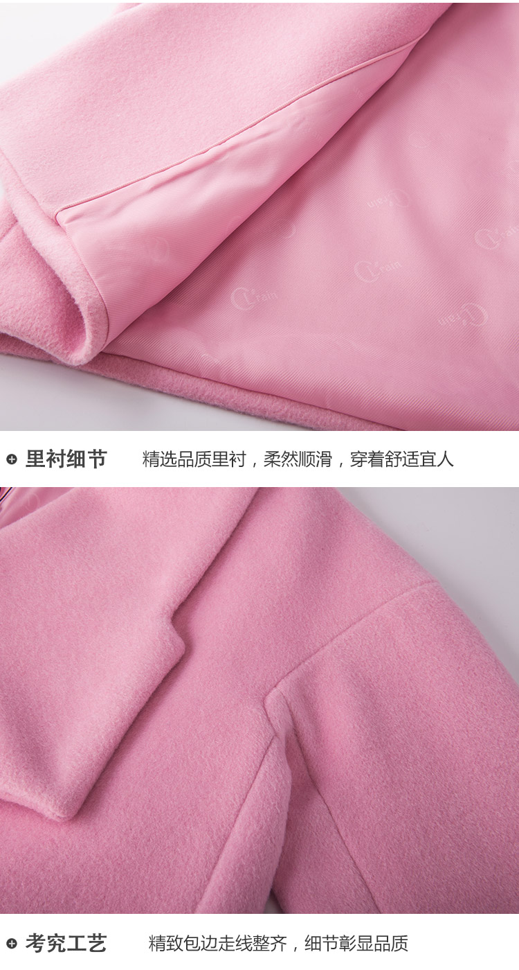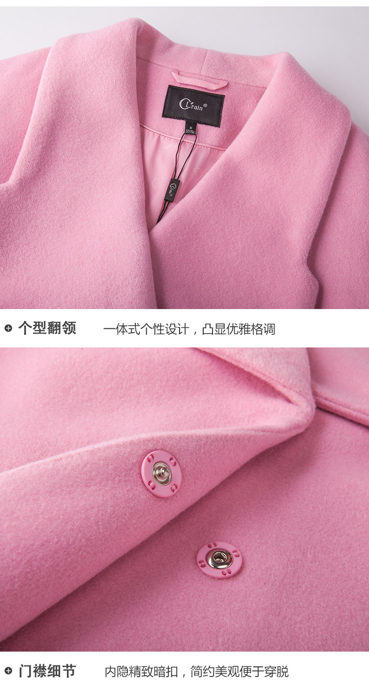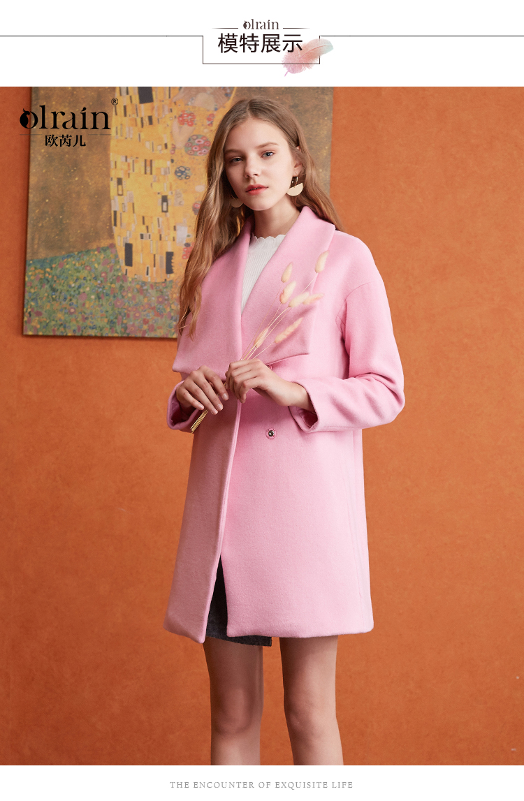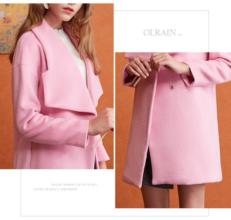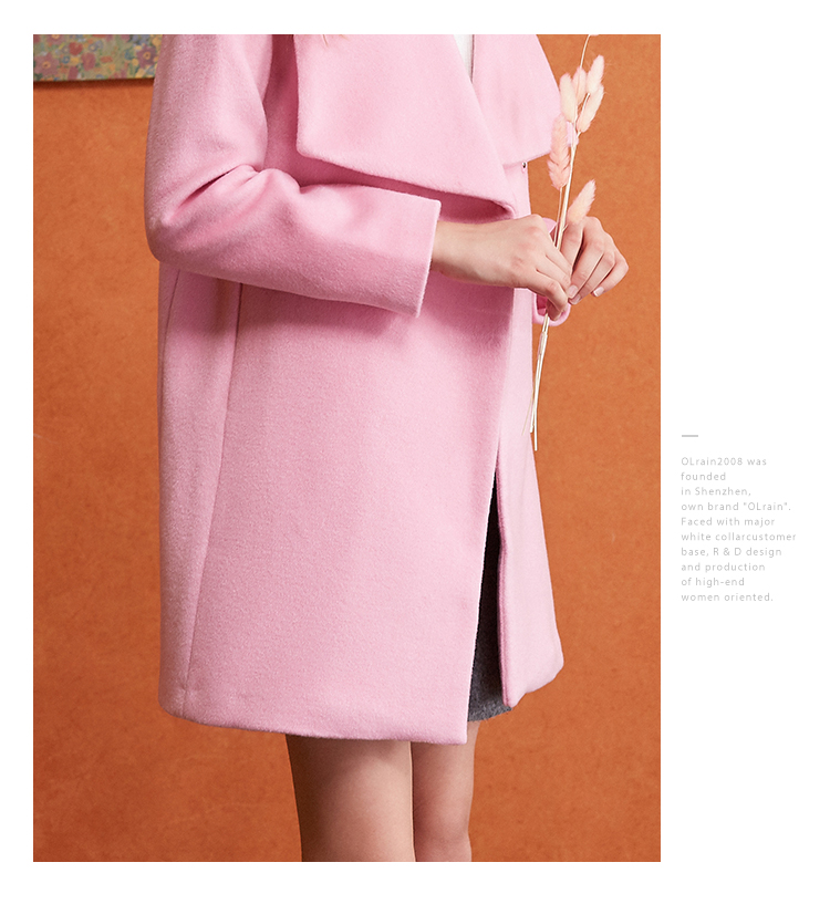 欧芮儿2017冬装新款玫红色翻领毛呢外套女中长