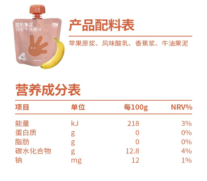 方广婴幼儿苹果泥/香蕉苹果泥/西梅香蕉泥/百香果胡萝卜南瓜/火龙果羽衣甘蓝泥FAG-945693/FAG-945716/FAG-946362/FAG-946393/FAG-945723