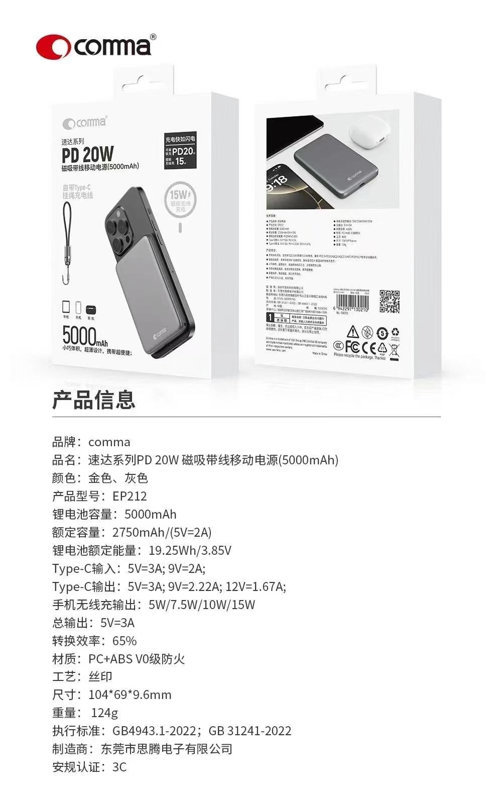 comma 速达系列PD 20W 磁吸带线移动电源(5000mAh/10000mAh))