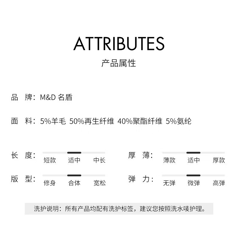 | 版型: 标准型 | 材质: 羊毛5%,再生纤维素纤维50%,醋纤(醋酯纤维)40%,氨纶(聚氨酯弹性纤维)5% |