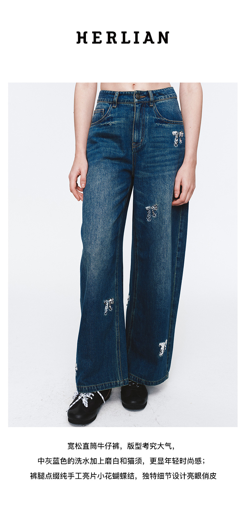 H2ESPAB080BL蝴蝶结钻饰设计宽松阔腿牛仔裤