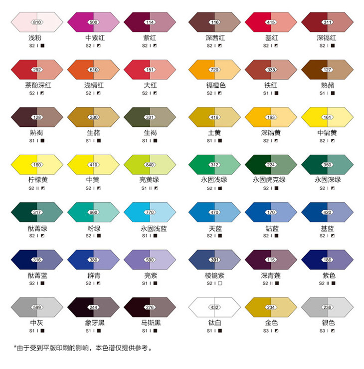 系列2: 浅粉 镉橙色 粉绿 浅镉红 中紫红 天蓝 基蓝 基红 中黄 棱镜紫 群青 永固深绿 酞青绿 酞青蓝 永固浅绿 深镉红 萘酚深红 永固虎克 紫色 钴蓝 深铬黄 中铬黄 柠檬黄 大红 深茜红 青莲 紫红