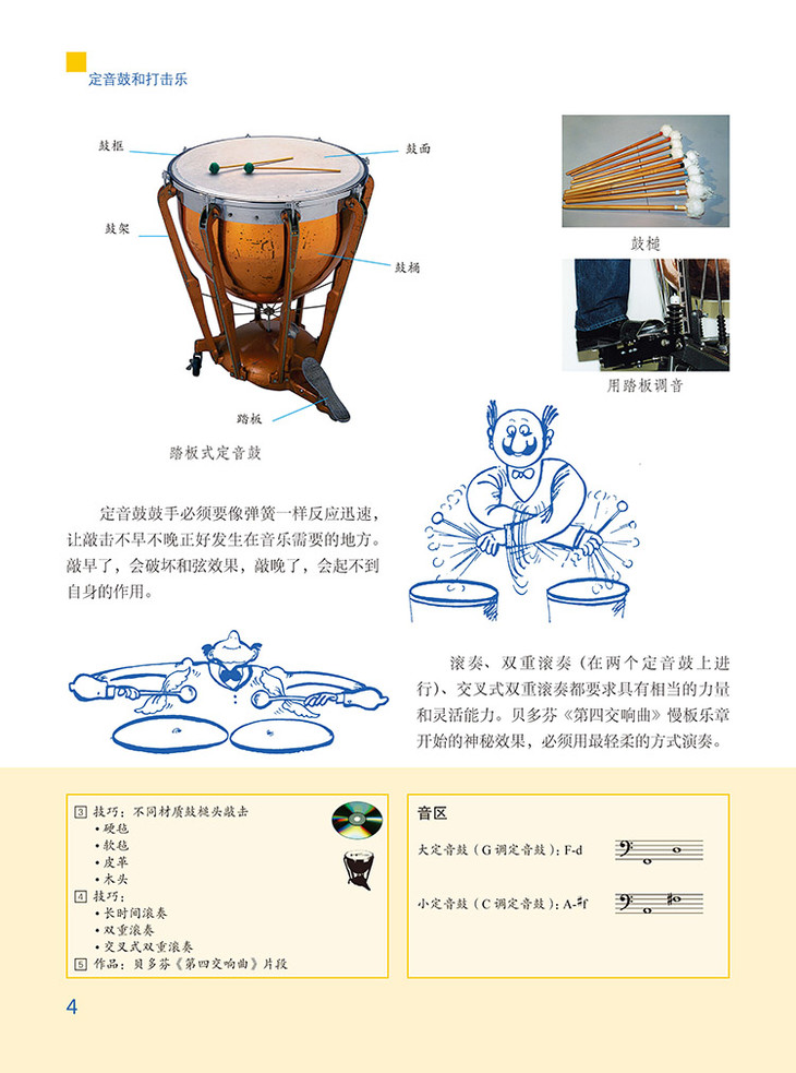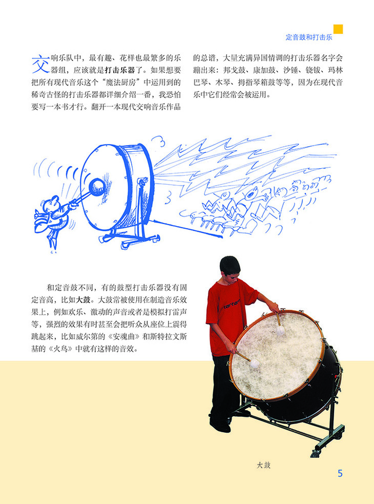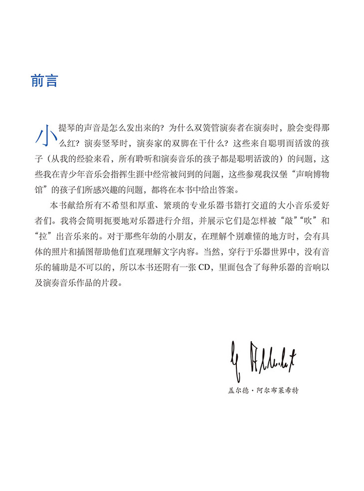 “打击乐器组可以被比喻成‘魔法厨房’。正像一个厨艺非凡的厨师用娴熟的手法将各种风味的调料精心分配后,可以为我们带来美味的珍飨一样,打击乐器演奏家也可以用他专业熟练的技法为我们的耳朵带来味道十足的听觉享受。”盖尔德·阿尔布莱希特在《交响乐队乐器图典(附光盘原版引进)(精)》这本书中用如此形象的语言为大小读者们讲解有关交响乐队乐器的知识,这些内容生动有趣,发人深思。书中内容包括每种乐器的:发展史,构造特点,音色和音域,发音和演奏方式,讲解详尽实用,通俗易懂。书中配有大量照片和插图,读者可以通过照片对乐器的形态和演奏方式有直观的了解,更可以通过极具启发意义的趣味插图开动脑筋,展开联想。说来说去,这些乐器演奏时是怎样的声音?每种乐器只能发出一种声音它们在真正的音乐作品中是怎样使用的呢?随书附赠的CD可以告诉你这些问题的答案。看过这本书,不要忘了再去音乐厅听一听交响乐演出,你一定会惊喜地发现自己能够等。