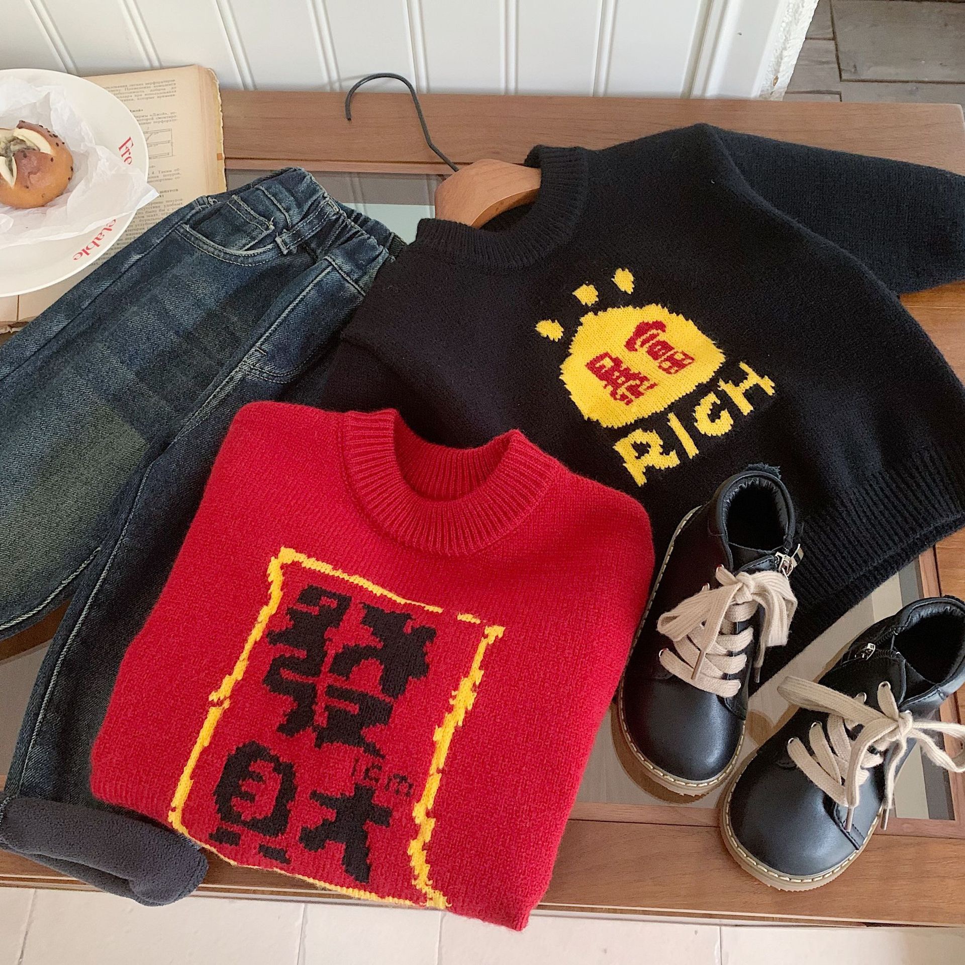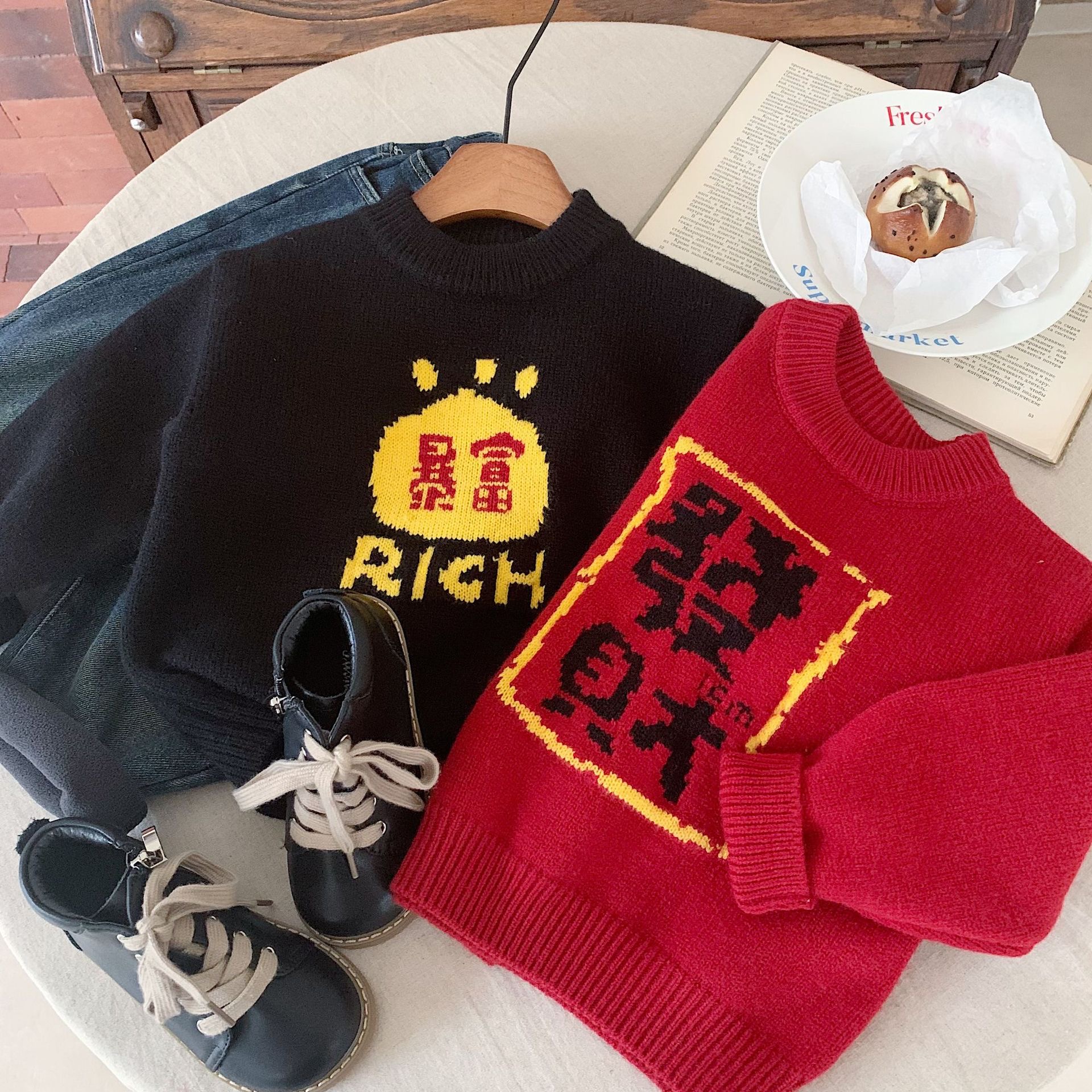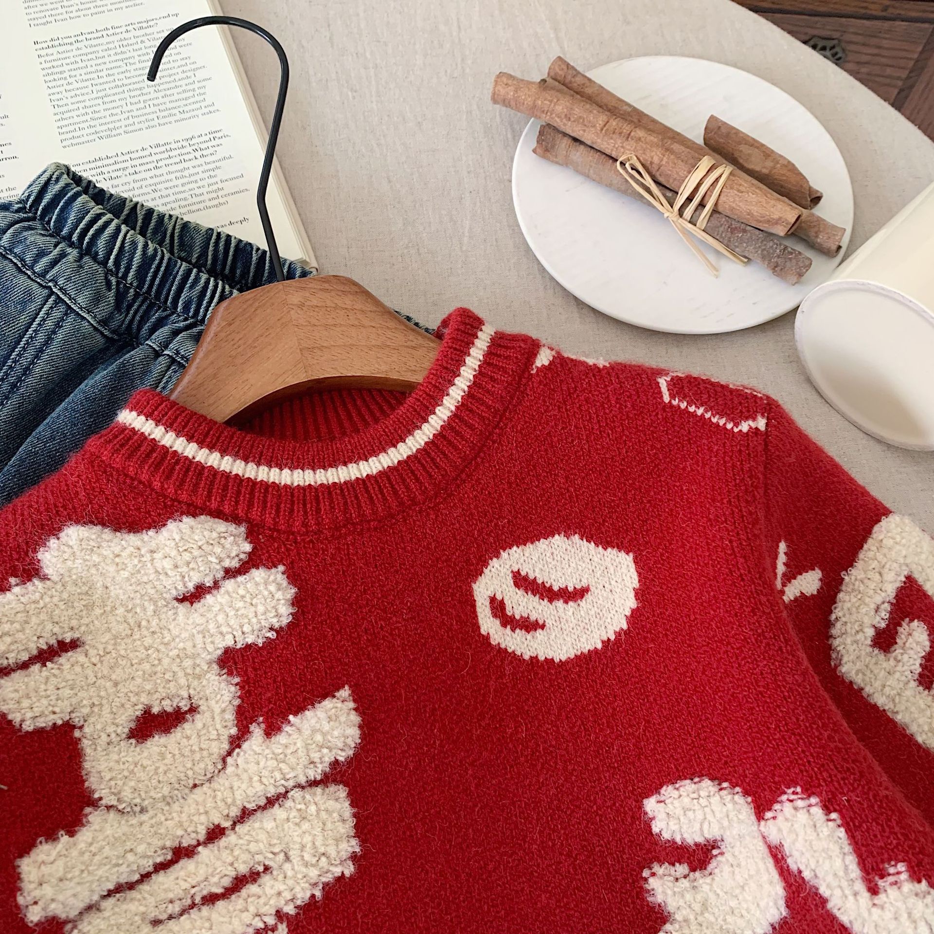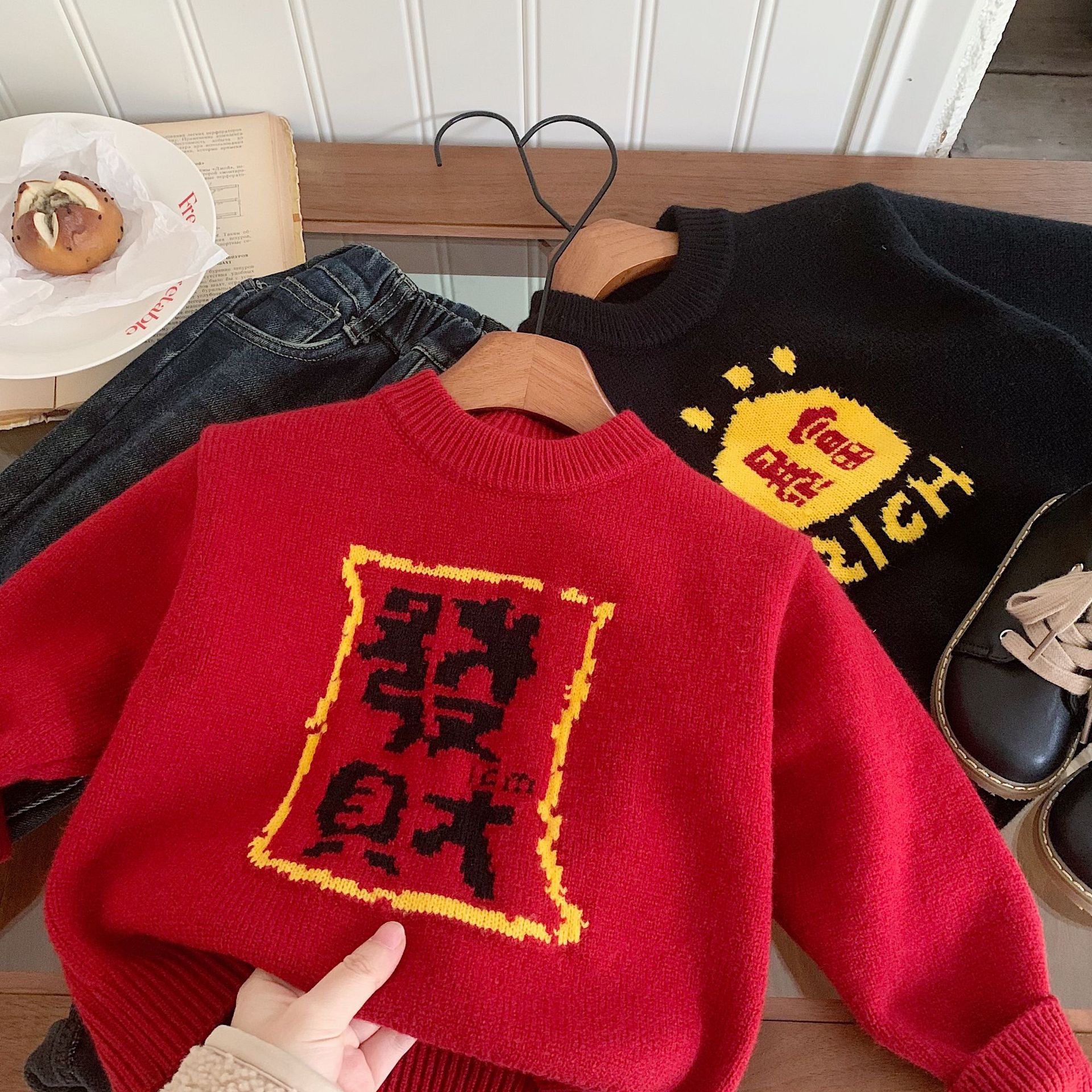 【YW】无忧购男女童印花刺绣喜庆新年恭喜发财套头针织衫年服(截单后7天发货)25年清仓捡漏