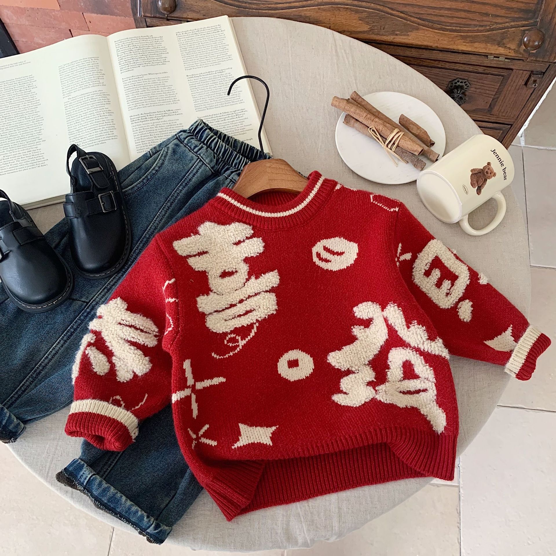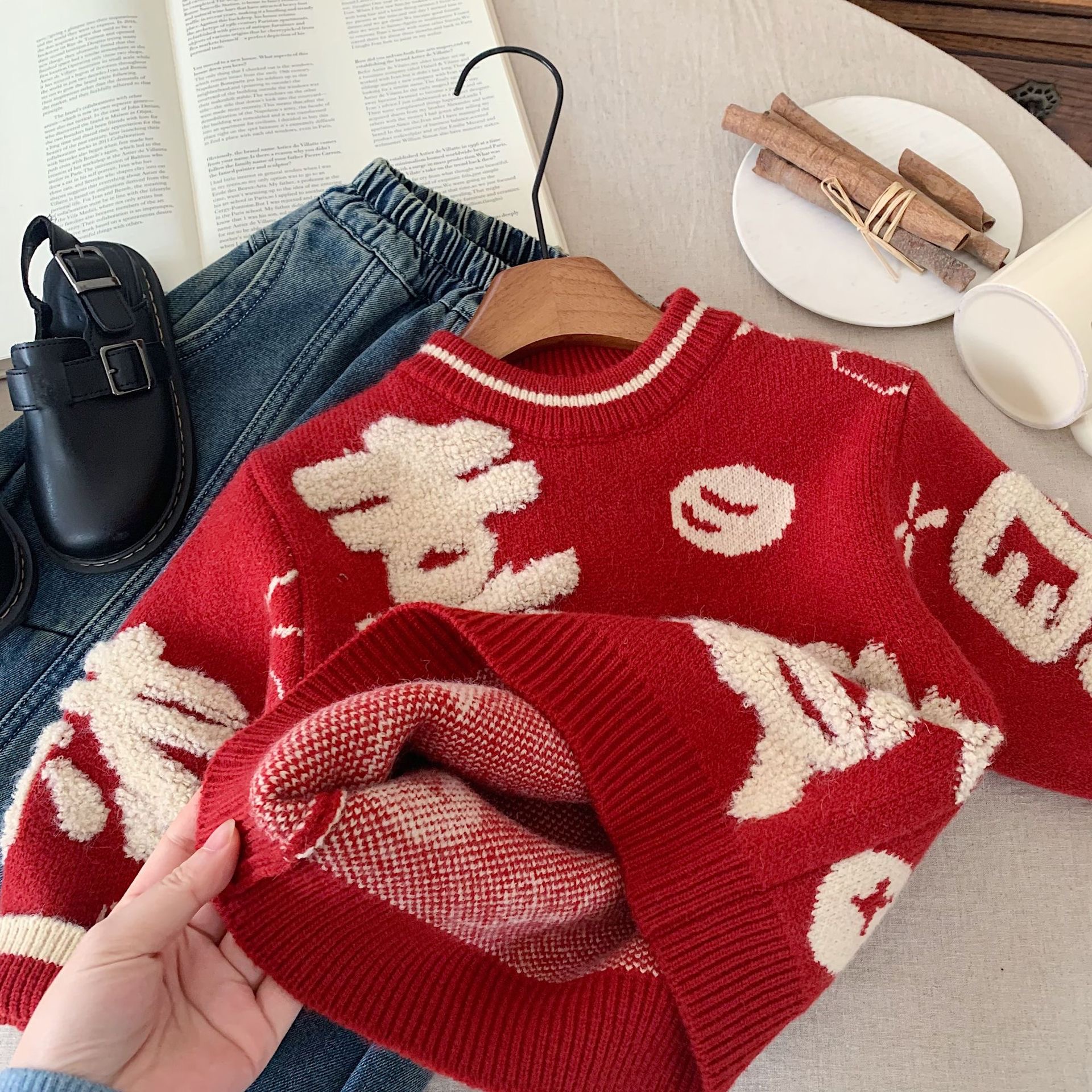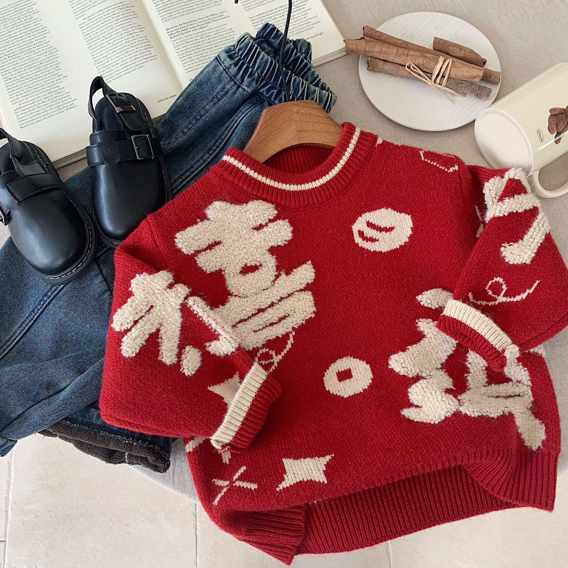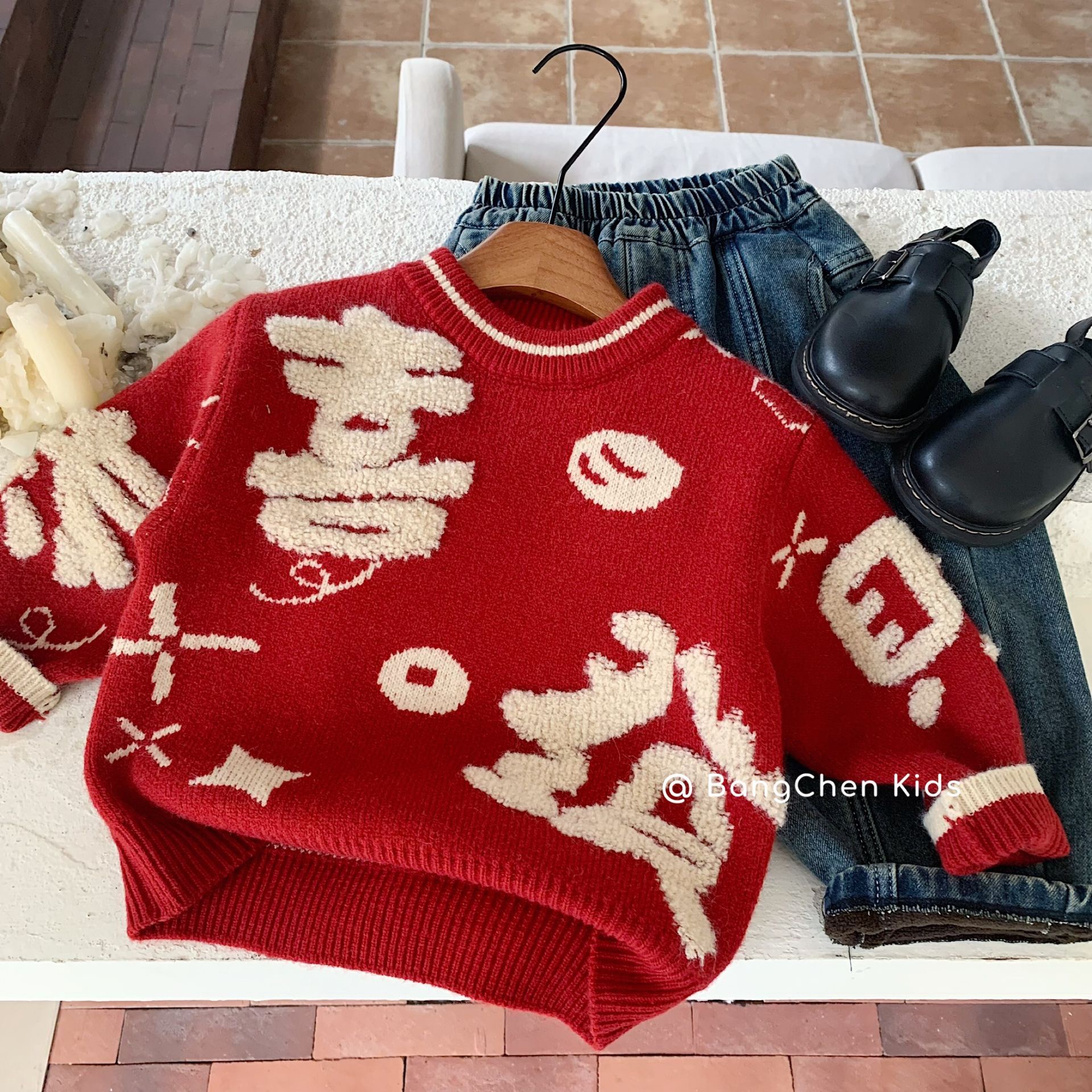 【YW】无忧购男女童印花刺绣喜庆新年恭喜发财套头针织衫年服(截单后7天发货)25年清仓捡漏