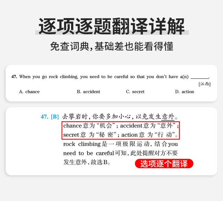 2. 逐题翻译详解,免查词典,基础差也能看得懂;