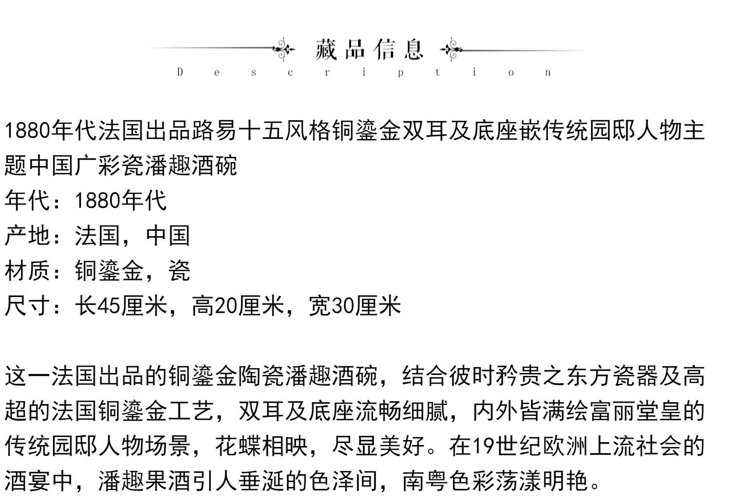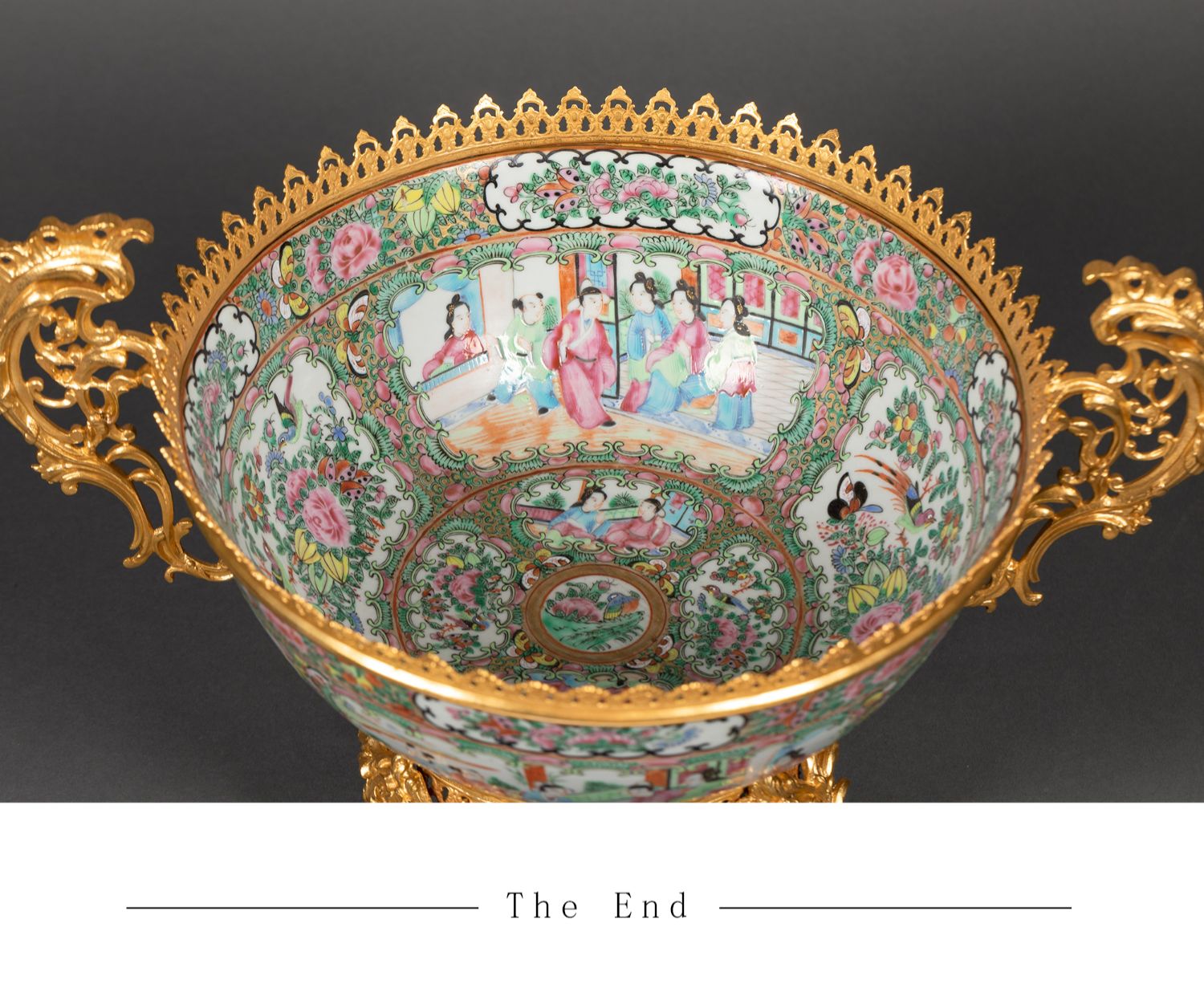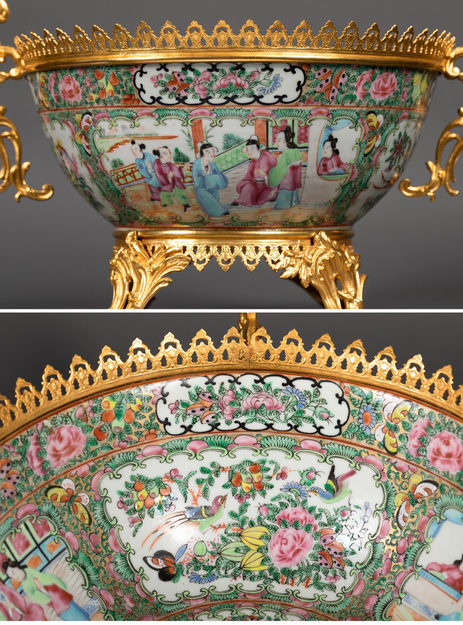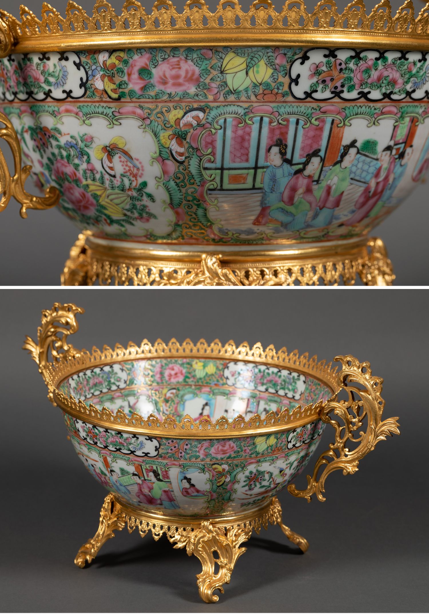 独角鹿西洋古董路易十五风铜鎏金双耳中国广彩瓷潘趣酒碗