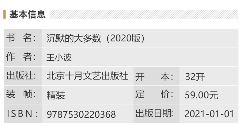 《一只特立独行的猪》《沉默的大多数》《我的精神家园》三本杂文集,是得到王小波的三个步骤。《沉默的大多数》是王小波智慧之书,“上头之选”——爱智慧,爱自由,反对愚蠢!收录40篇见地不俗、论述精彩、思想深刻的文章,呈现其对社会、历史、文化的叩问,亦能解答当下的困惑,代表了王小波背后的精神内核。在调侃中见智识真知,在幽默中见人格魅力。李银河亲自审定,首度以读者视角排定蕞佳阅读顺序,全年龄段第·一批试读者一致好评!欢迎来到王小波宇宙!