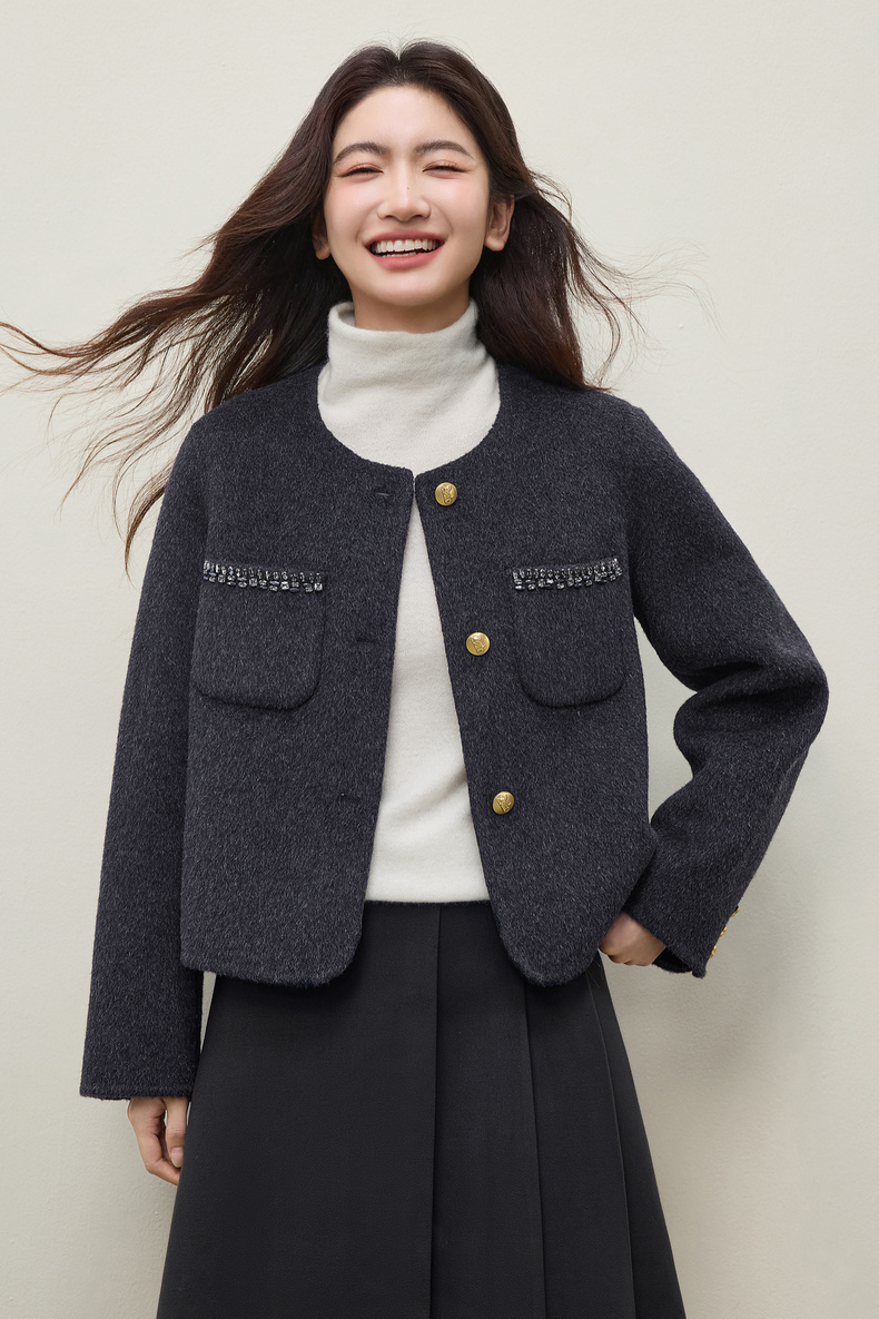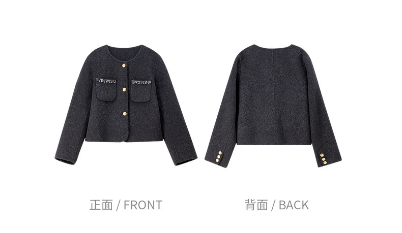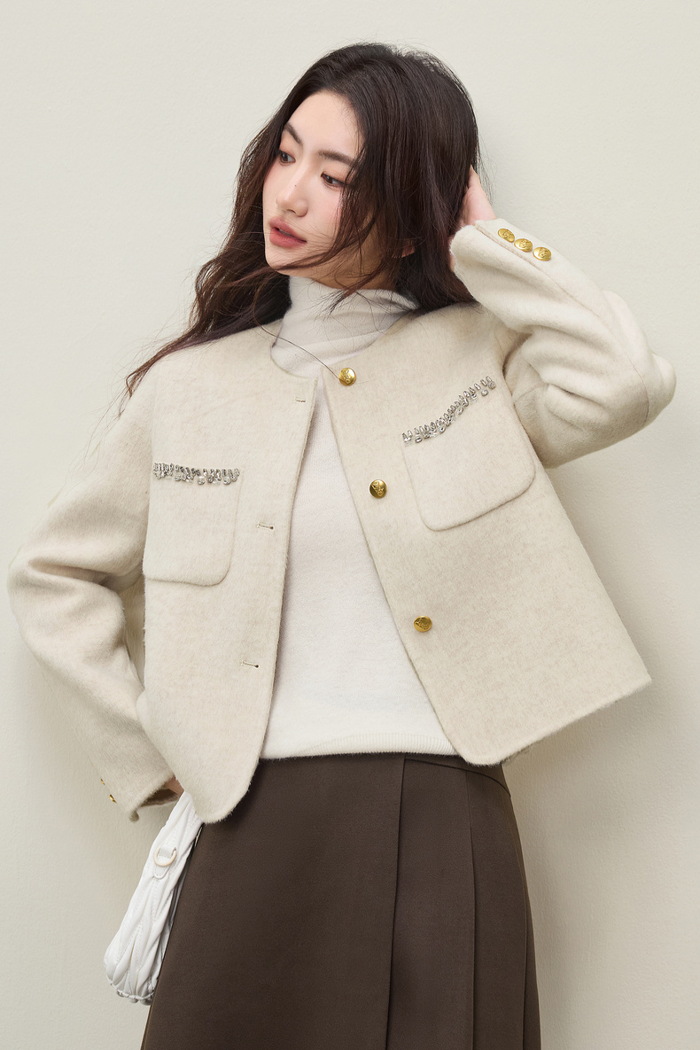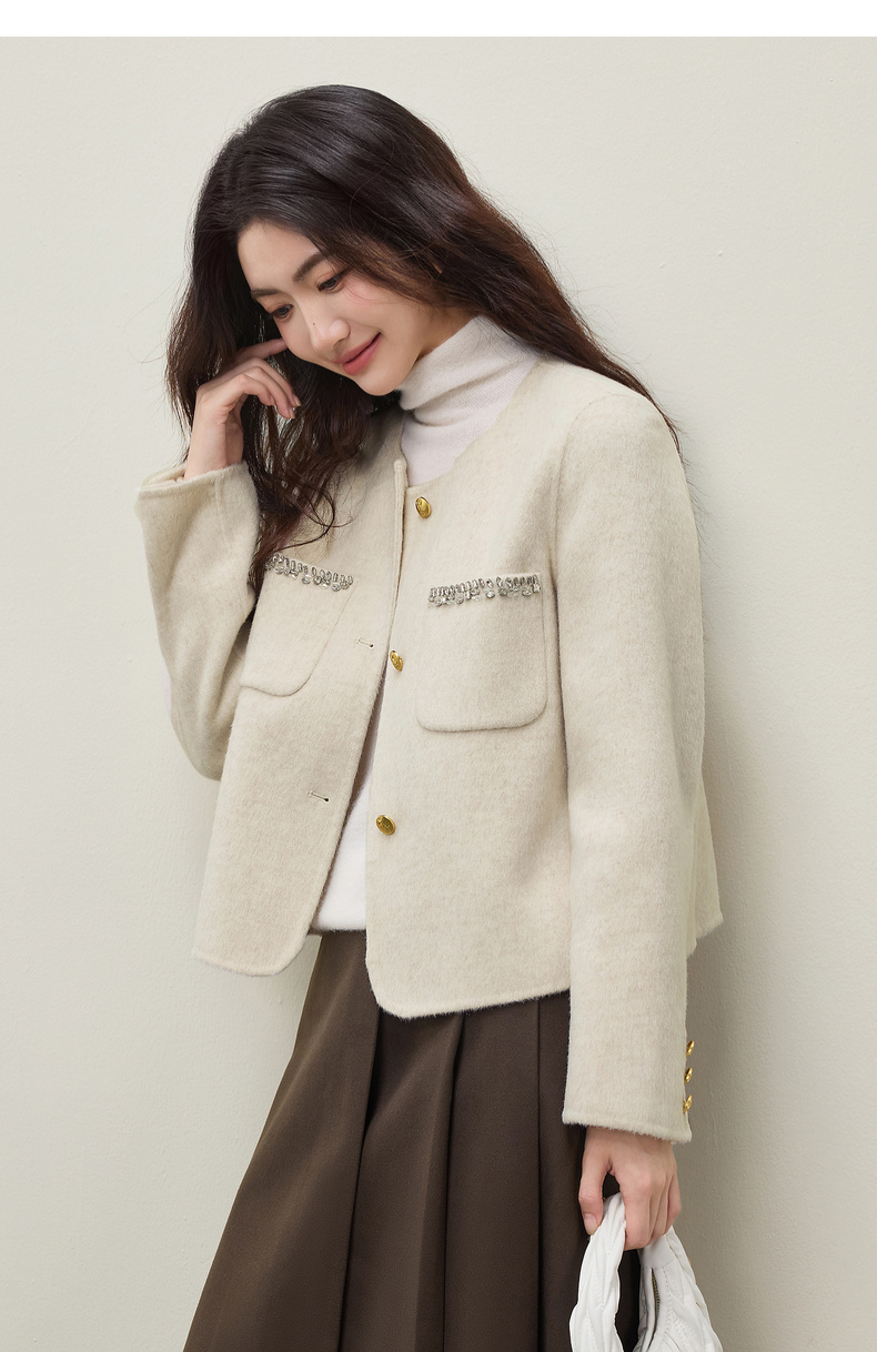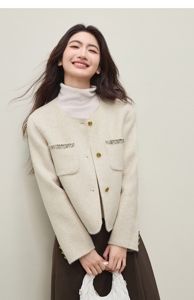 【内购】【100%绵羊毛】通勤贵气奢感手工钉钻圆领厚保暖短款双面呢外套-W54OG4882
