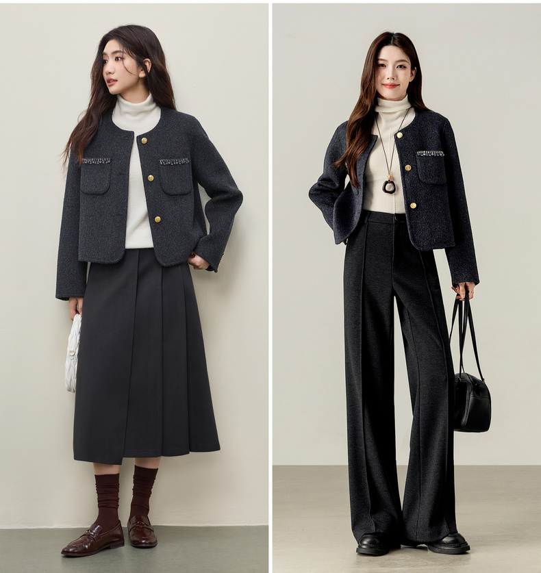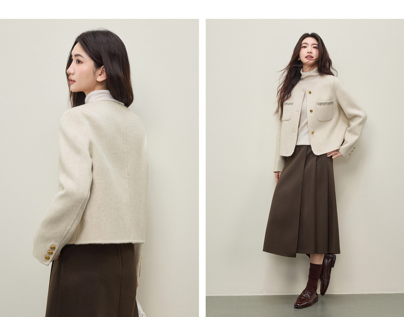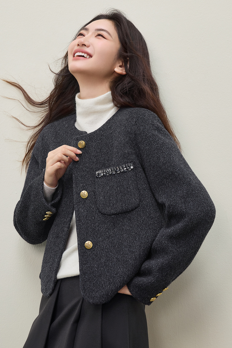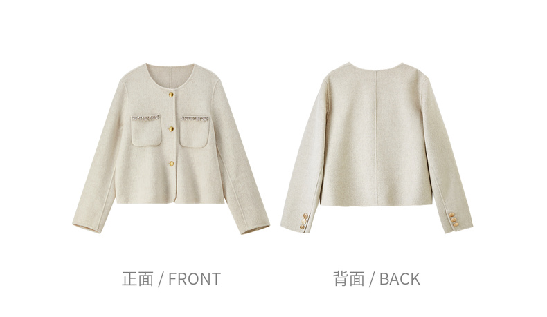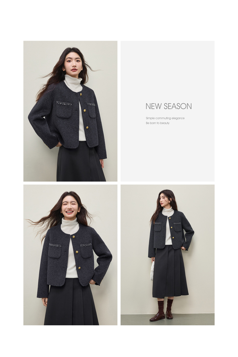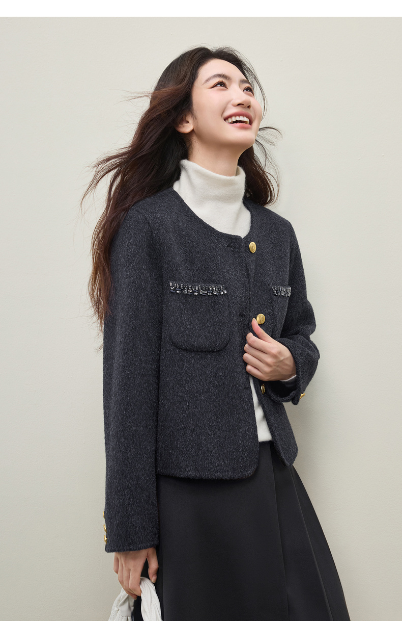 【内购】【100%绵羊毛】通勤贵气奢感手工钉钻圆领厚保暖短款双面呢外套-W54OG4882