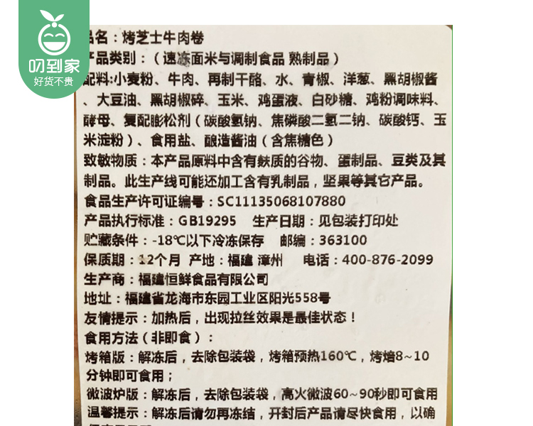 恒鲜·烤芝士牛肉卷(120g*4条/包 独立包装)生产日期: 3月