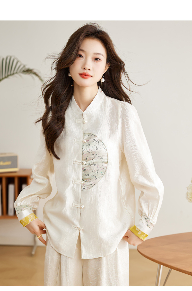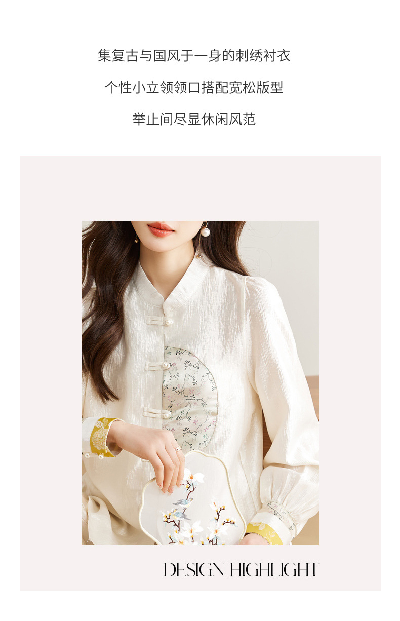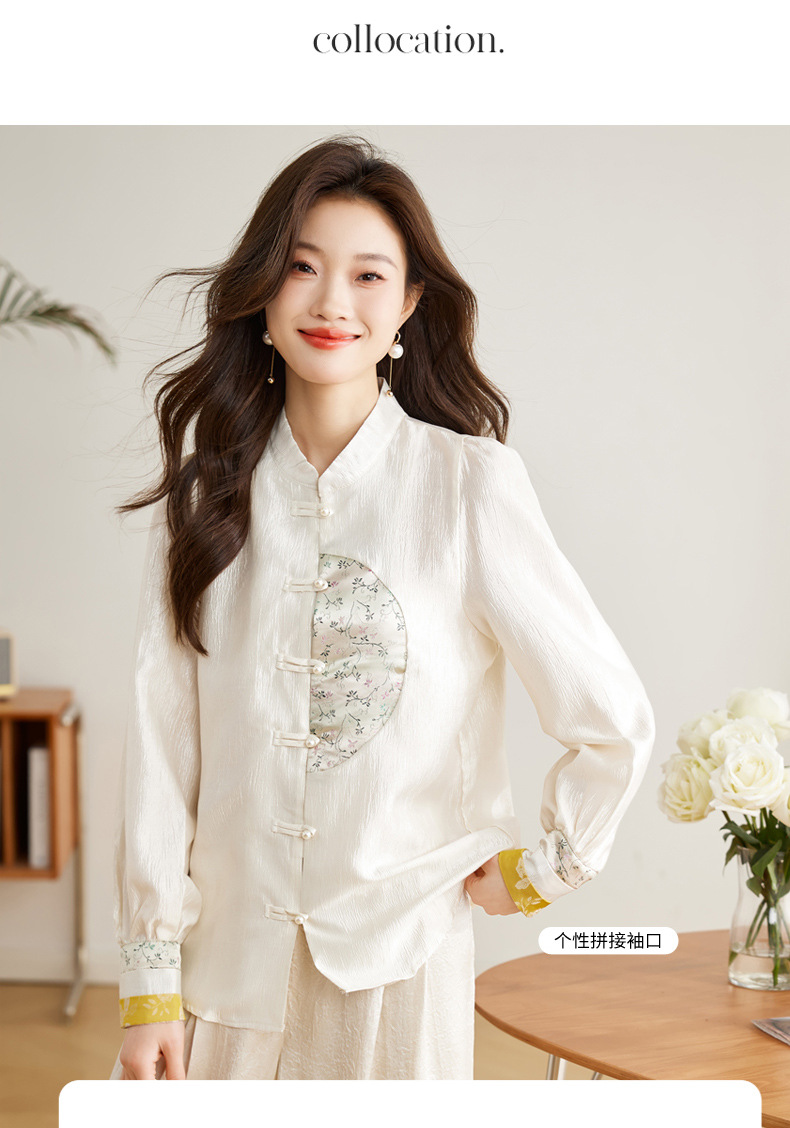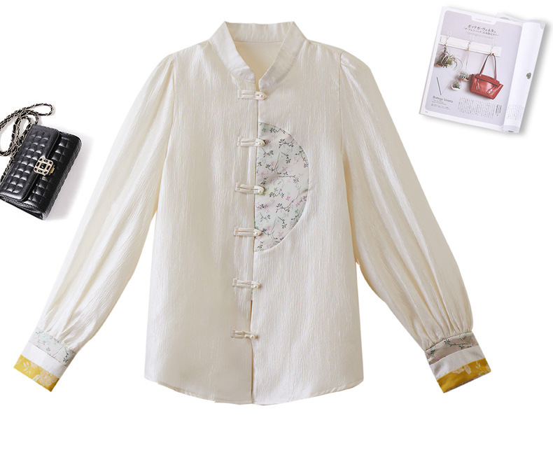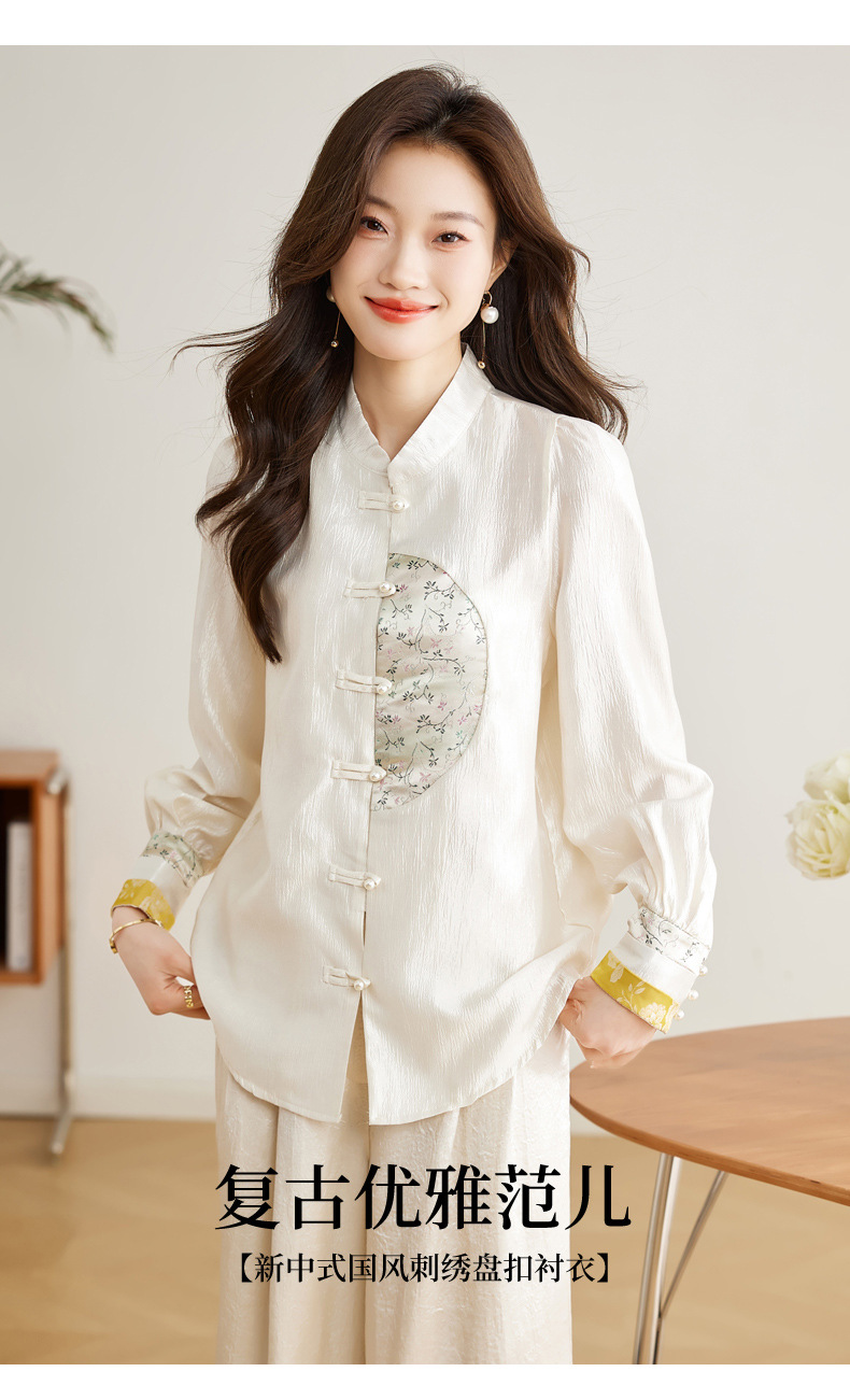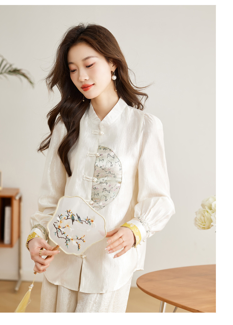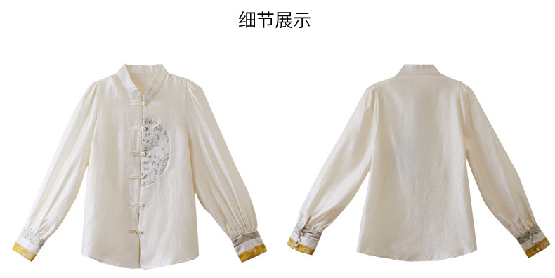 白色长袖新中式衬衫,立领国风复古刺绣提花盘扣上衣CC-QL-s6673