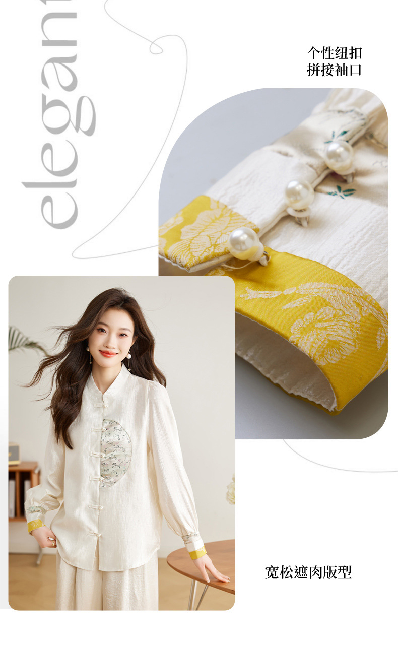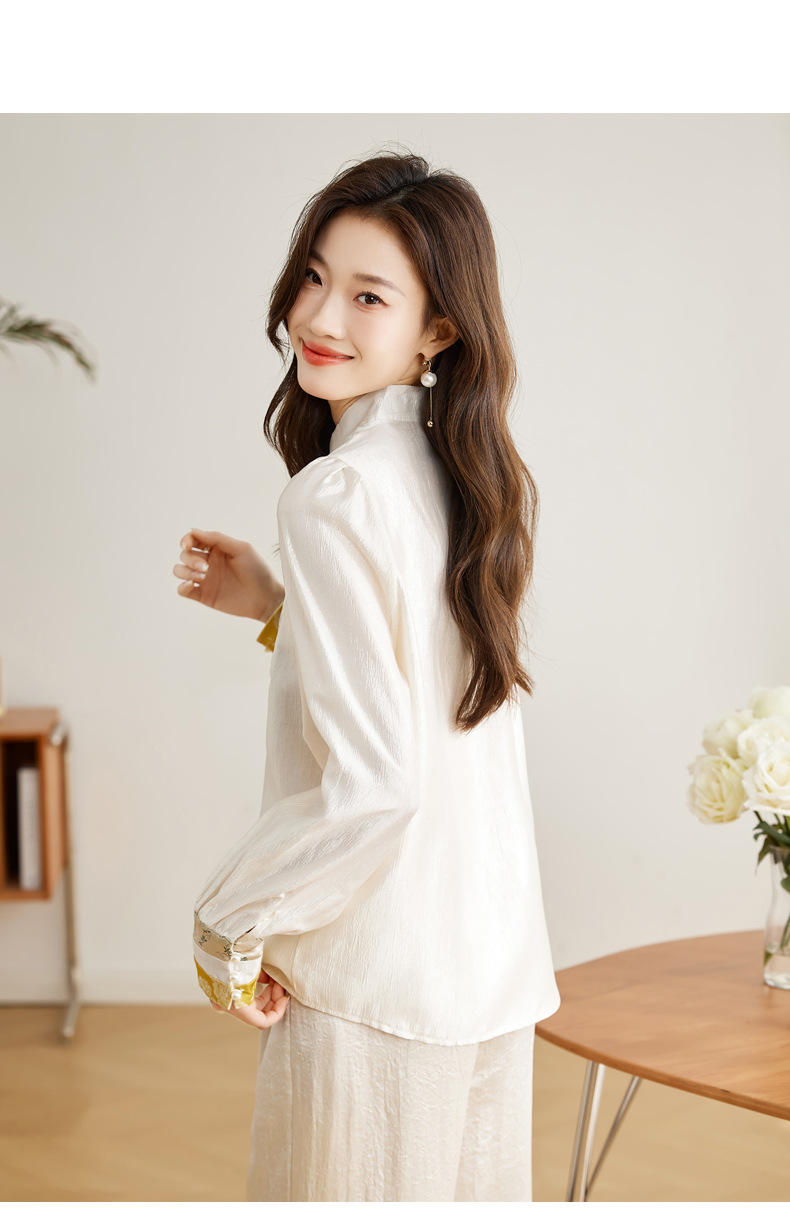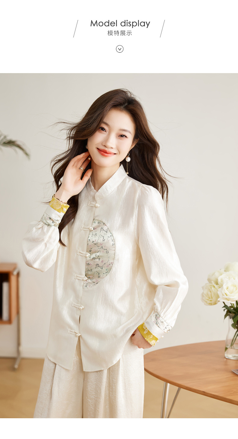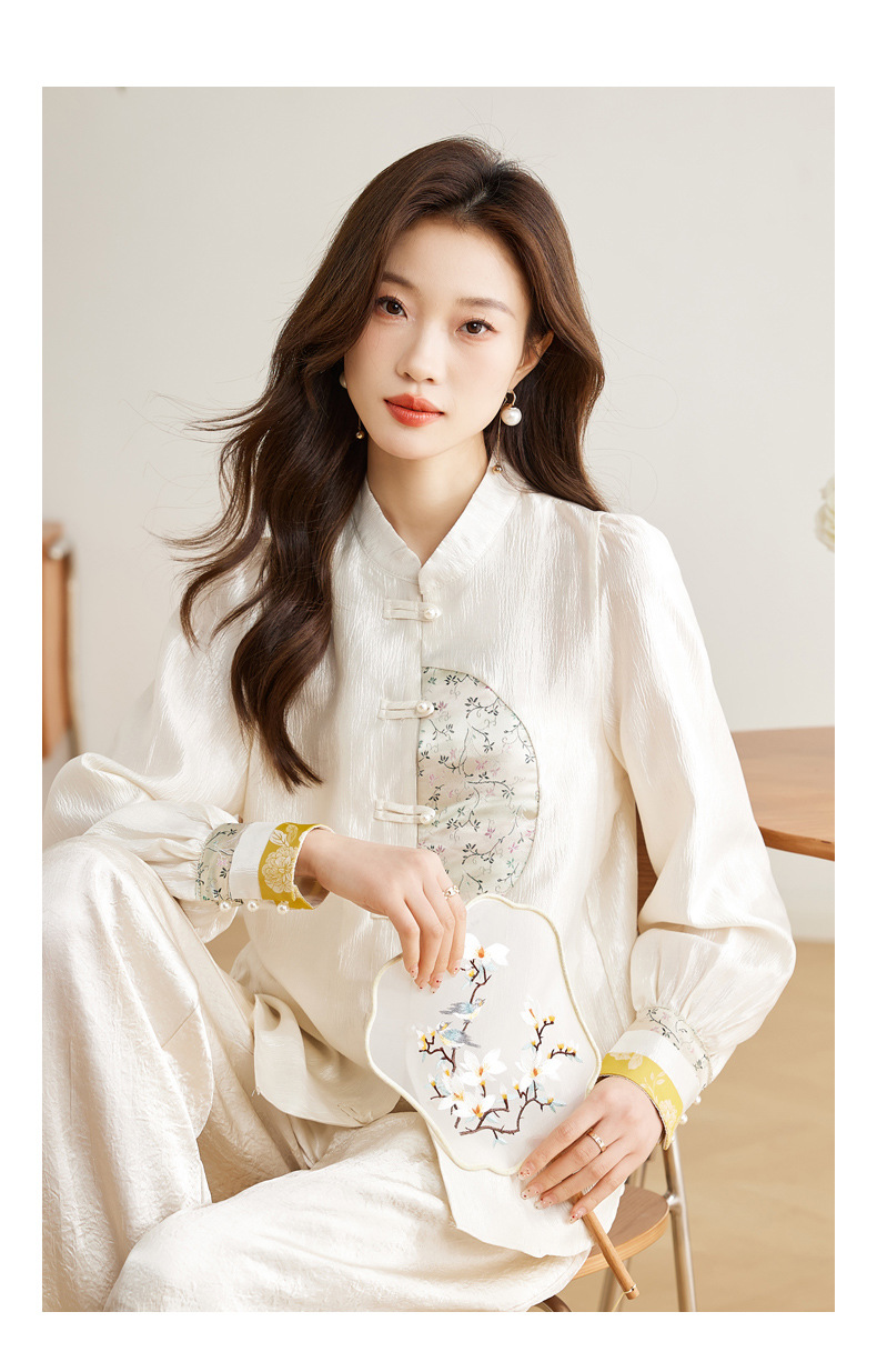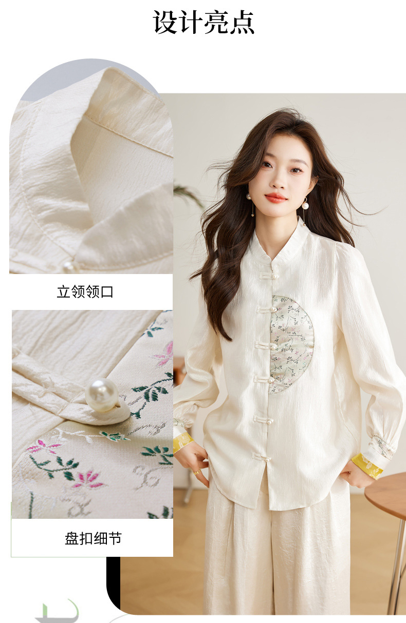 白色长袖新中式衬衫,立领国风复古刺绣提花盘扣上衣CC-QL-s6673