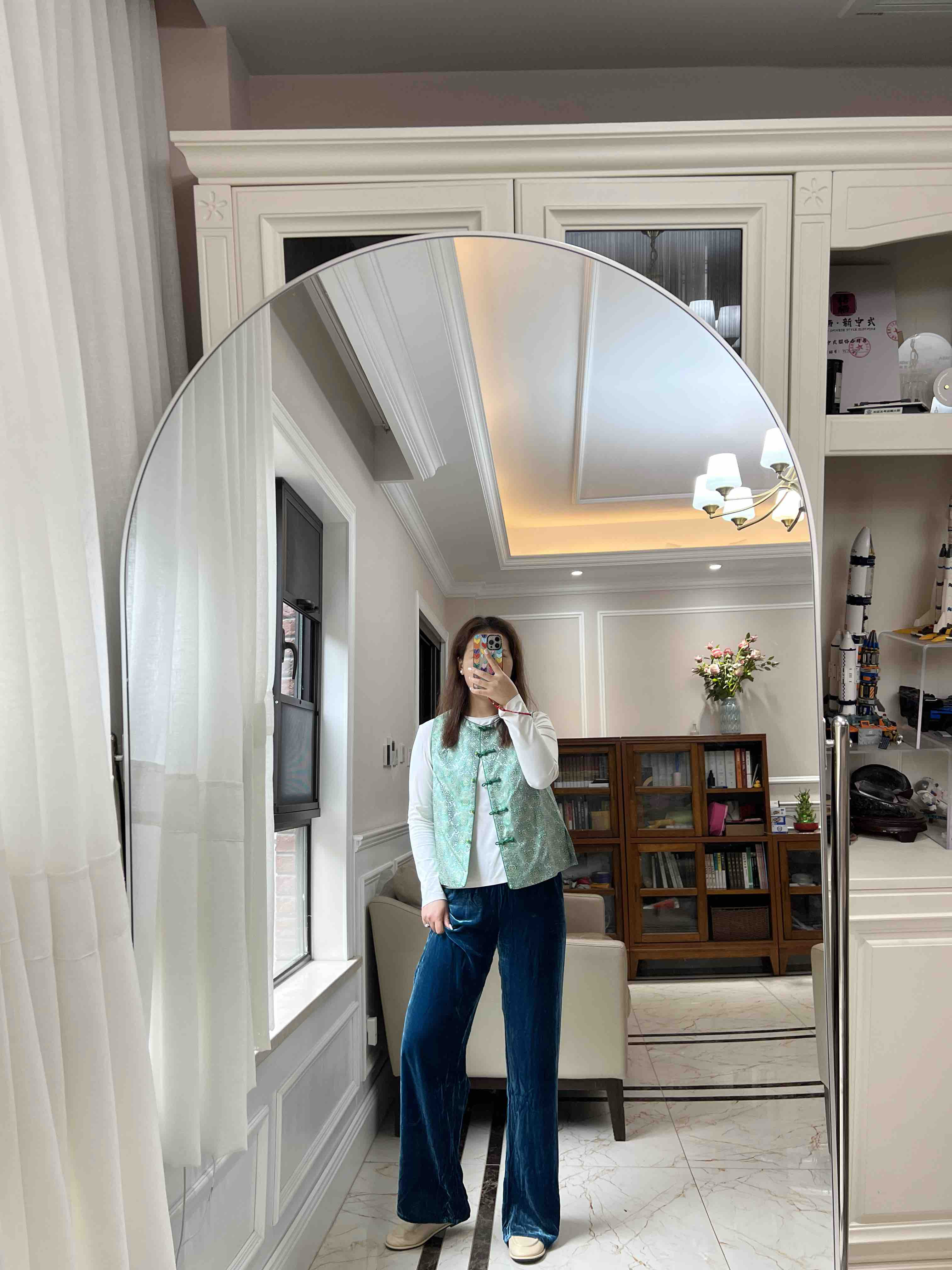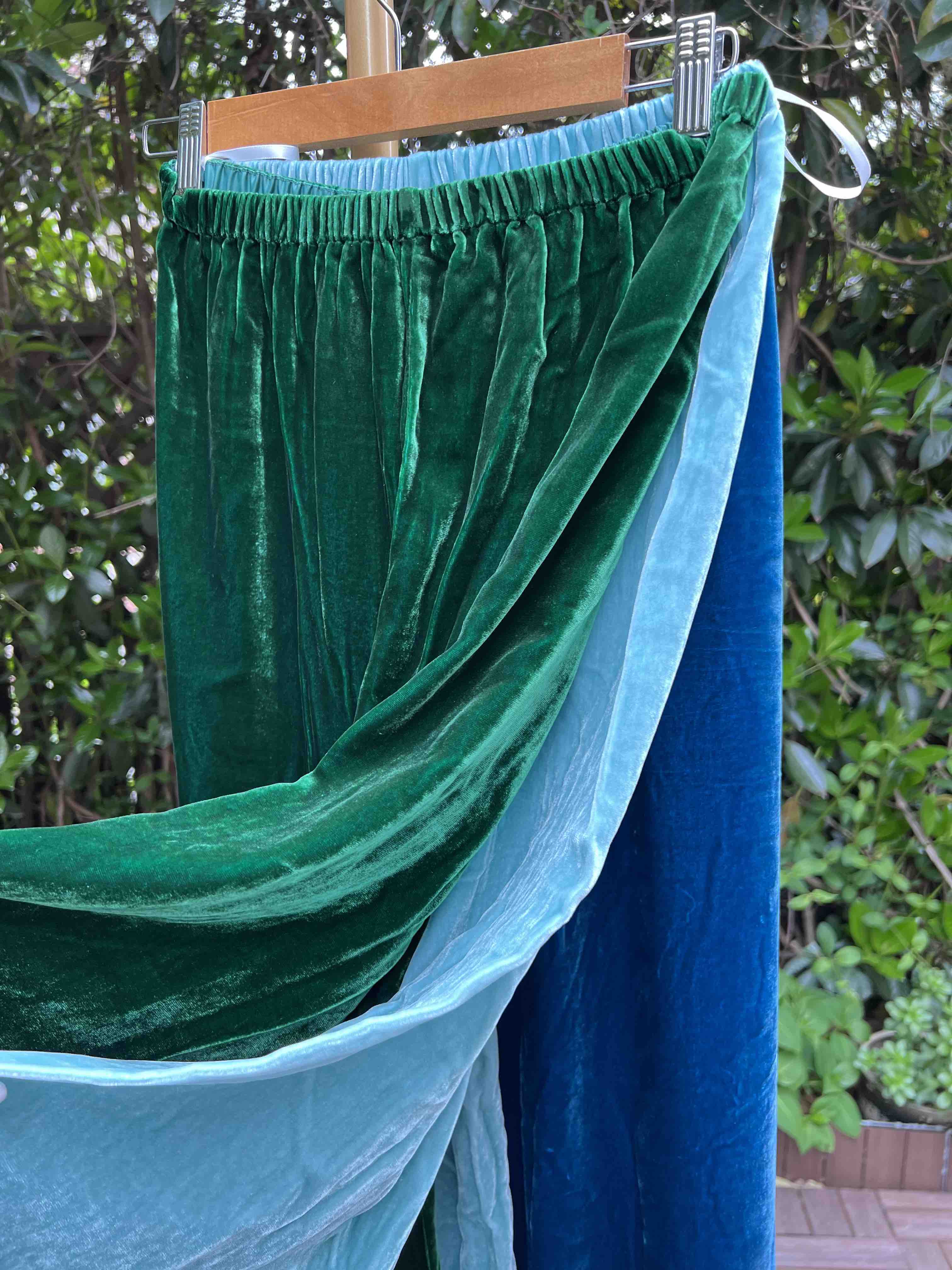今天没来得及拍,前几天那个香云纱蓝色马甲,搭配这个蓝宝石阔腿裤,太般配了吧,哈哈哈。祖母绿真丝丝绒阔腿裤,薄款啊薄款啊,适合春夏,特别滴高级,适配你们一切新中式的上衣。