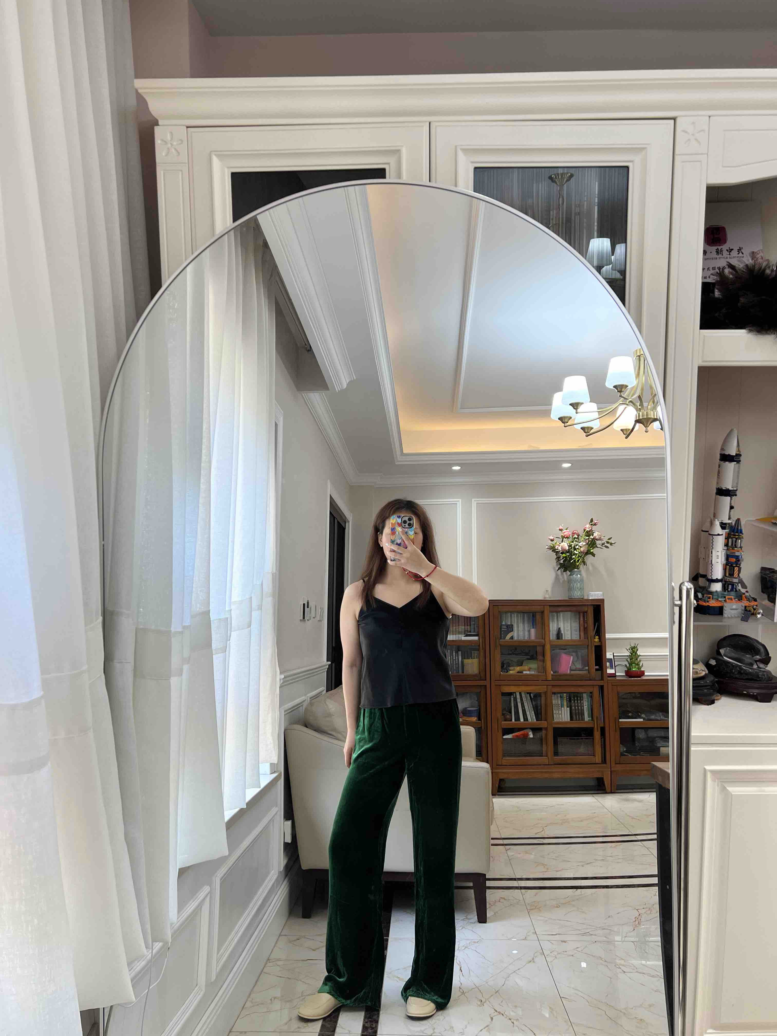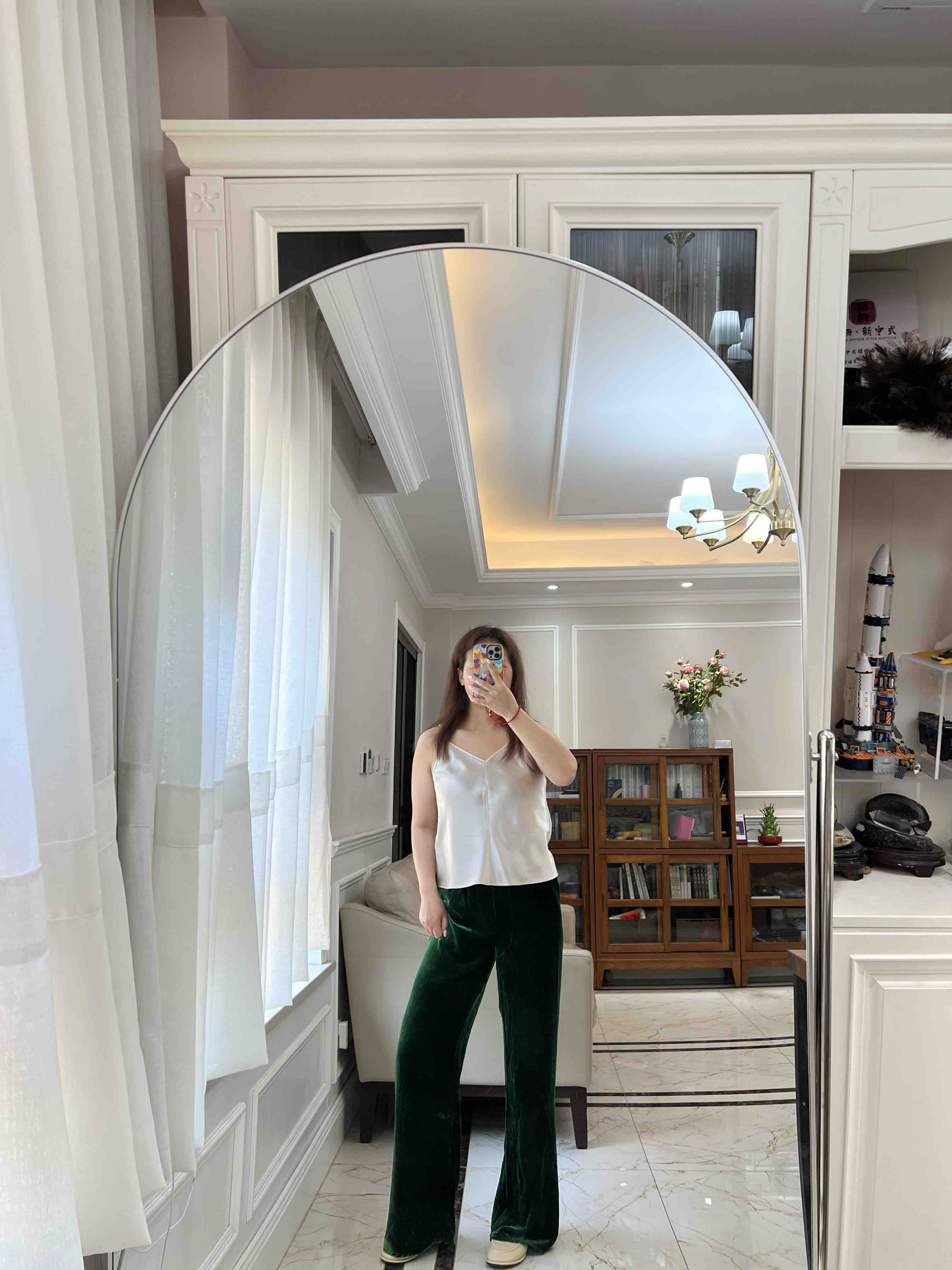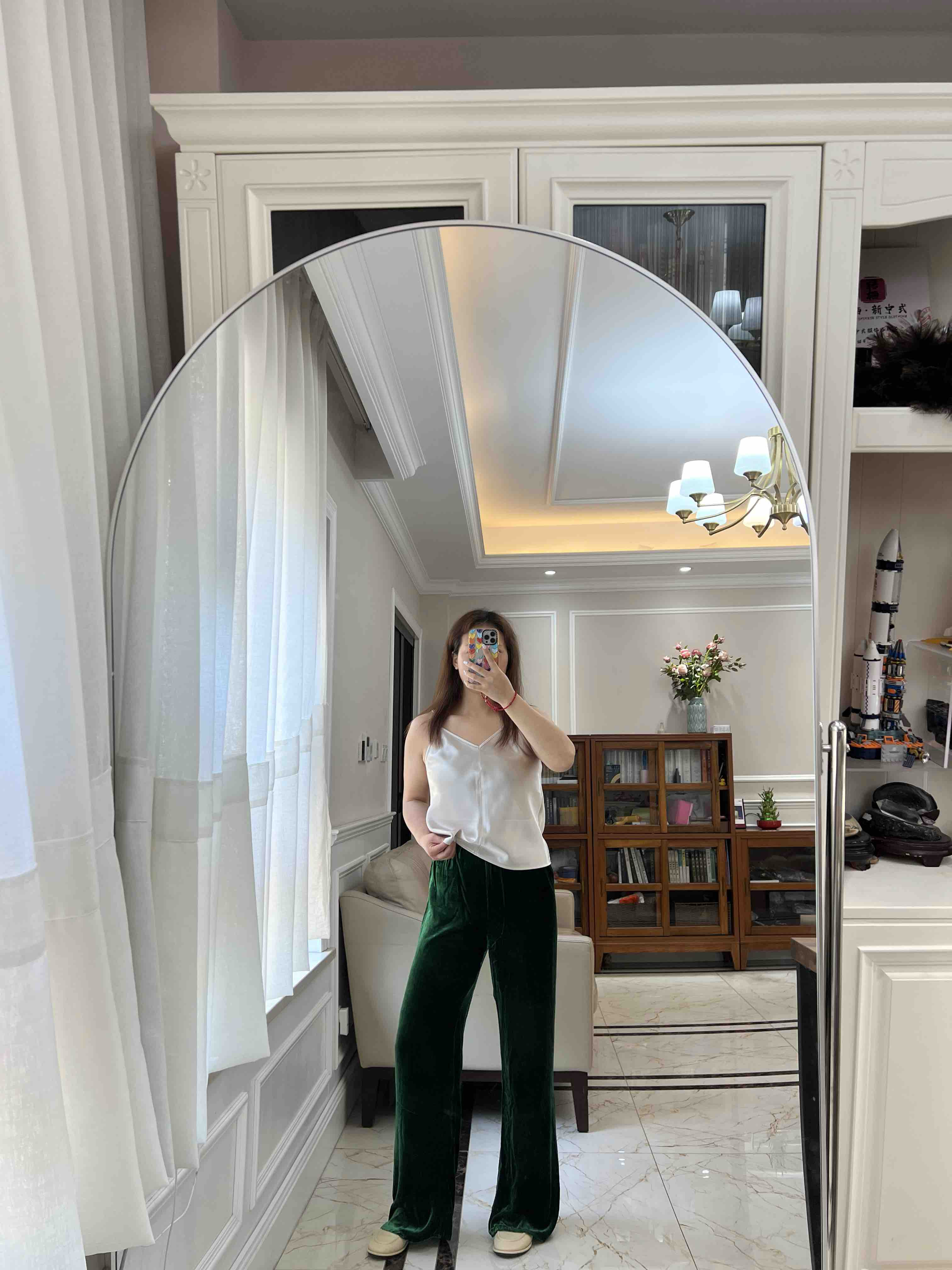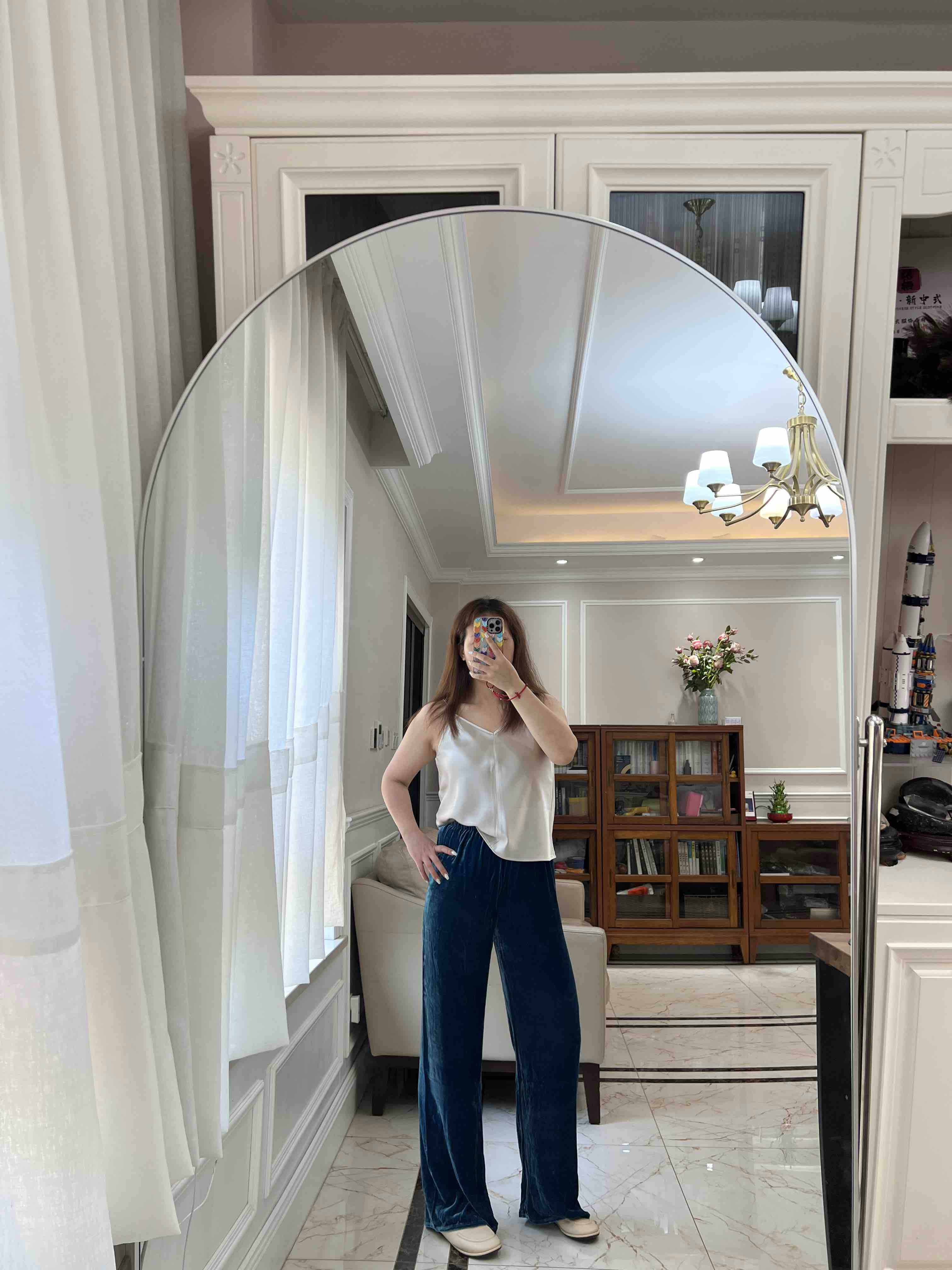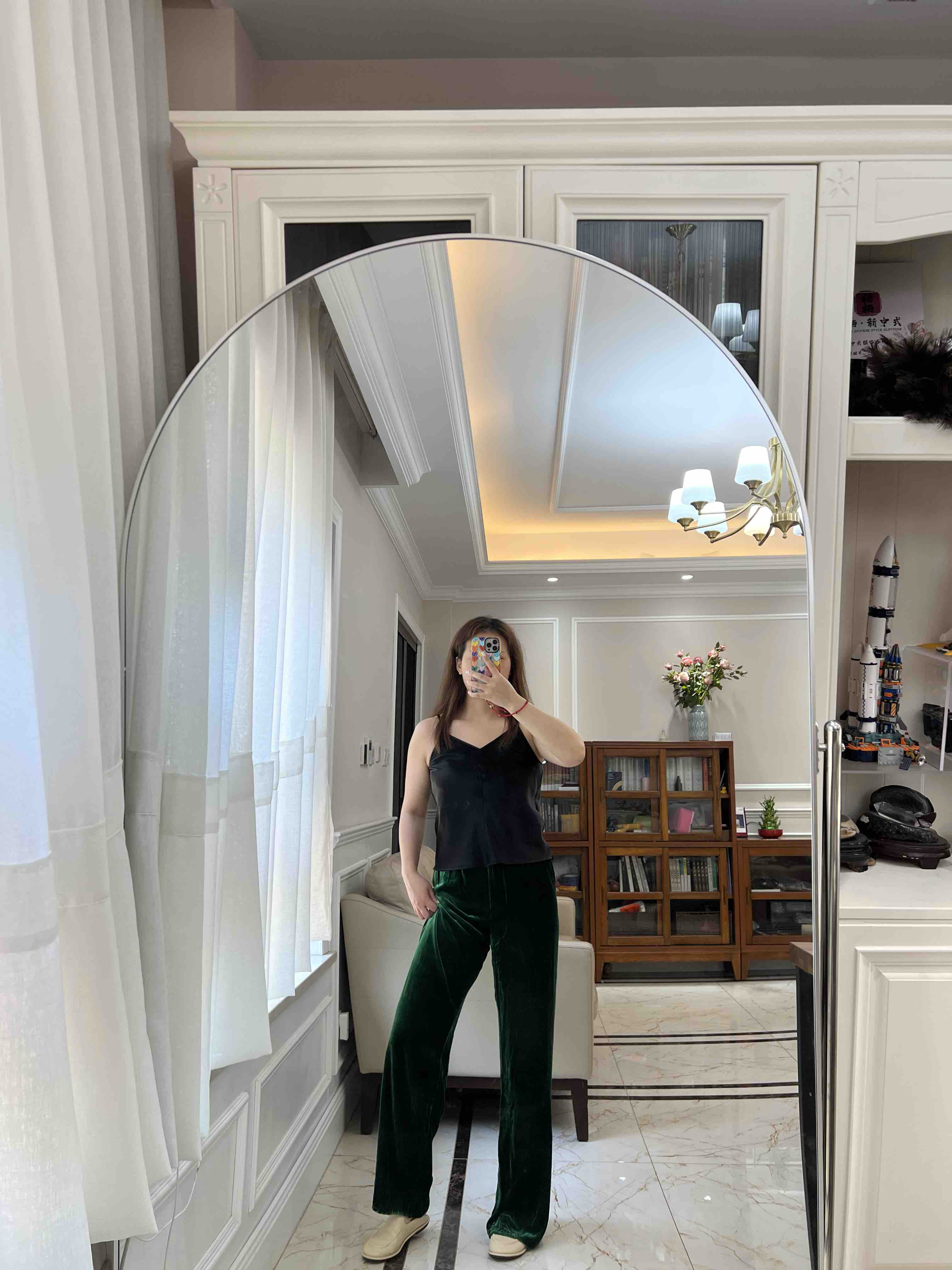 拿到手要低温熨烫一下的,要么会略微皱的,祖母绿这个颜色相当显白,搭配各种短袖穿都相当好看,关键的点是真丝丝绒,质感非一般的高级,就是比普通聚酯面料的更亲肤舒适,不起球不掉色不变型,加长加宽的阔腿裤,任何腿型都能驾驭。