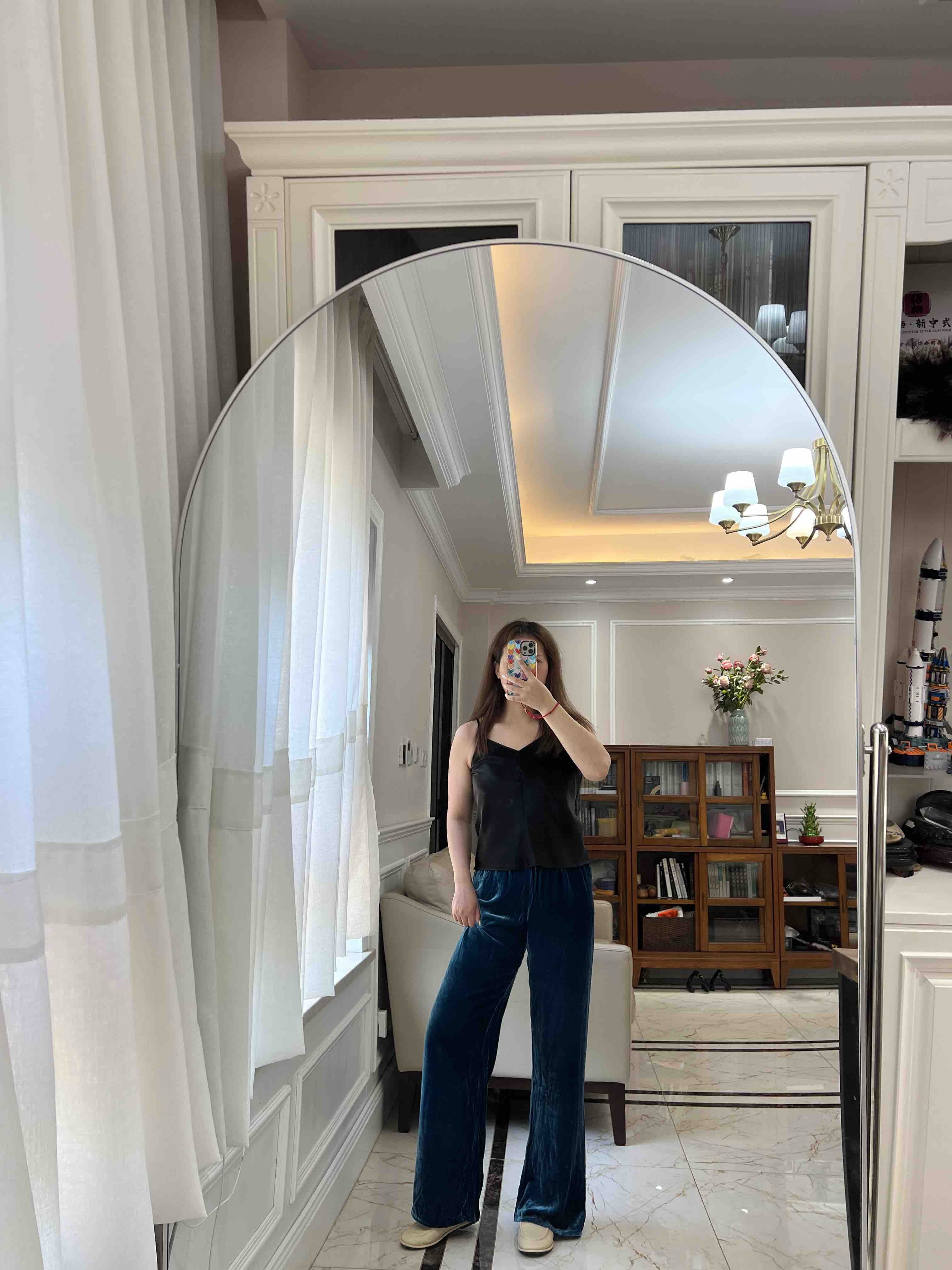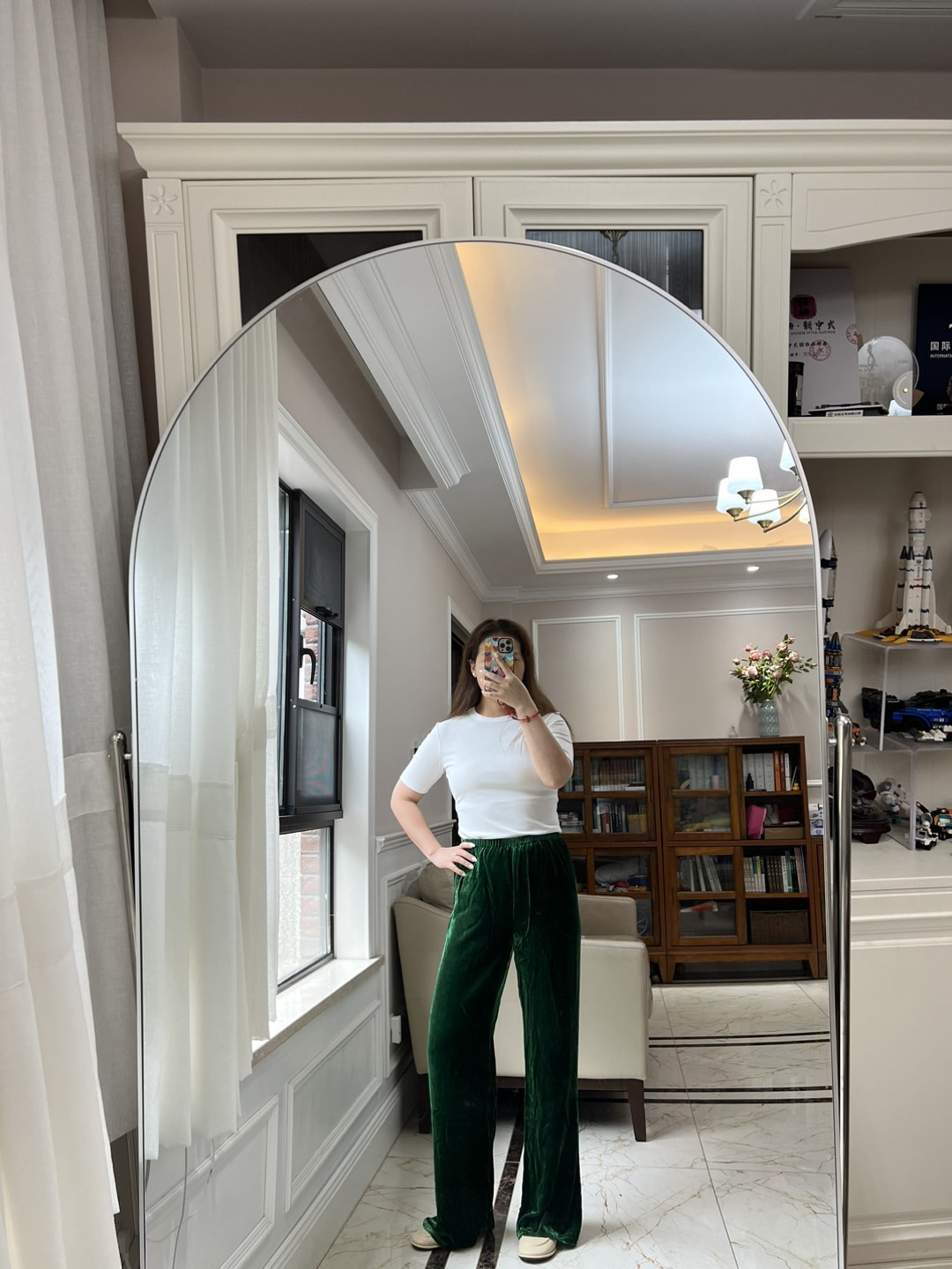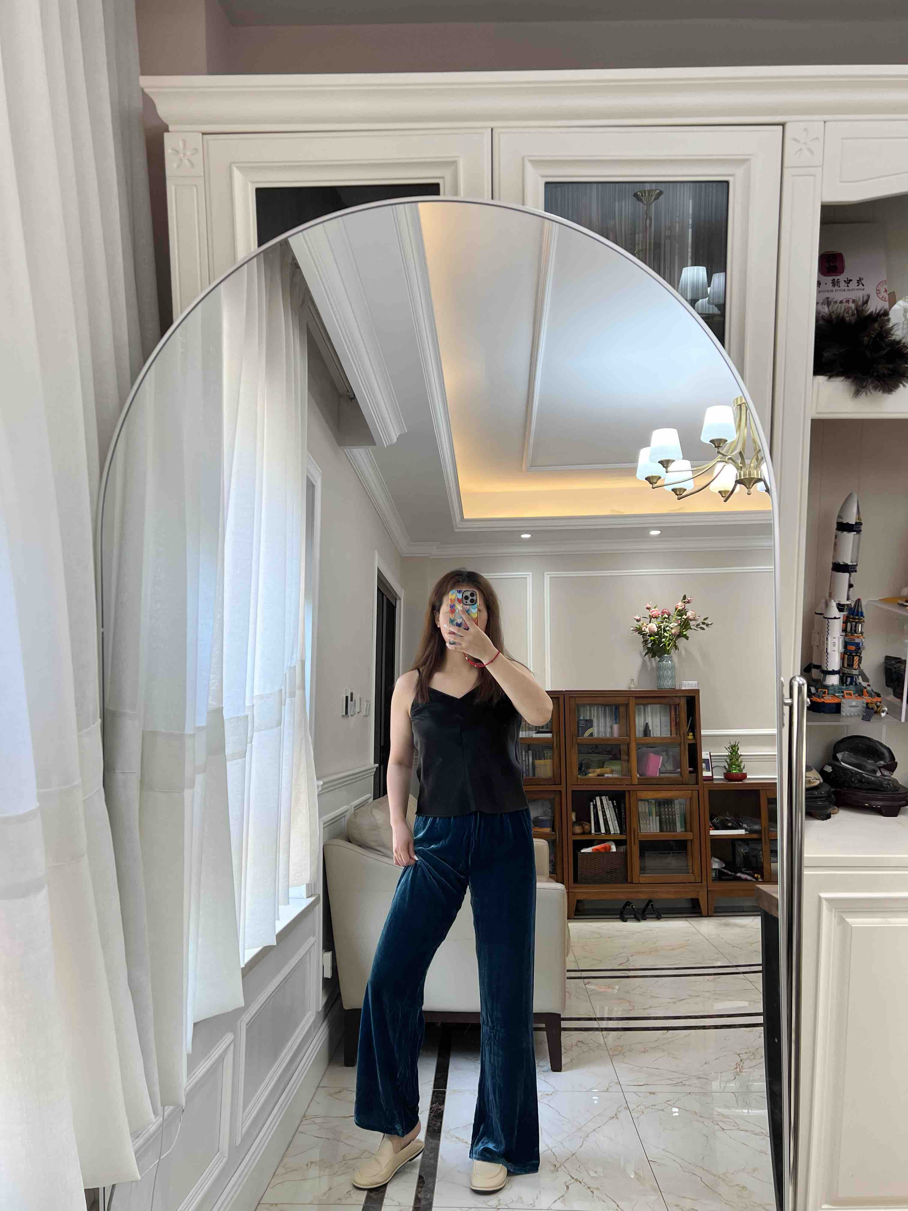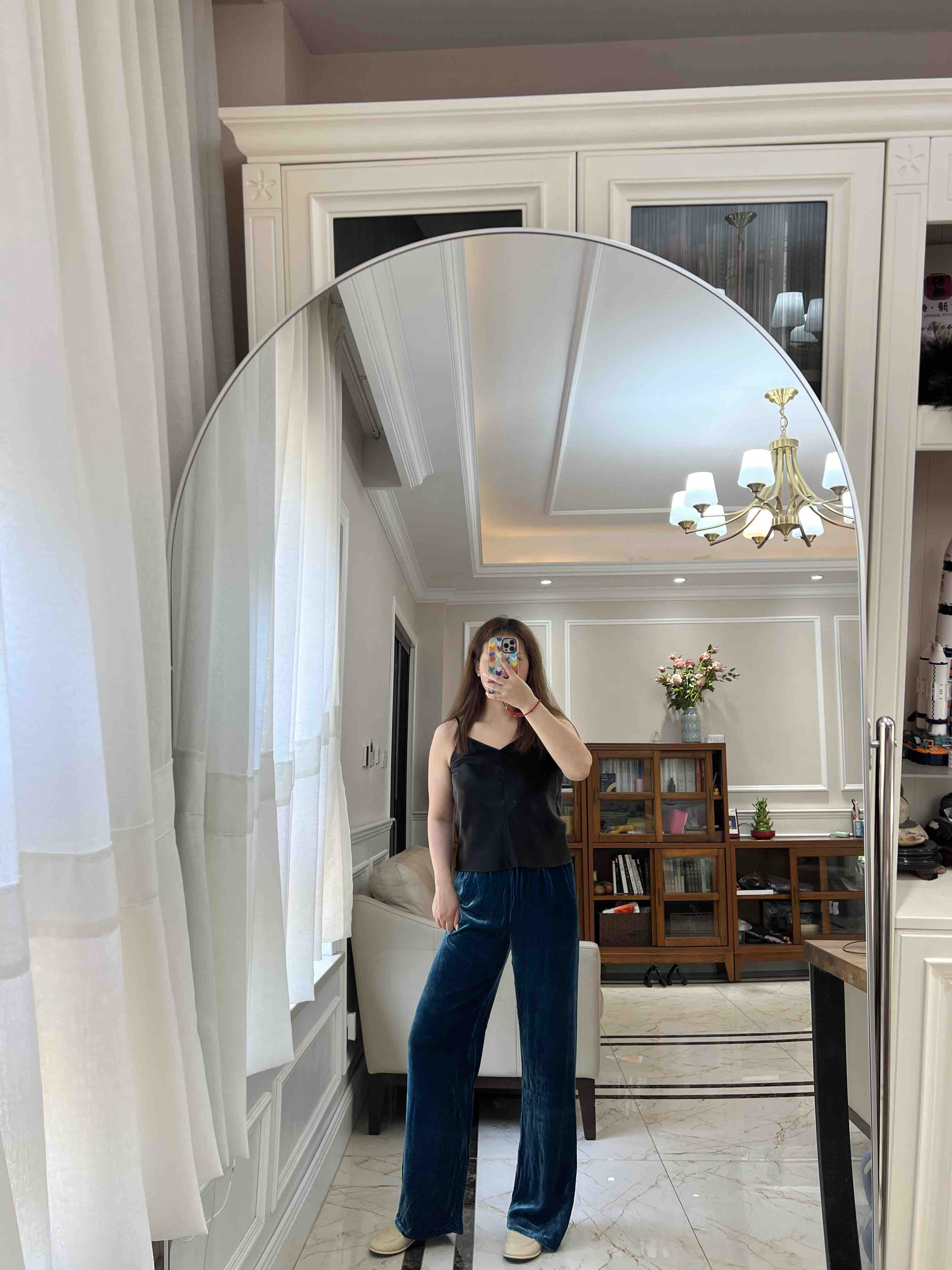 拿到手要低温熨烫一下的,要么会略微皱的,祖母绿这个颜色相当显白,搭配各种短袖穿都相当好看,关键的点是真丝丝绒,质感非一般的高级,就是比普通聚酯面料的更亲肤舒适,不起球不掉色不变型,加长加宽的阔腿裤,任何腿型都能驾驭。