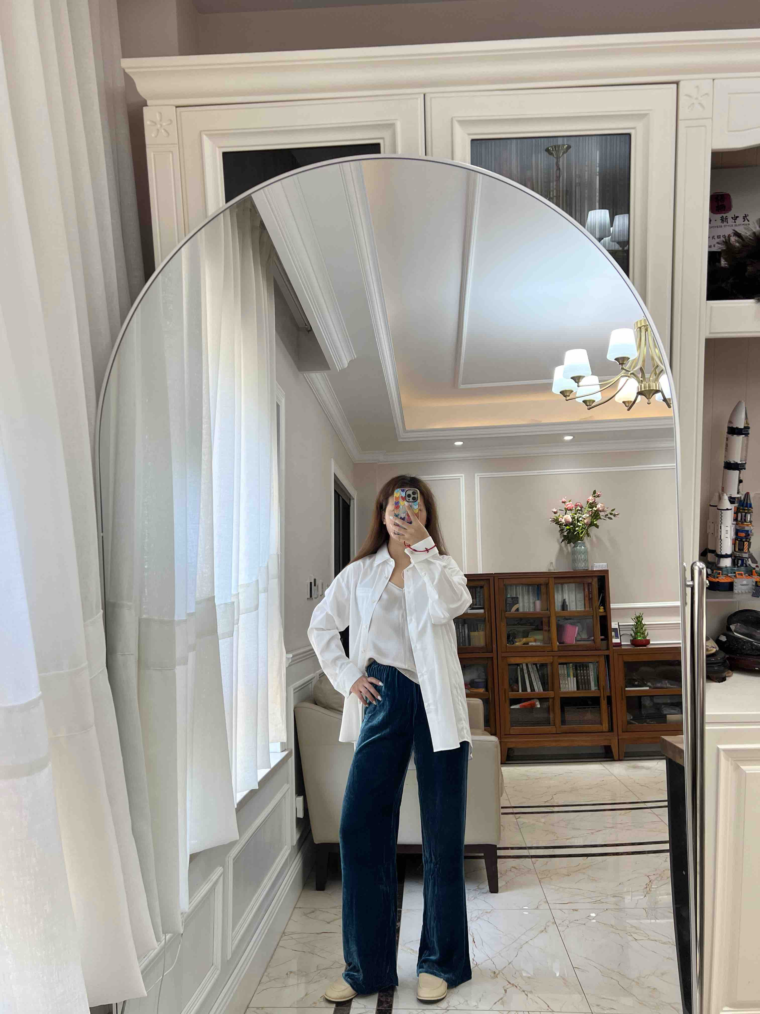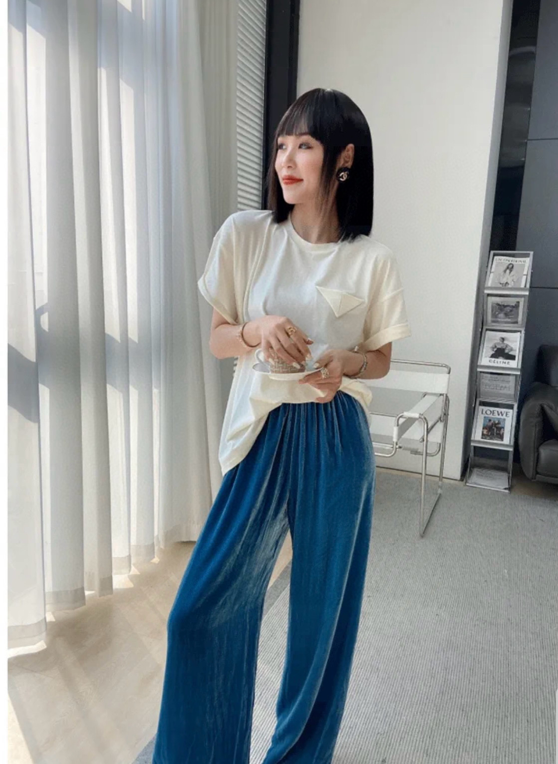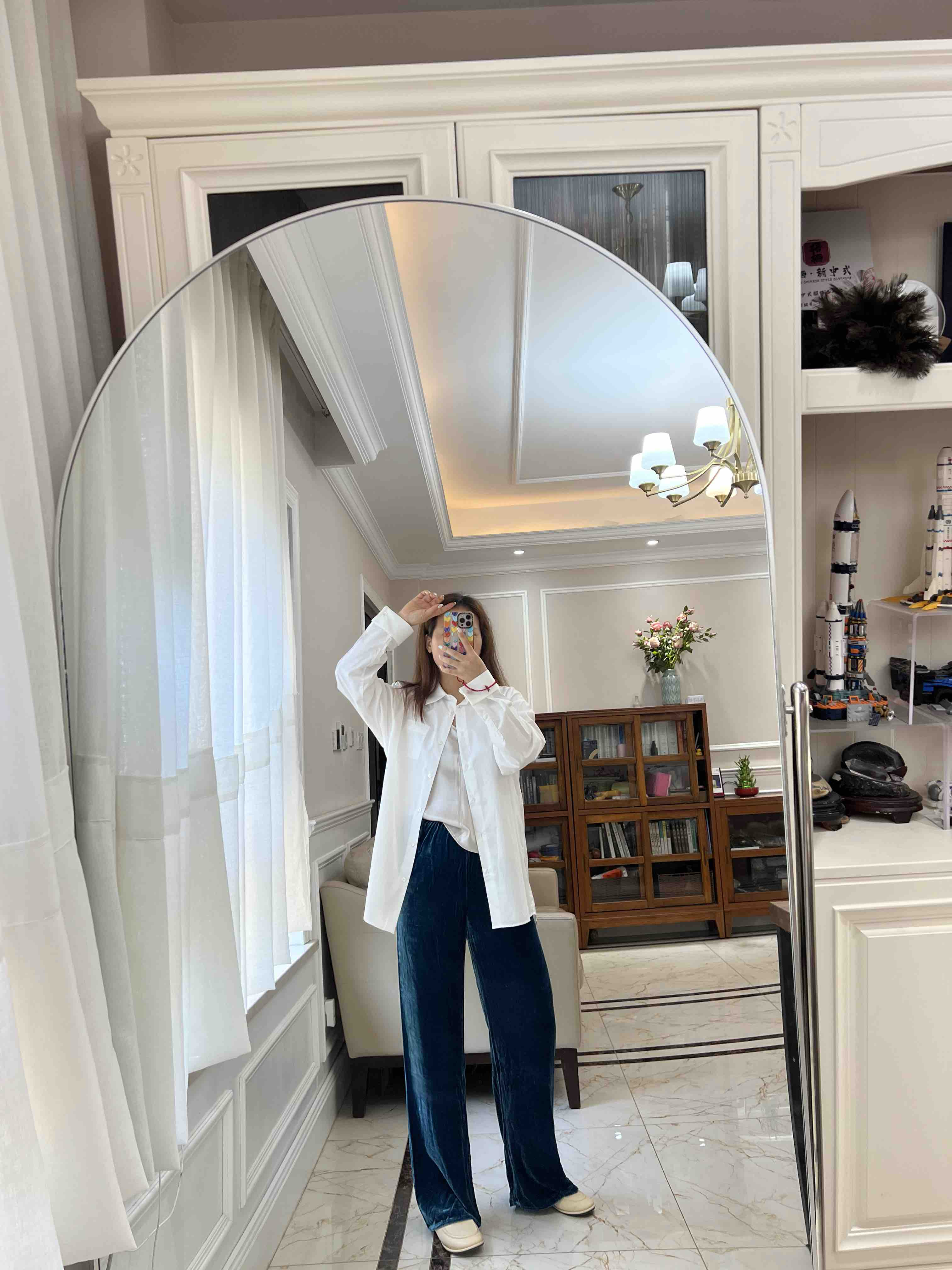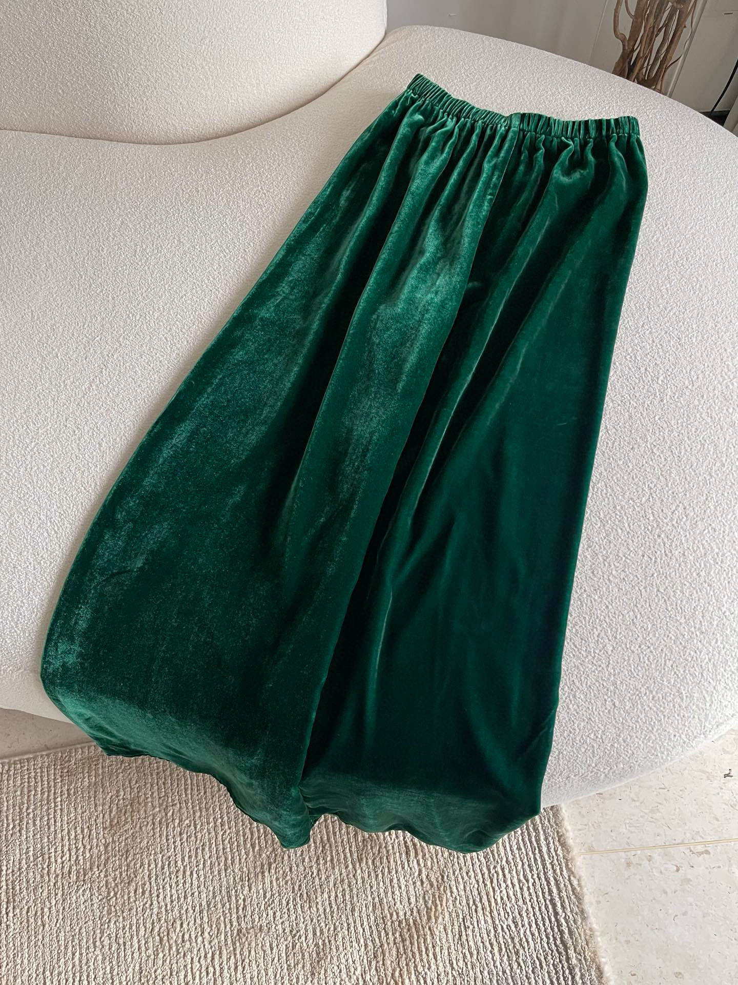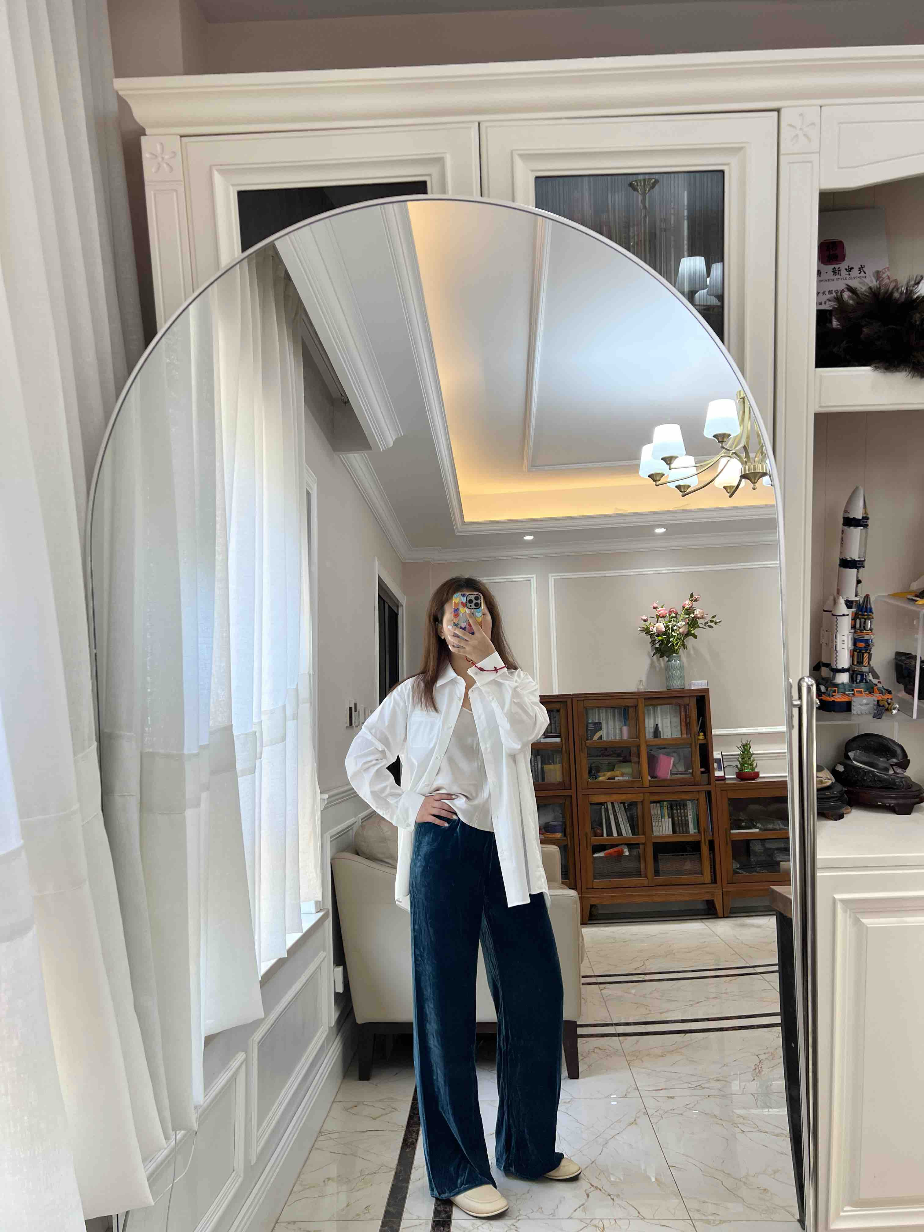 拿到手要低温熨烫一下的,要么会略微皱的,祖母绿这个颜色相当显白,搭配各种短袖穿都相当好看,关键的点是真丝丝绒,质感非一般的高级,就是比普通聚酯面料的更亲肤舒适,不起球不掉色不变型,加长加宽的阔腿裤,任何腿型都能驾驭。