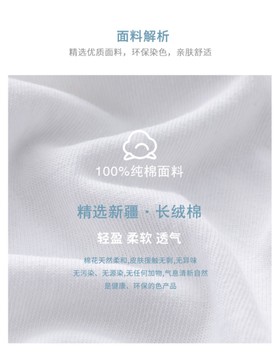 100%高支双面丝光棉,极致奢华用料,带有微微的光泽, 质感柔软细腻爽滑,穿着舒适透气凉爽,且久穿久洗不褪色不变形。