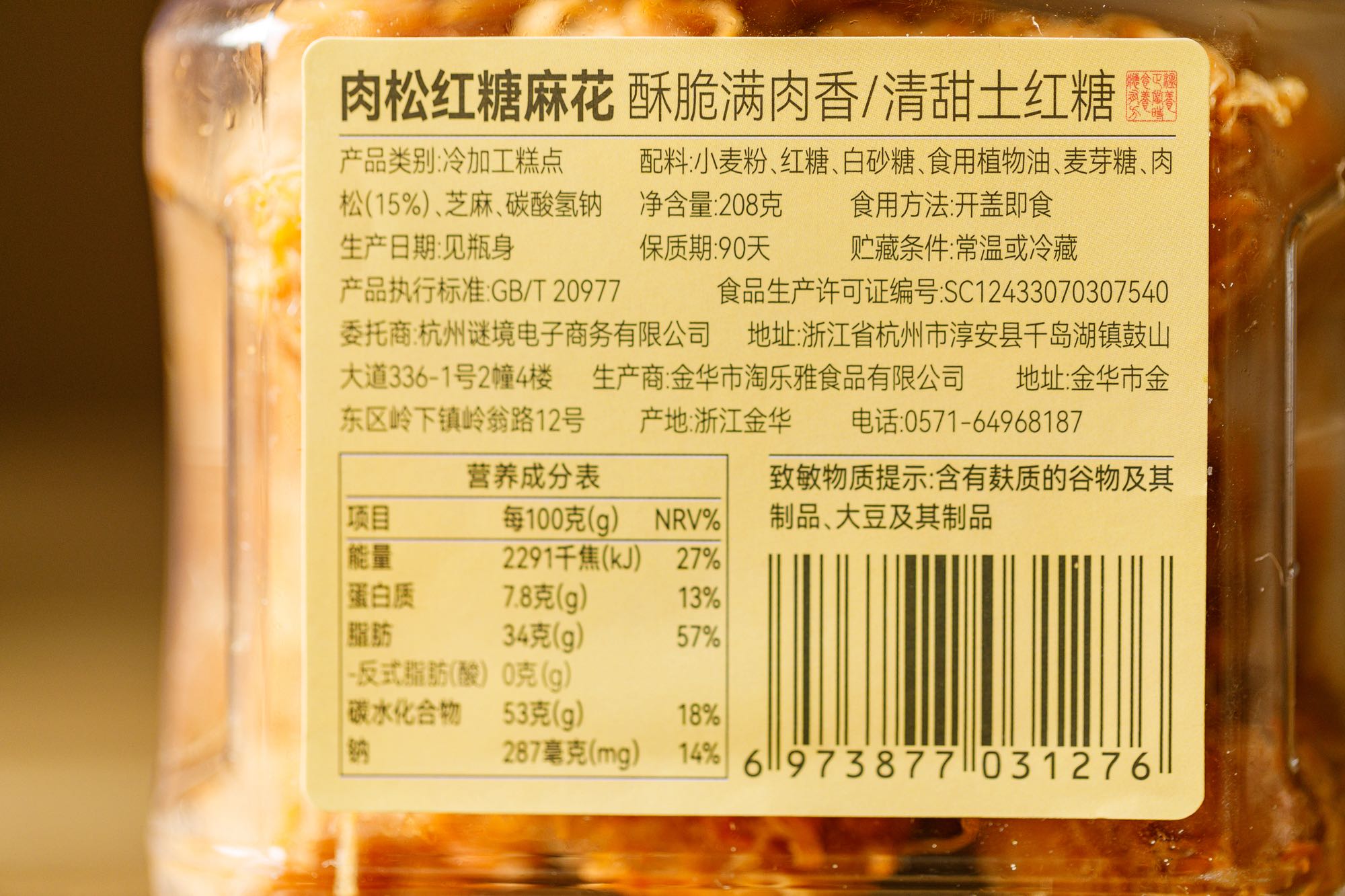 【配料表】小麦粉、红糖、白砂糖、食用植物油、麦芽糖、肉松、芝麻、碳酸氢钠