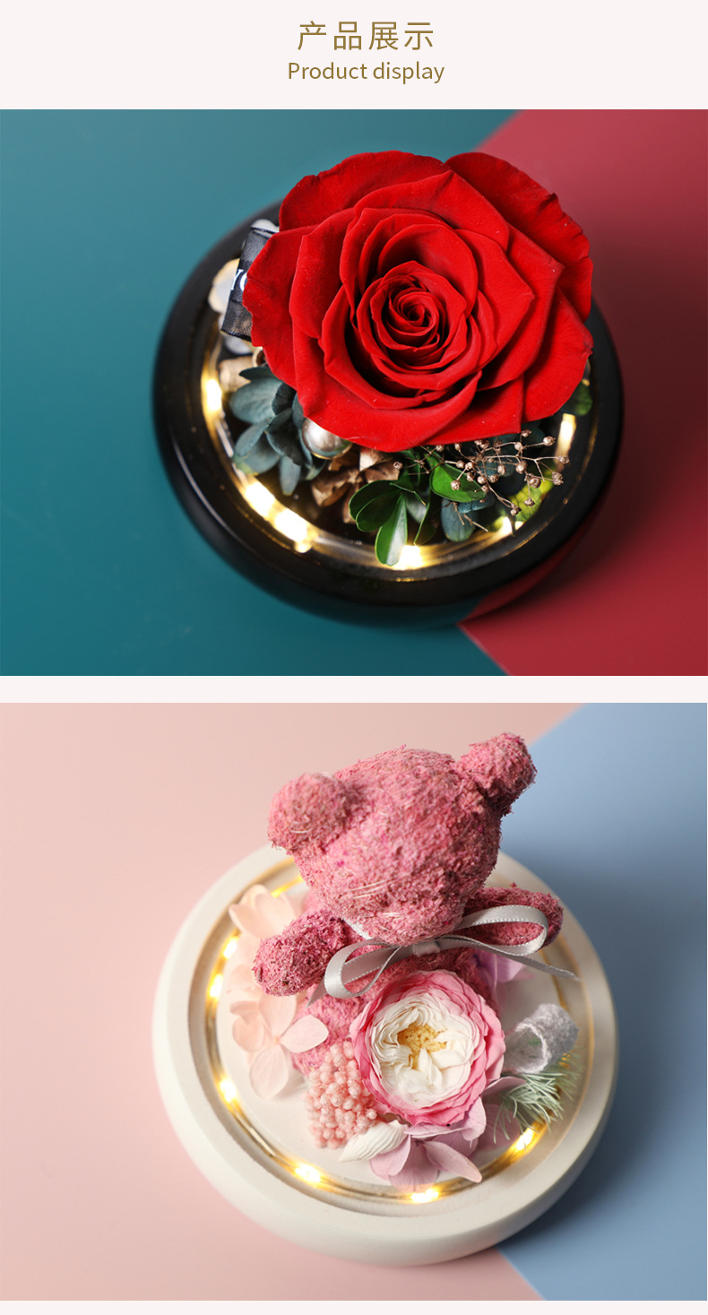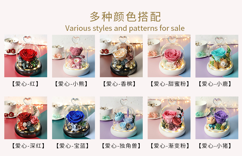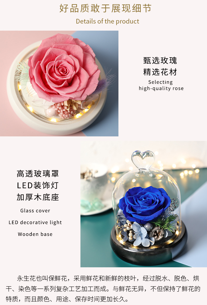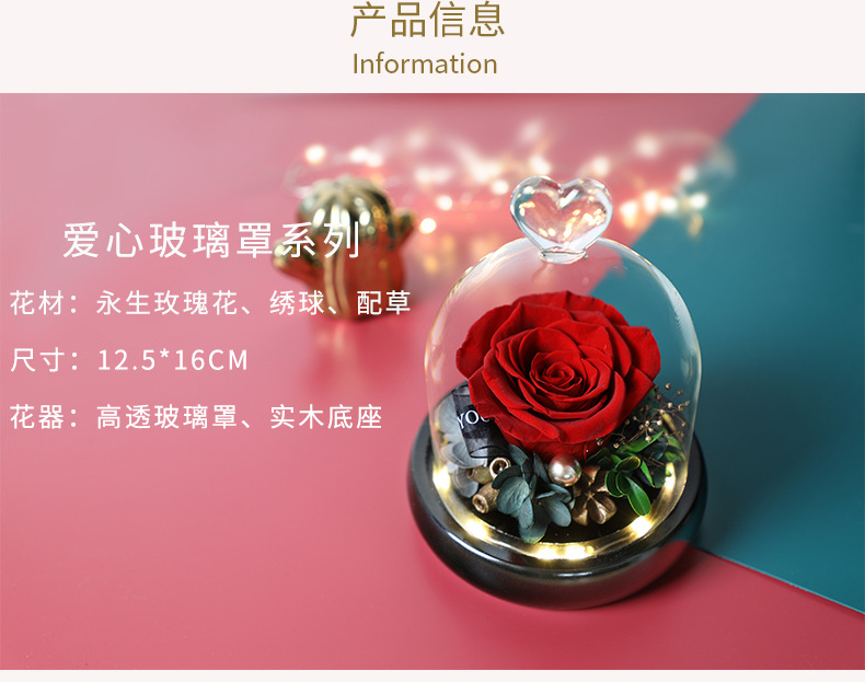 顺丰包邮 情人节礼物 爱心款永生花礼盒玻璃罩七夕情人节礼物闺蜜女友玫瑰花干花diy