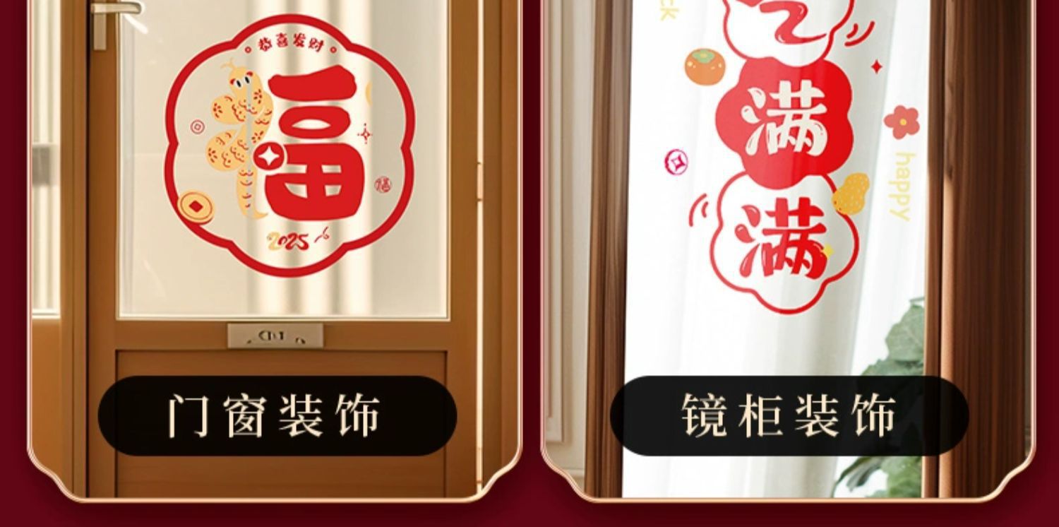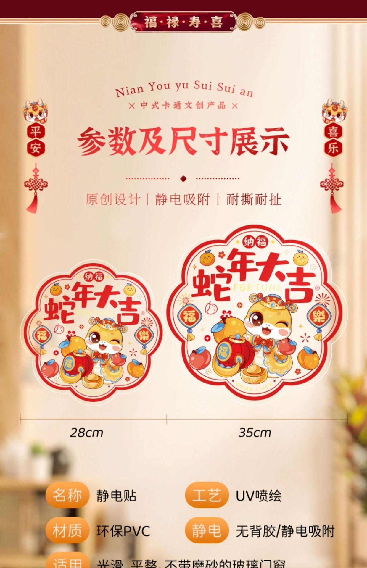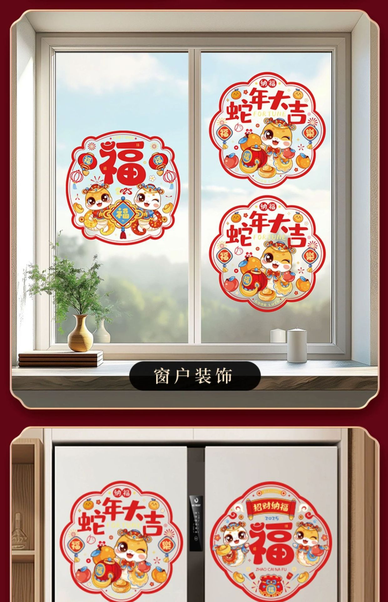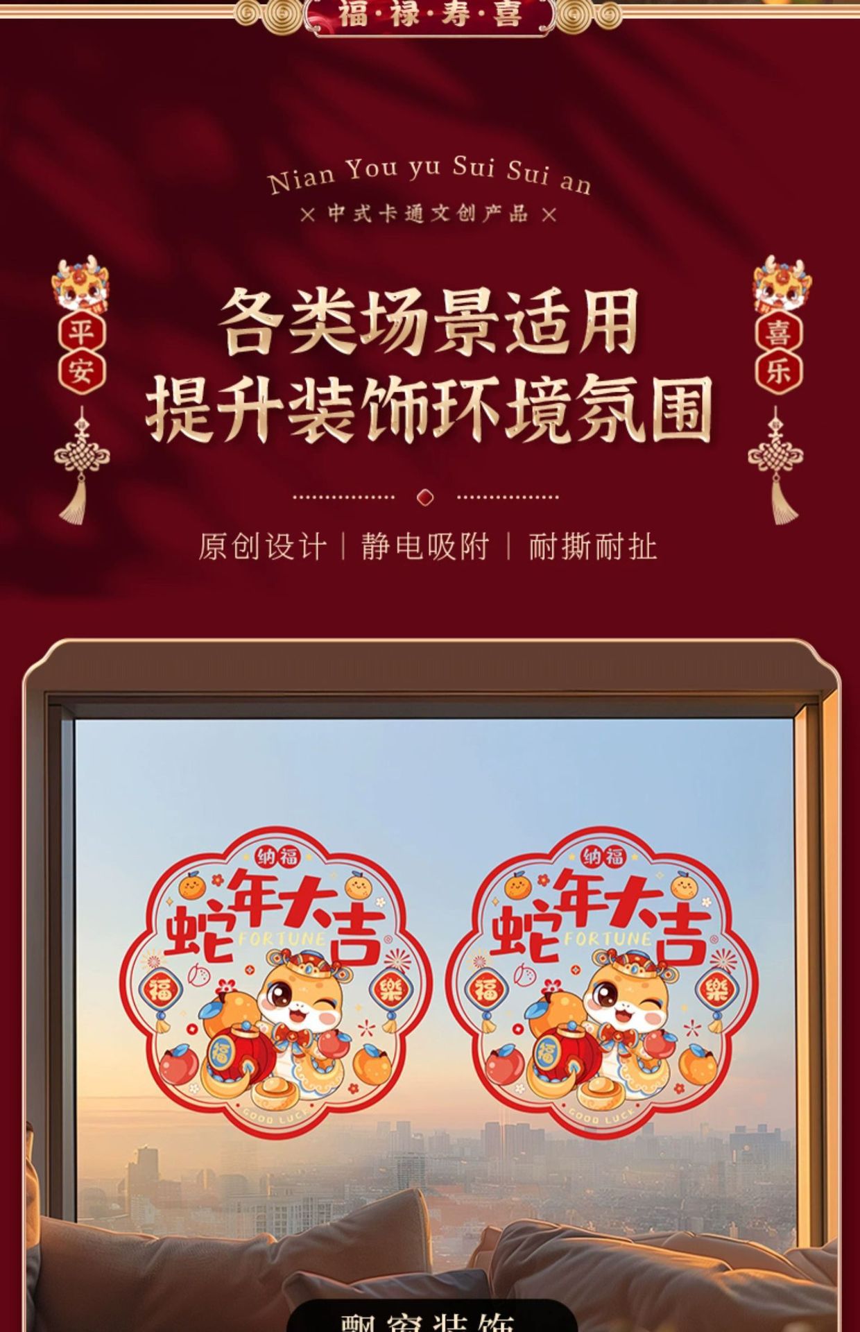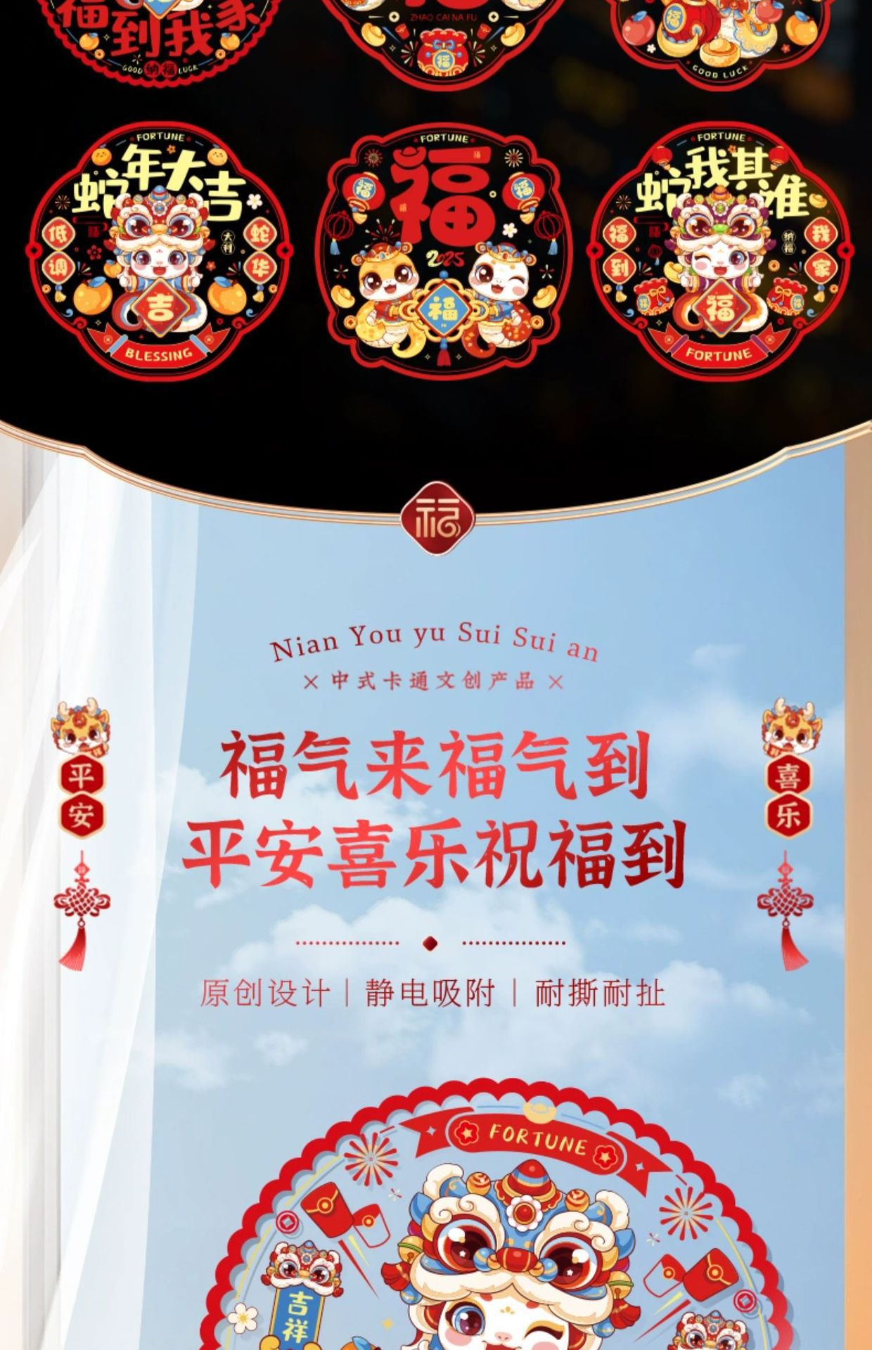 【拍1发12!2025蛇年厚款双面静电窗花】春节静电贴福字玻璃窗贴 不伤玻璃 可重复使用 新年剪纸生肖 春联大礼包