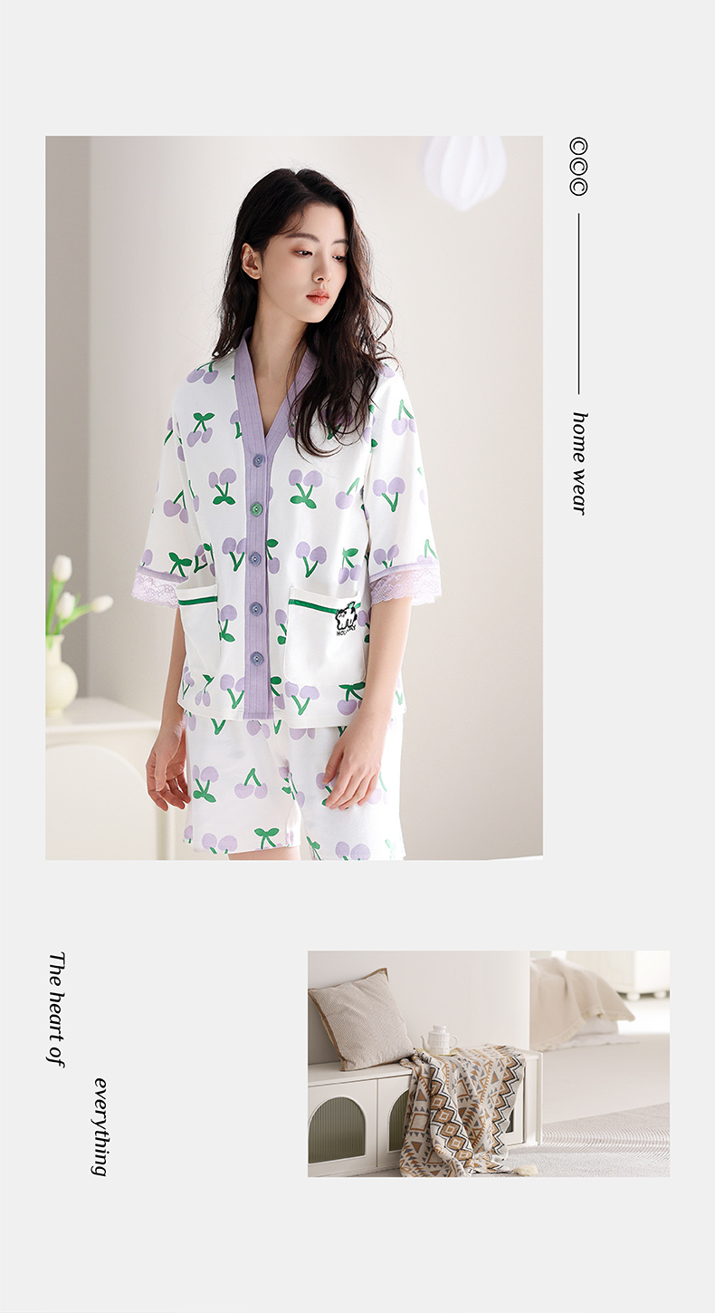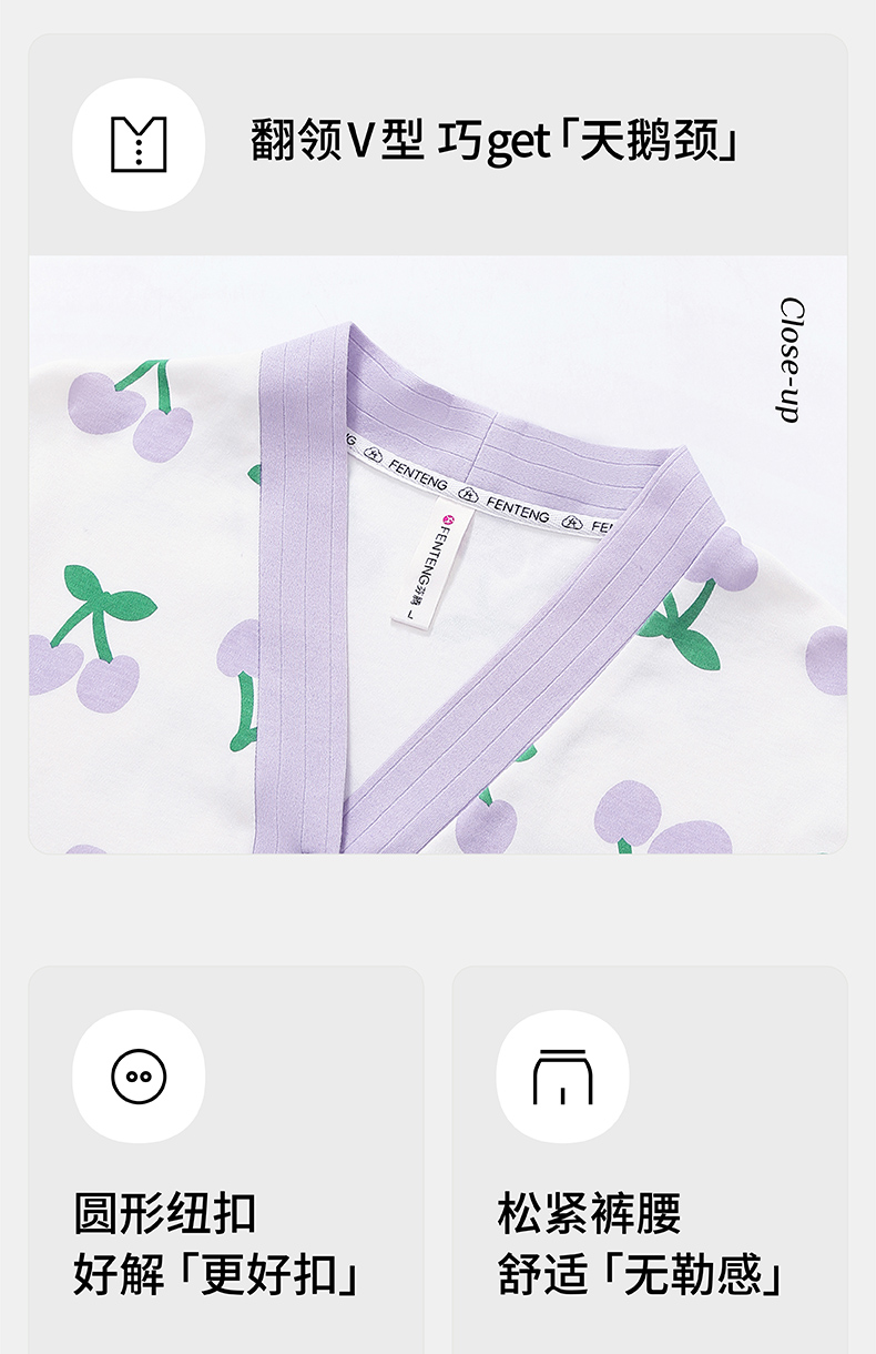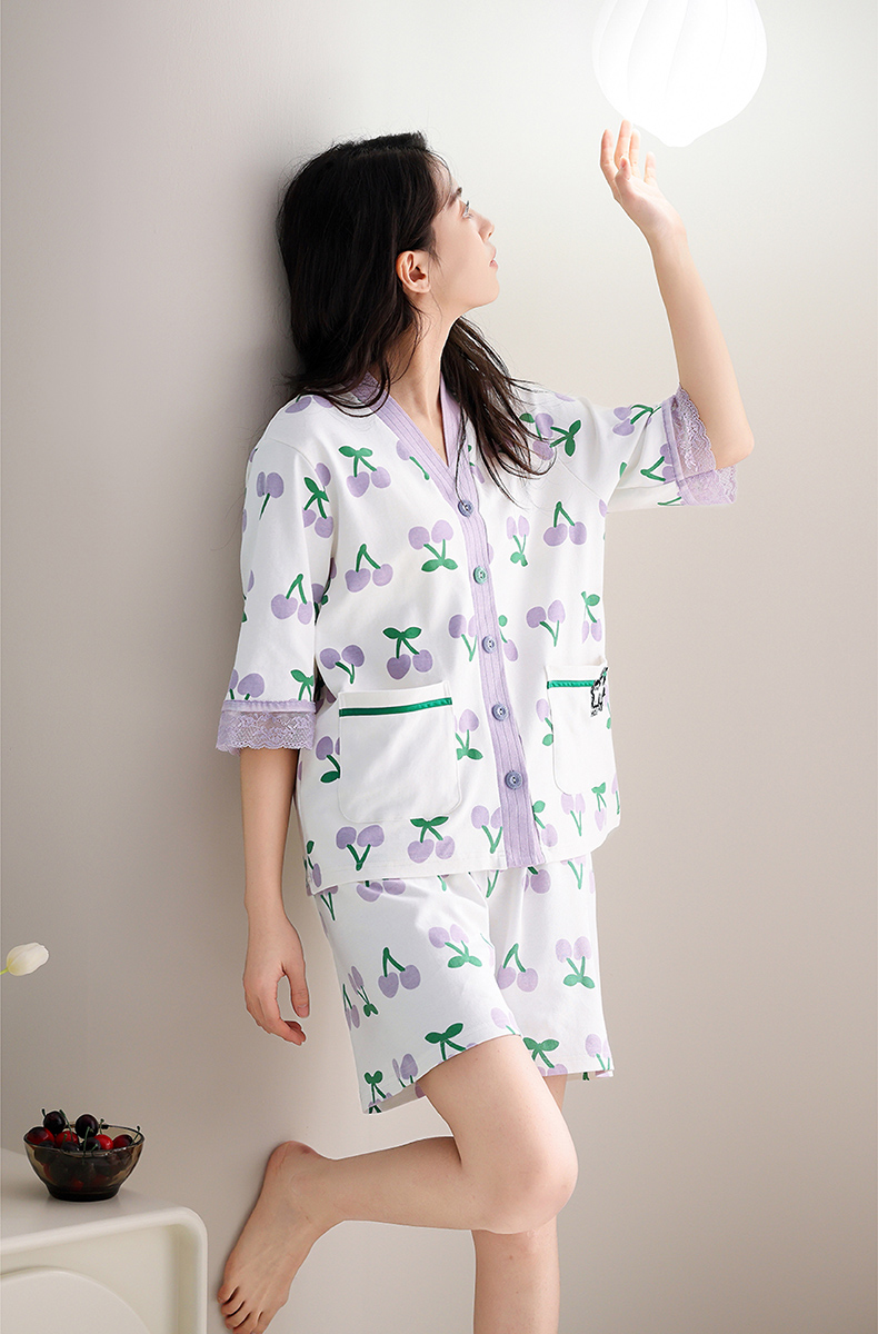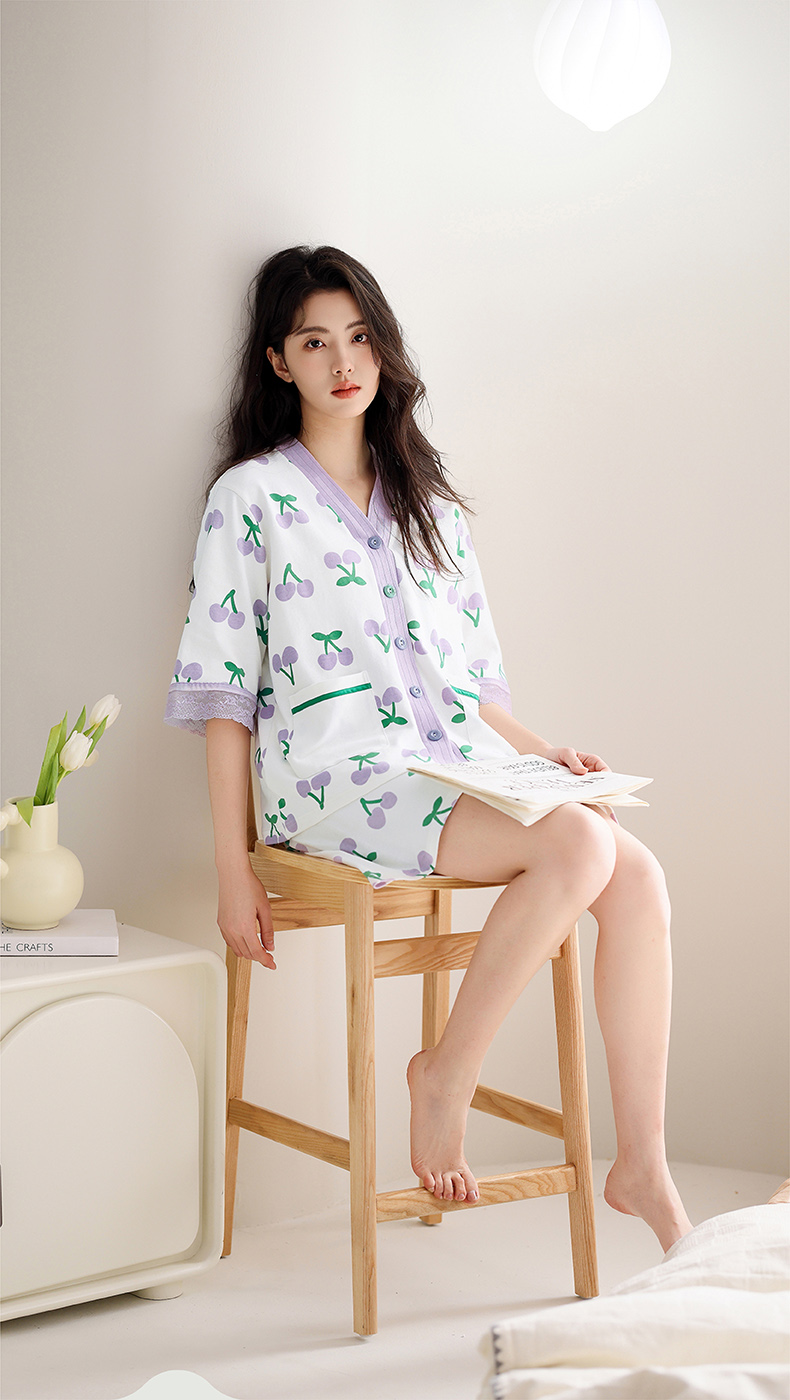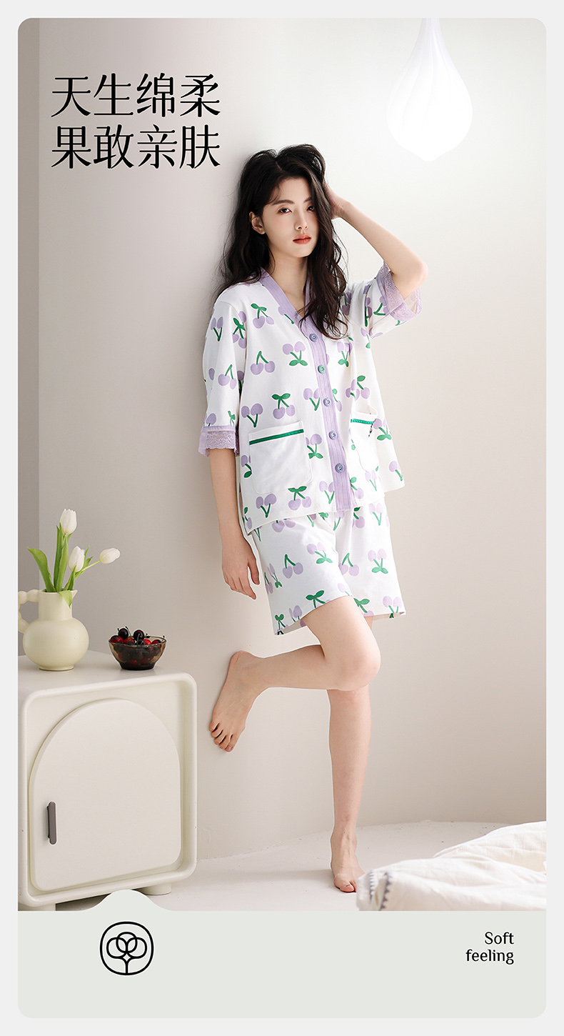 芬腾夏季100%纯棉薄款V领开衫短袖短裤套装 A-4537