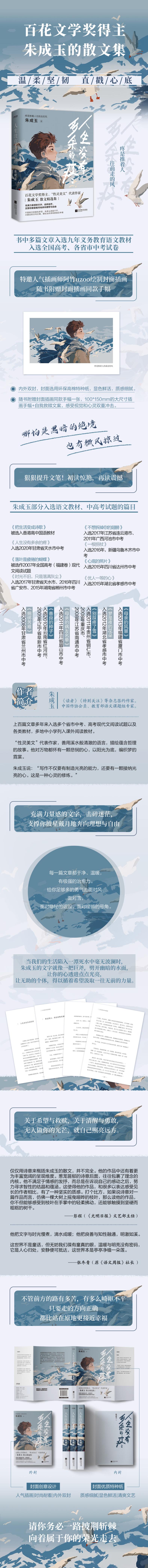1、百花散文奖得主、中考热点作家朱成玉散文作品精选书中文章入选九年义务教育语文教材,连续多年被选作各省市中高考语文现代阅读试题。全面提升中学生的文字水准和文学审美。2. 充满力量感的文字,击碎迷茫,支撑你披星戴月地奔向理想与自由朱成玉是一位热爱生活的人,对万物怀有悲悯之心,在每一篇作品中都呈现温暖的感动,以阳光打底,以爱心为线,用文字编织梦的霓裳。写作不仅要有制造光亮的能力,还要有一颗接纳光亮的心。这也是一种修炼。3. 接地气而又不失唯美,重抒情而又不乏哲思朱成玉的文字干净,朴实,温暖,有治愈性。文章都是撷取生活中一些平凡常见的事,在娓娓道来之余,稍加升华,就显示出文章与众不同的立意高度。朱成玉说,宝藏珍藏于人们的内心。任何人的生活圈子,只要你肯用心观察,都会是荡漾着无边春色的美景佳境。只是对那条曲折的小路,许多人没有寻到入口处罢了。让每个阅读他作品的人,不会感到寒凉而唯有温暖;让人用怜悯之心善待万物和生命;使人学会用光明的眼睛而不是灰暗的目光看世界。