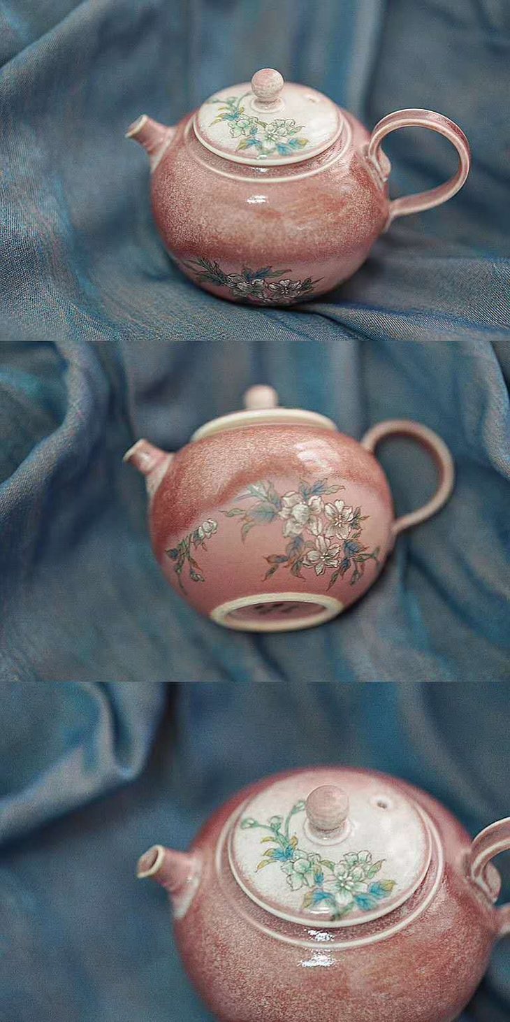 深浅流动的粉色来自于她独特的釉色——粉矿釉窑变形成的效果。这种窑内温度变化导致其釉色发生不确定性的自然变化使每一把壶形成了世上独一无二的纹理。晶莹似冰的透明质感来自它的另一种釉——冰裂纹釉。两种釉都是取自于矿石成分的景德镇原矿釉,烧成温度1330度。