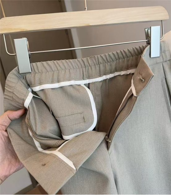 ✅ 细节处更是让人穿的放心 🔺侧缝前移设计,两侧斜插口袋,方便日常装携小物品。 🔺裤子内里做工走线对标西装裤走线工艺,都做了包边 🔺裤腰拉链+纽扣设计,内里还做了精致包边,更结实耐穿 🔺贴心的半松紧腰设计,前面西裤设计,后面松紧腰设计,显瘦与舒适并存