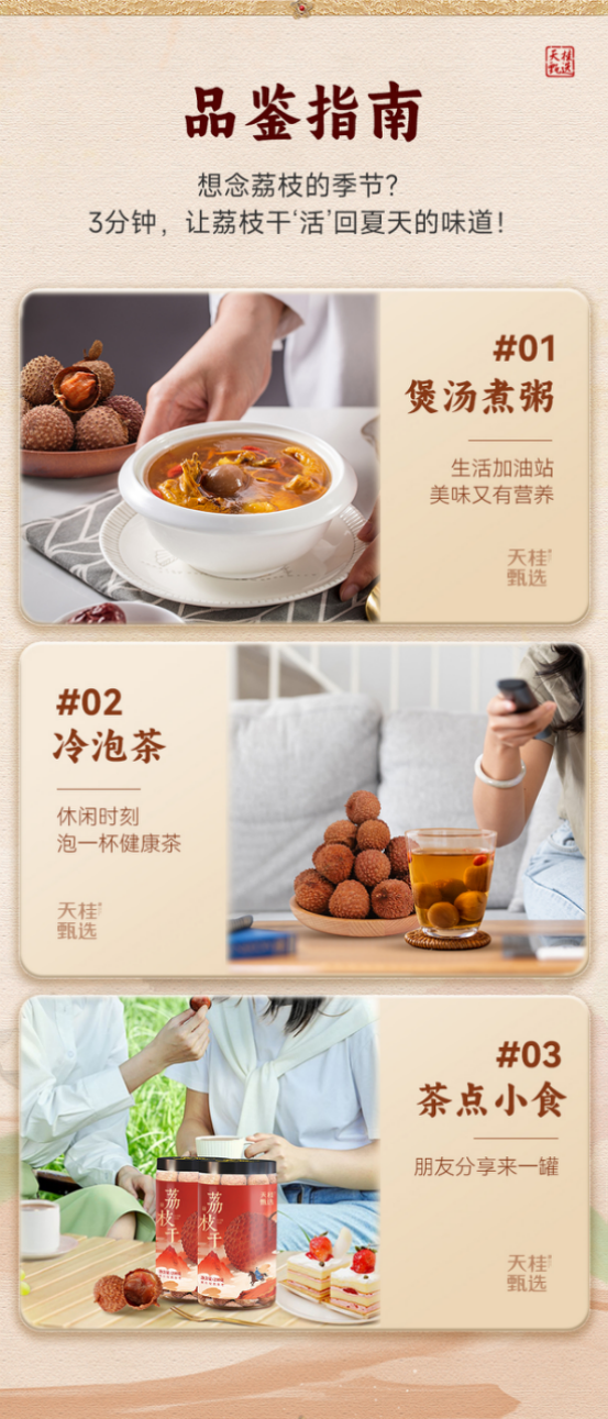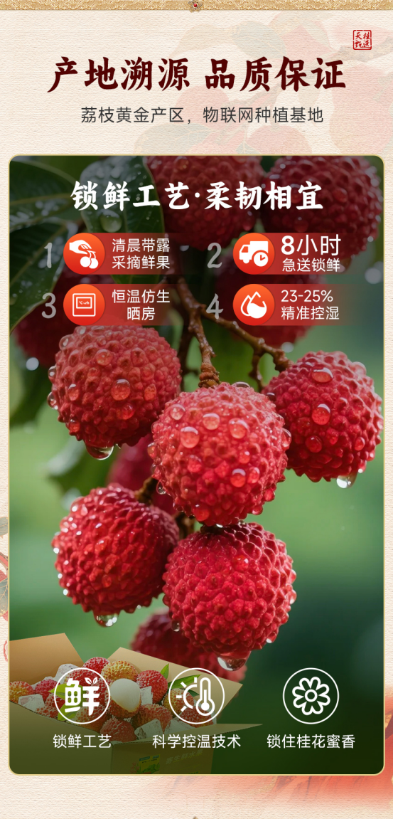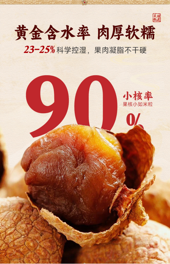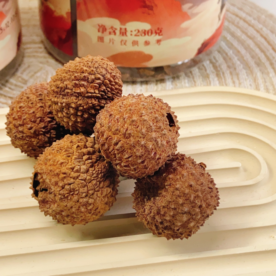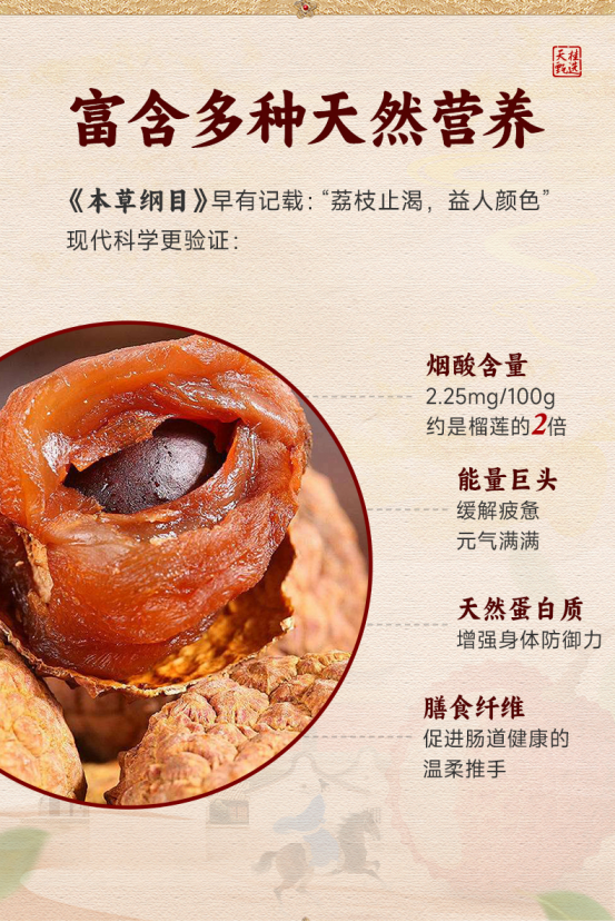 √ 荔枝干富含多种天然营养,本草纲目记载:荔枝止渴,益人益色,23-25%科学控湿,果肉凝脂不干硬,口感绝佳! √ 夏天吃荔枝,秋冬吃荔枝干;荔枝干在中医体系中被归为药食同源的补益品,其炮制方法和功效在古籍中有明确区分于鲜荔枝的记录。