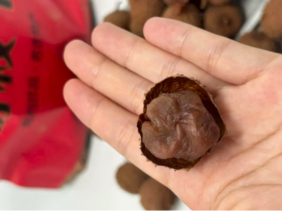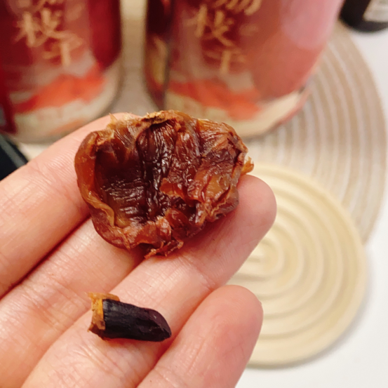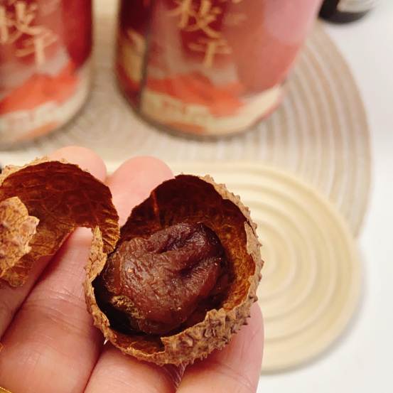 桂味是荔枝的一个品种,因有桂花味而得名。 做成荔枝干以后的桂味,呈半透明的诱人琥珀色。 当你剥开鲜红的外壳,清新的桂花香扑鼻而来,入口则是清甜多汁的果肉,这种风味使其备受推崇。 好果才能成就好果干! 咬开以后,令人惊讶的是! 它的果肉一点也不干,还有些许甜滋滋的蜜水,这是果肉烘焙后析出的。 回味中还带有桂花的清香。肉厚核小的荔枝干,别看它外表带着“刺”,看着硬。 但其实,烘干后它的壳是软的,不扎手。 轻轻一捏,壳就碎了,吃着很方便~