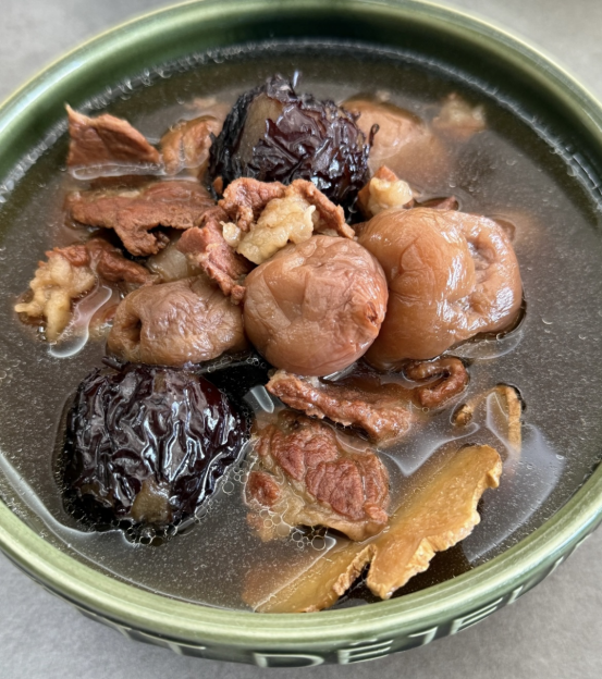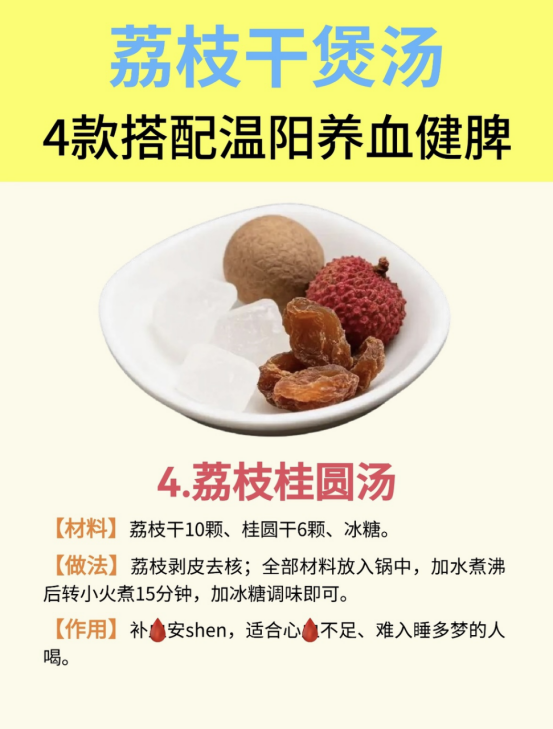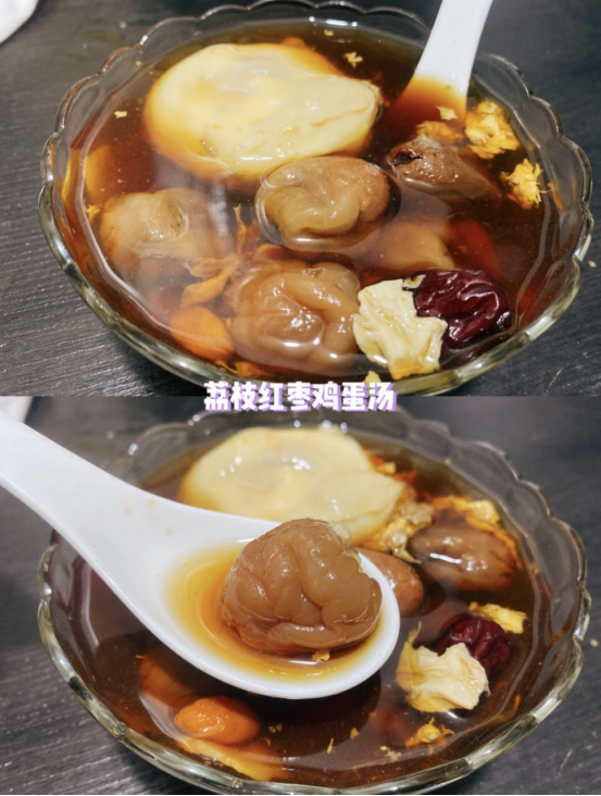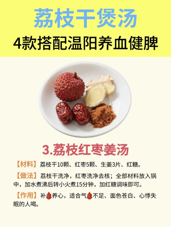 荔枝红枣姜汤 材料:荔枝干10颗、红枣5颗、生姜3片、红糖。 作用:补血养心,适合气血不足、面色苍白、心悸失眠的人喝。