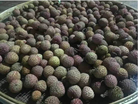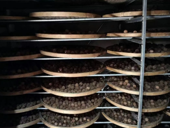 荔枝干的制作流程是 把经过精心筛选的桂味荔枝,清洗干净,码整齐后放入簸箕中,等待烘干。 延续传统烘干法,要将簸箕再次整齐放入特制的荔枝铁网中。 烘荔枝干的火候是很讲究,需要十几年的经验才行。 采用整条荔枝柴,把握火候很重要,火太旺会将荔枝干烘焦,火太小,温度不够,荔枝干的水分难以烘干。 在烘的过程中,因为炉子温度不是很均匀,还需要把簸箕里的荔枝互换位置,以达到所在簸箕荔枝干效果都烘得差不多。