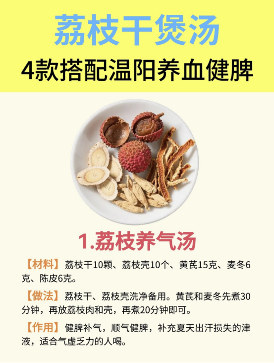 推荐几款 荔枝干煲汤 补气养血靓汤做法: 荔枝养气汤 材料:荔枝干10颗、荔枝皮10个、黄芪15克、麦冬6克、陈皮6克。 作用:养血健脾,适合脾虚食欲不振、消化不好、难入睡多梦的人喝。