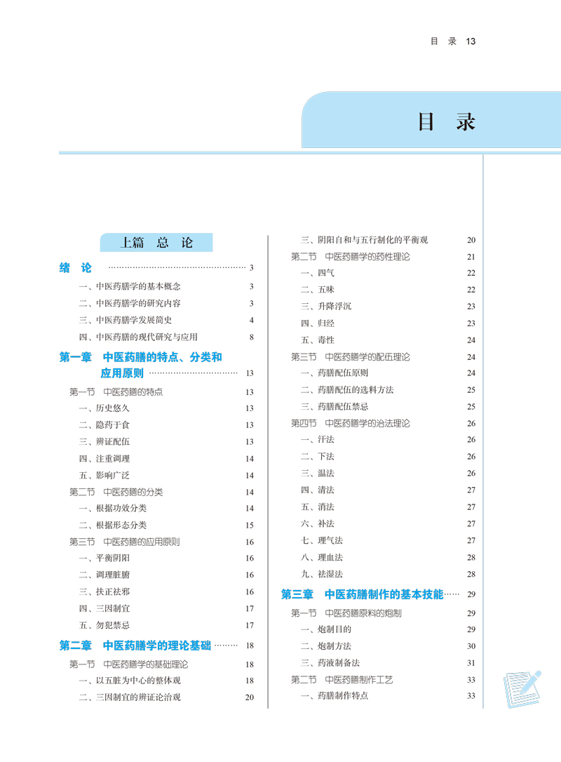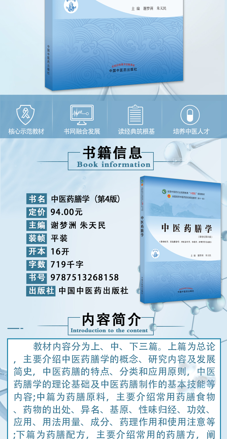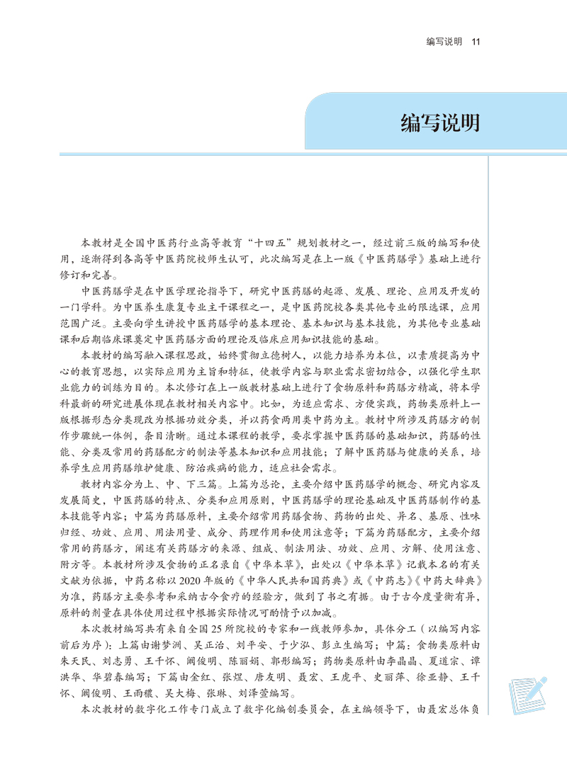 教材内容分为上、中、下三篇。上篇为总论,主要介绍中医药膳学的概念、研究内容及发展简史,中医药膳的特点、分类和应用原则,中医药膳学的理论基础及中医药膳制作的基本技能等内容;中篇为药膳原料,主要介绍常用药膳食物、药物的出处、异名、基原、性味归经、功效、应用、用法用量、成分、药理作用和使用注意等;下篇为药膳配方,主要介绍常用的药膳方,阐述有关药膳方的来源、组成、制法用法、功效、应用、方解、使用注意、附方等。