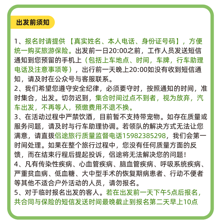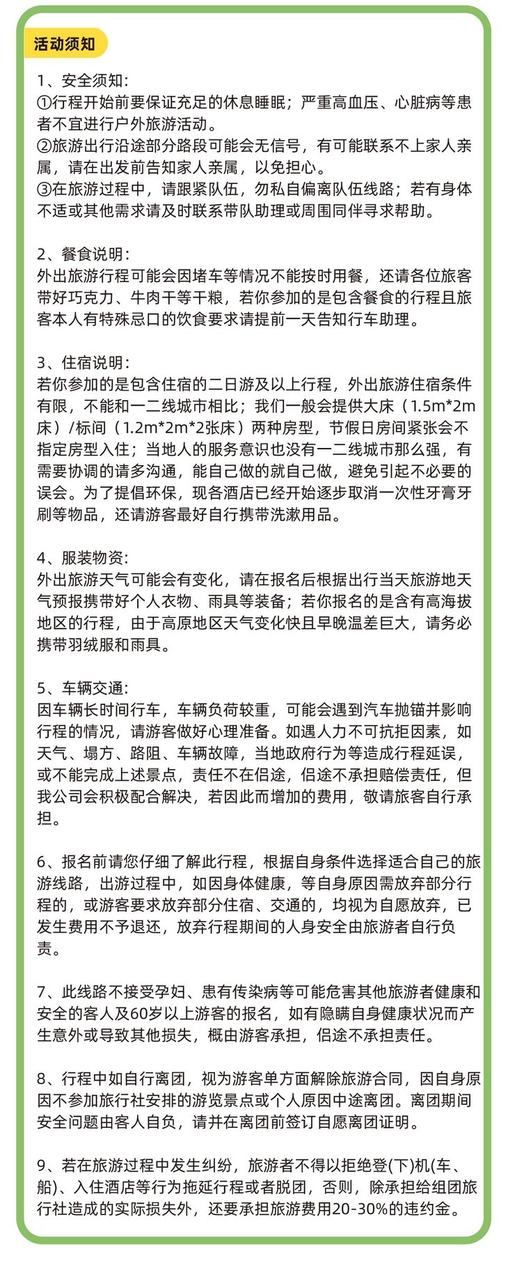 | 具体集合时间以领队通知为准;统一集合点,迟到超过5分钟,视为放弃,不退不改不延期 | |