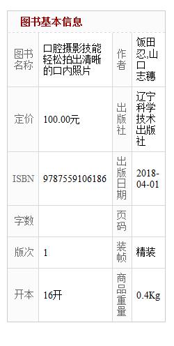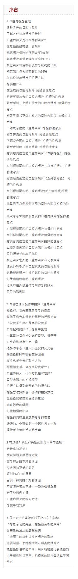 本书从照相器材、患者体位、拍摄光线、常规病例存档拍摄方案、局部特写、照片存储、照片加工等方面进行详细讲解,图文并茂,读者可以根据书中的演示图片和讲解自学。本书内容浅显易懂,适合从业的护士和刚入行的口腔医生学习。 n |