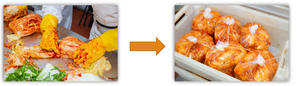 在专业机器拌酱使其入味后,再经过人工腌制:把白菜的每一层叶片上抹上辣酱,所有的白菜均匀涂抹好辣酱后,再把之前拌好的葱段放入辣白菜中,用手抓匀,最后装袋保鲜,进行适当时间的封存。