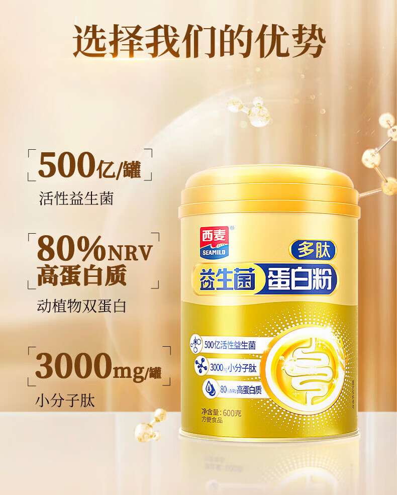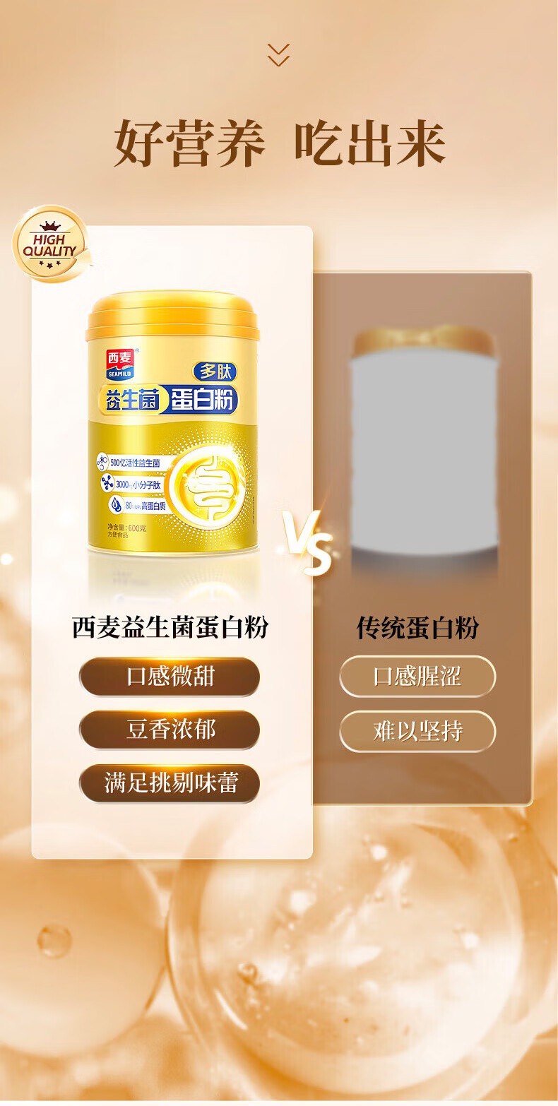 西麦益生菌蛋白质粉(礼盒装,内含2桶),含有丰富活性益生菌,采用动植物双蛋白配方,富含小分子肽,高营养美食,冲泡方便,随时随地补充蛋白质,大品牌,质量有保证,送礼有面子D