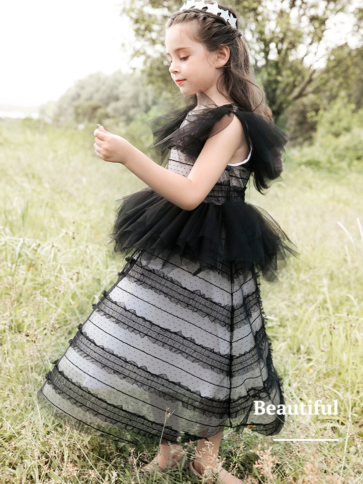 pureshare 蓬纱馆 春儿童黑色时尚拼接蕾丝长裙女宝宝短袖连衣裙-黑色拼接连衣裙