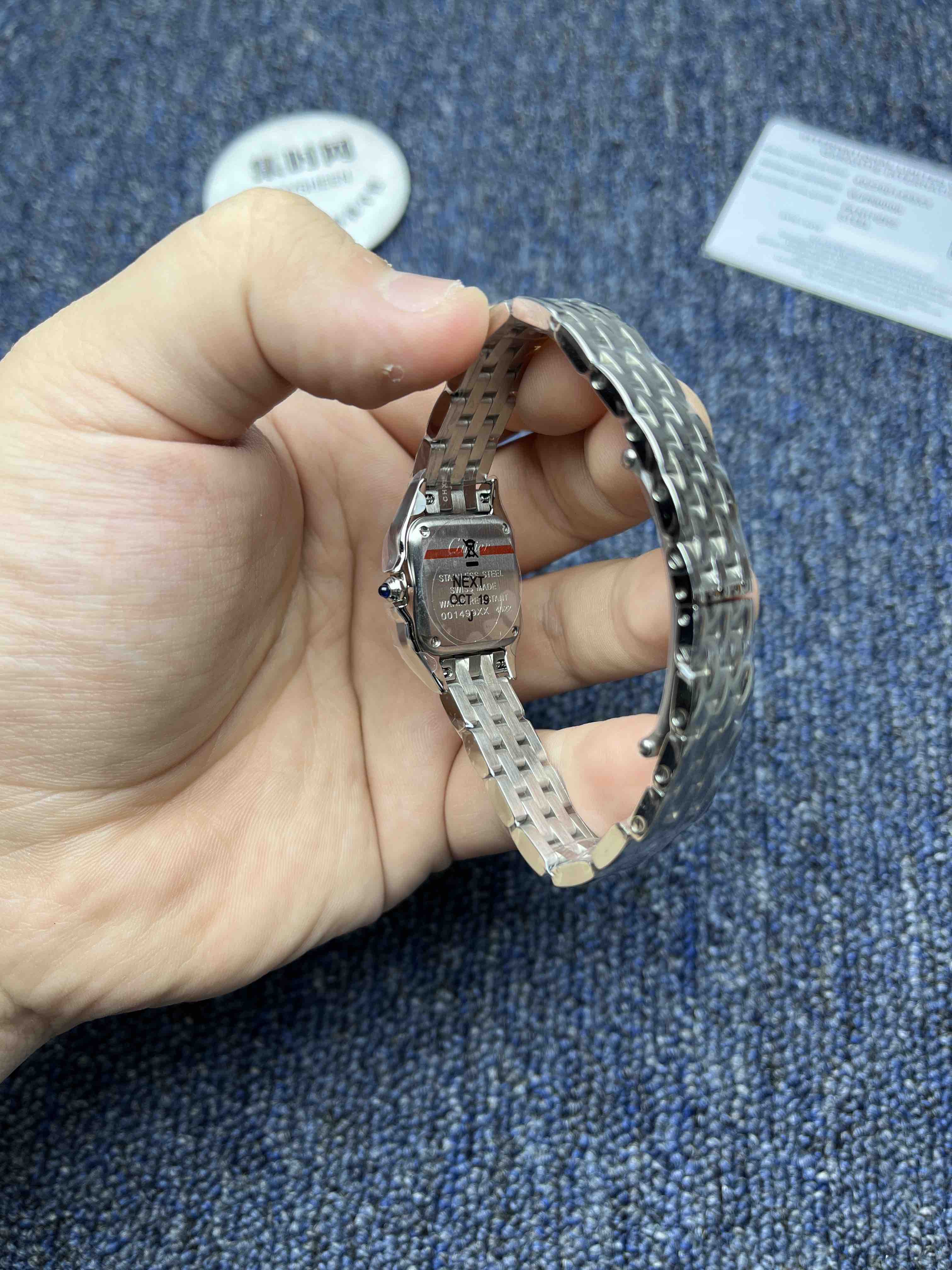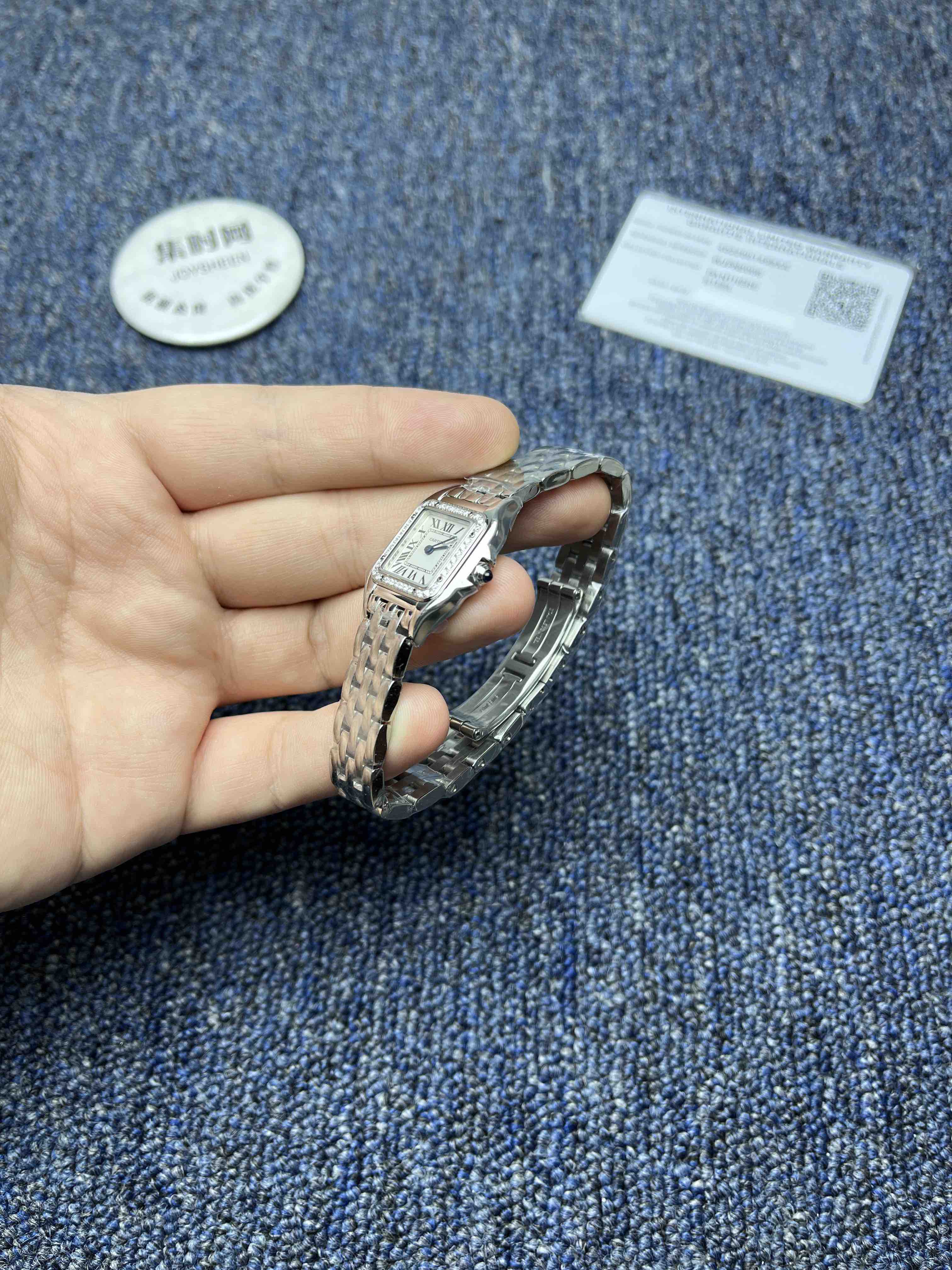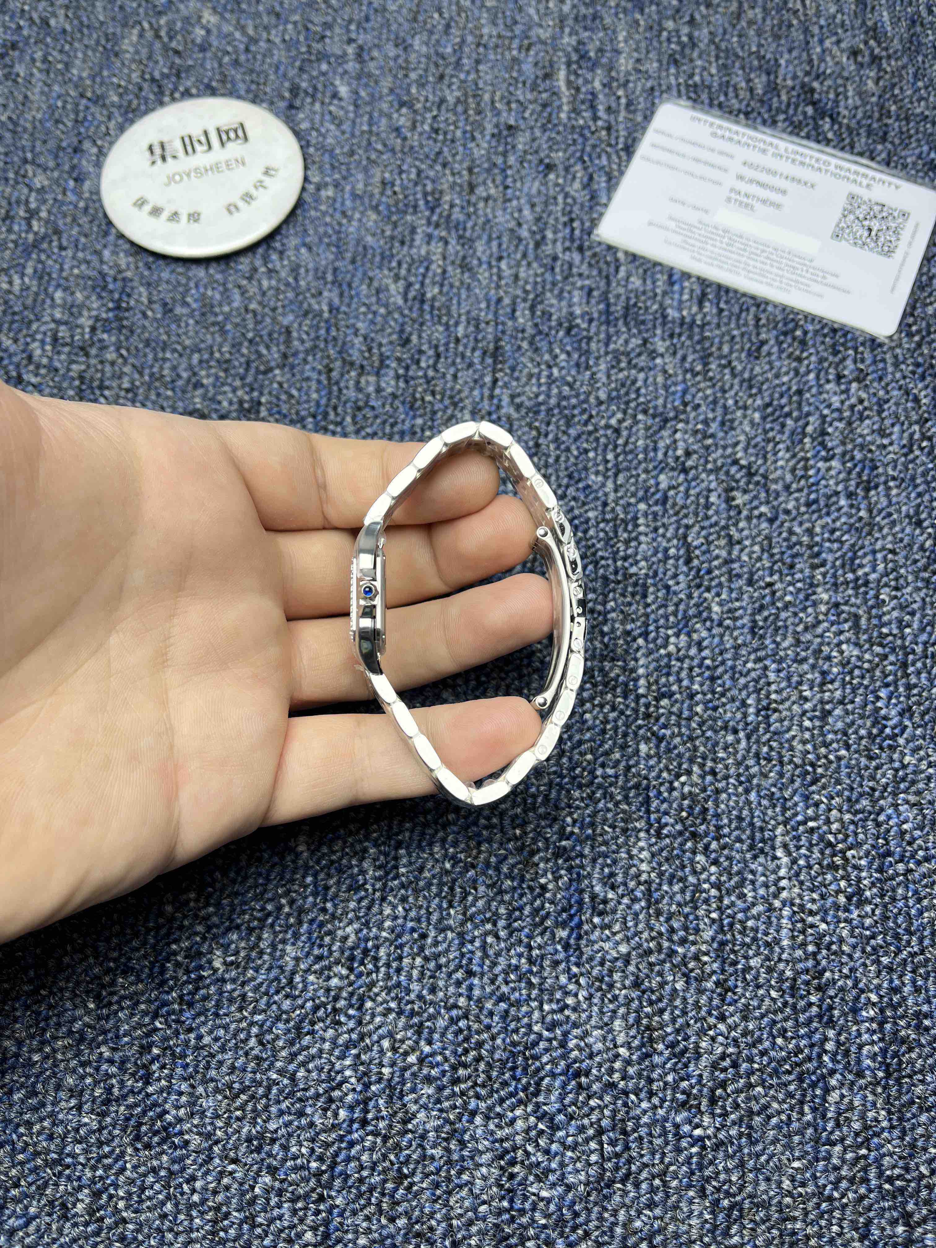 卡地亚Panthère de Cartier猎豹系列女士腕表 小号22X30mm 使用方形双层表壳看起来更加立体大方,更加突显出腕表的优雅与经典。白色表盘上,卡地亚式时标设计更为腕表注入一份品牌的 魅力。蓝色中央时分针宛若在两只随时间而舞动的精灵,为整款腕表再填华彩。 与传统卡地亚腕表一样,表冠上镶嵌有一颗具有品牌代表性的蓝宝石,向观表者展现高级钟表珠宝品牌卡地亚的独有魅力。表冠采用防滑纹理设计,方便对腕表的调试。两边的表冠护桥也为腕表增添了一份安全防护。 相比背透设计,密底工艺可以保障腕表机芯安全性。灵活自如的链节表链是腕表另一大亮点,处处都散发着曜目而饱满的光芒,从上到下都充满着独特的优雅奢华气质。