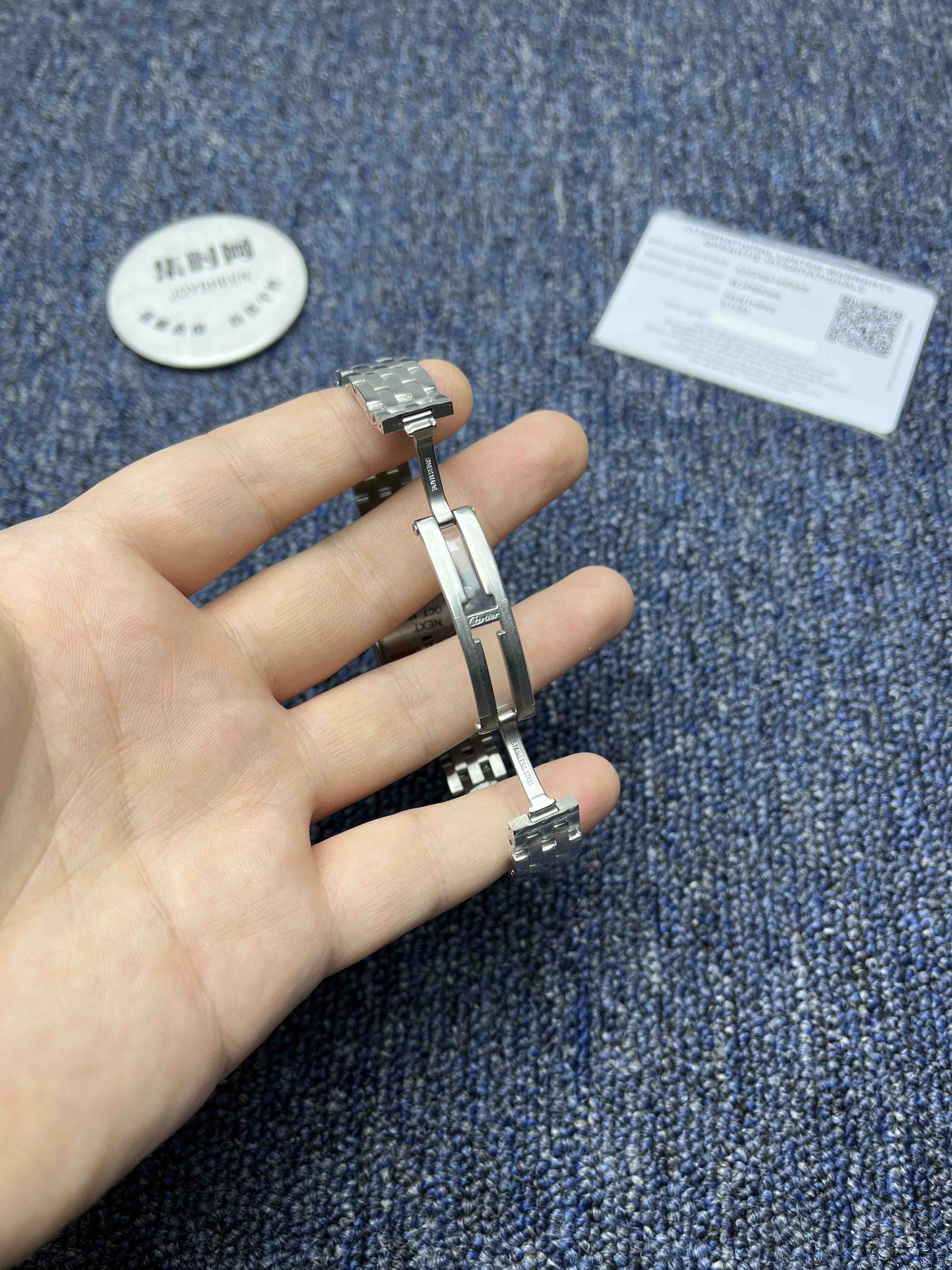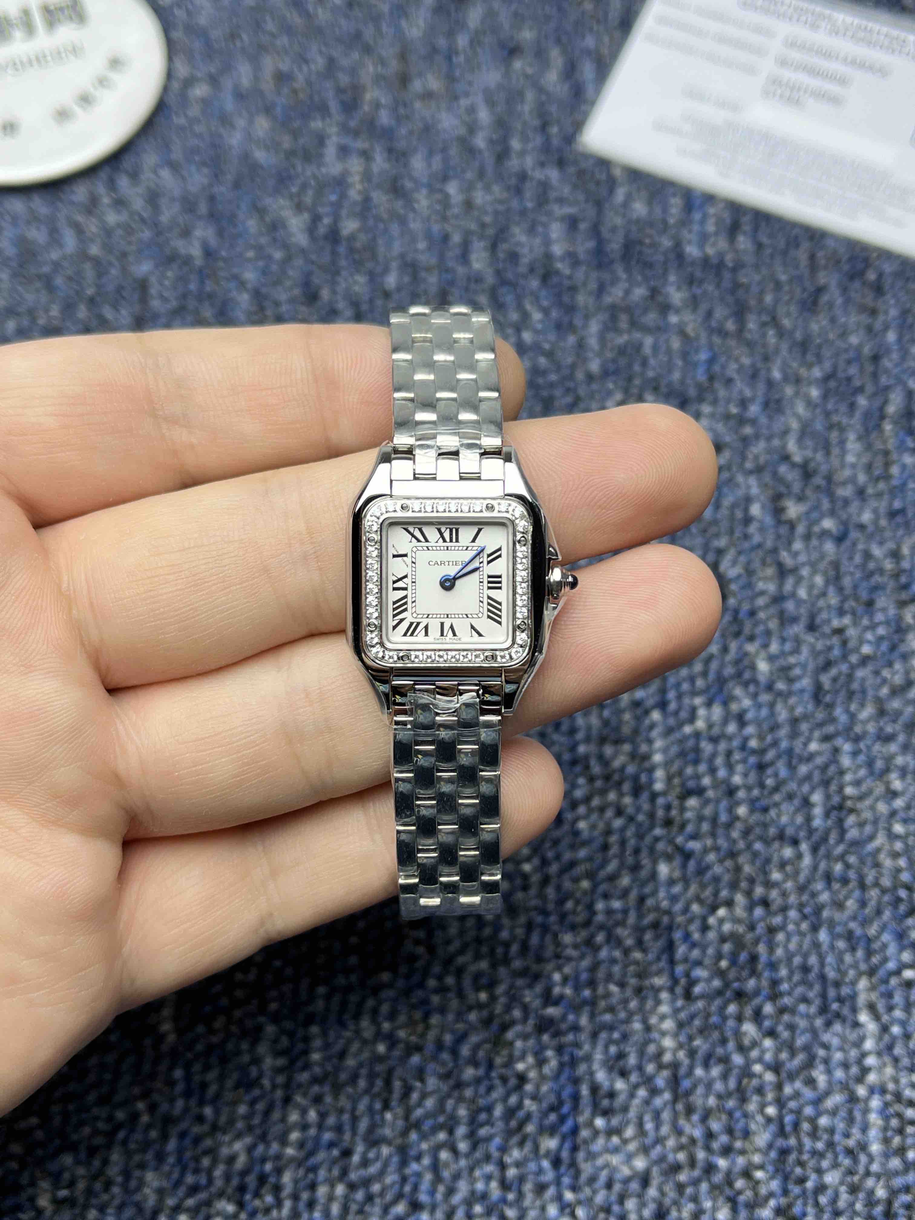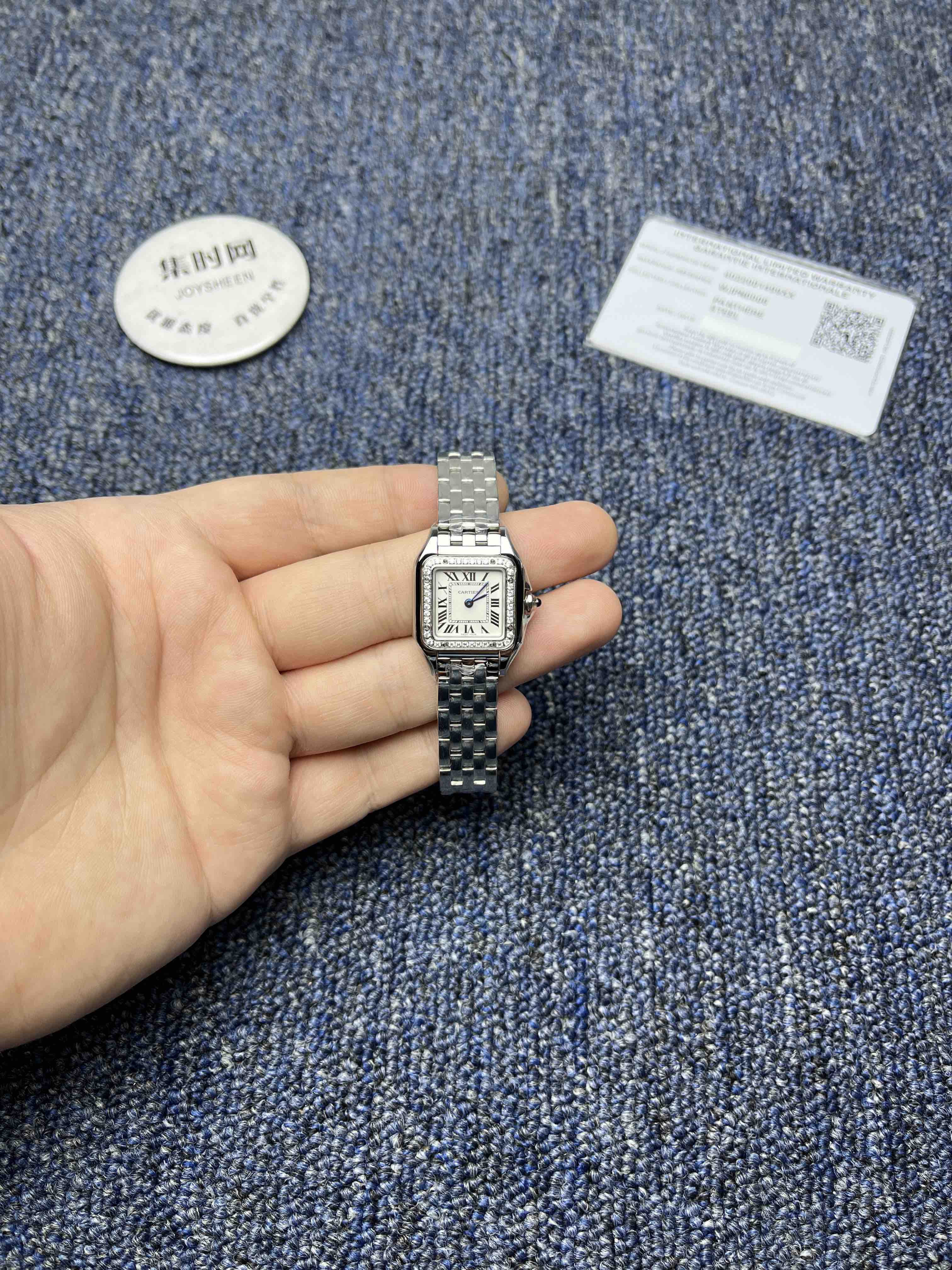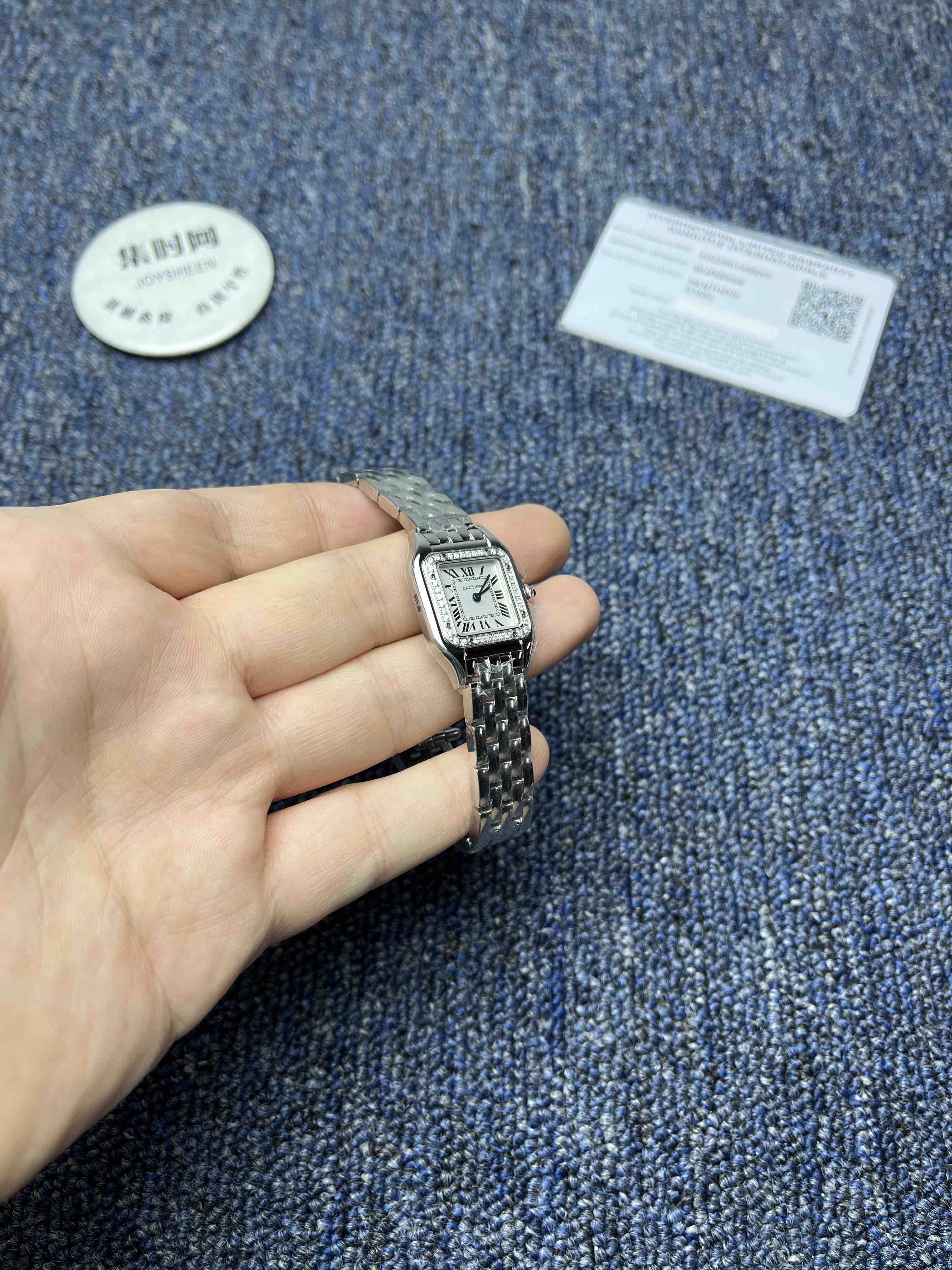 卡地亚Panthère de Cartier猎豹系列女士腕表 小号22X30mm 使用方形双层表壳看起来更加立体大方,更加突显出腕表的优雅与经典。白色表盘上,卡地亚式时标设计更为腕表注入一份品牌的 魅力。蓝色中央时分针宛若在两只随时间而舞动的精灵,为整款腕表再填华彩。 与传统卡地亚腕表一样,表冠上镶嵌有一颗具有品牌代表性的蓝宝石,向观表者展现高级钟表珠宝品牌卡地亚的独有魅力。表冠采用防滑纹理设计,方便对腕表的调试。两边的表冠护桥也为腕表增添了一份安全防护。 相比背透设计,密底工艺可以保障腕表机芯安全性。灵活自如的链节表链是腕表另一大亮点,处处都散发着曜目而饱满的光芒,从上到下都充满着独特的优雅奢华气质。