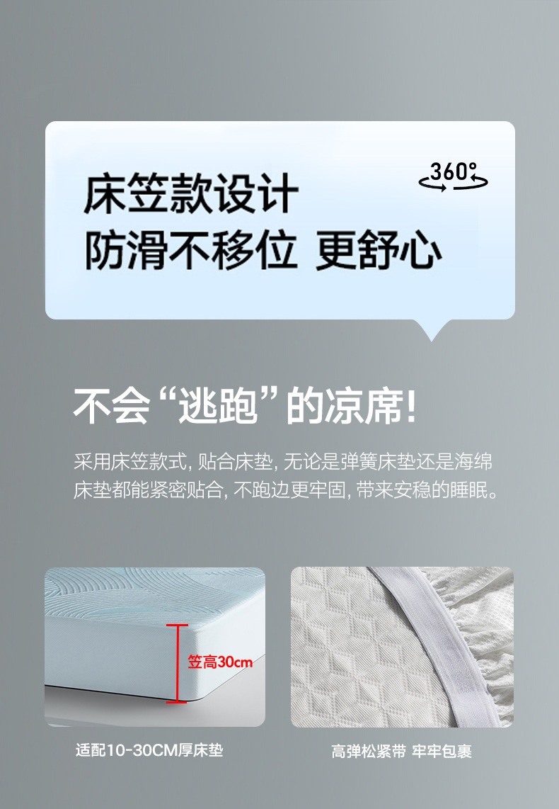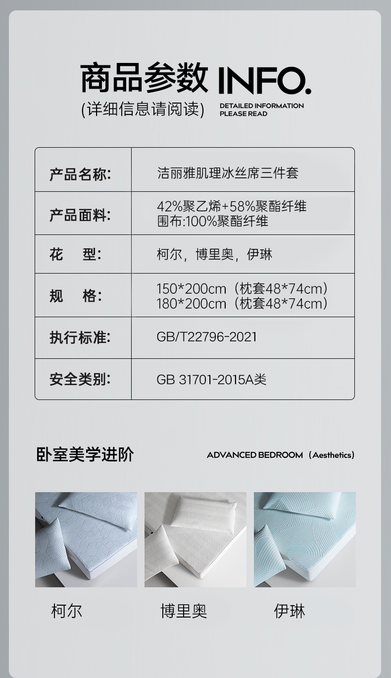 洁丽雅肌理冰丝席三件套透气凉感罩套家用防滑宿舍寝室