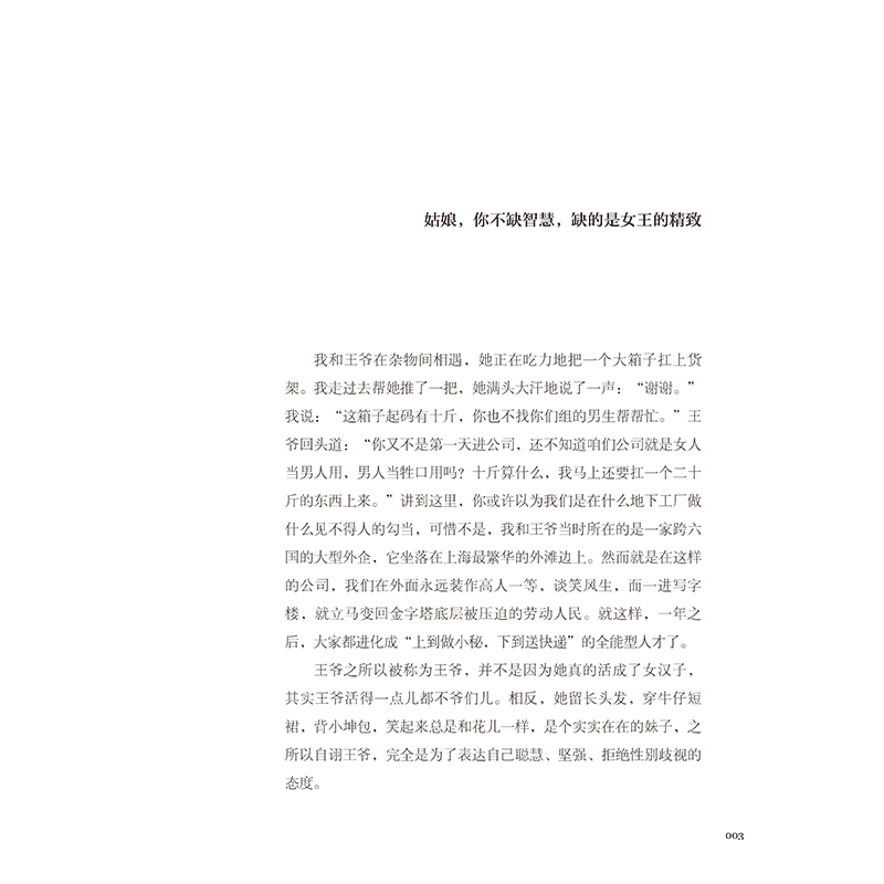 我一下想到了王爷,对,就是我在这本书里花了大量篇幅去讲述的一个女生。她是我辞职创业前的一位同事,果敢,倔强,有想法,而且时不时冒出几句金句,让人醍醐灌顶。她姓王,人又霸